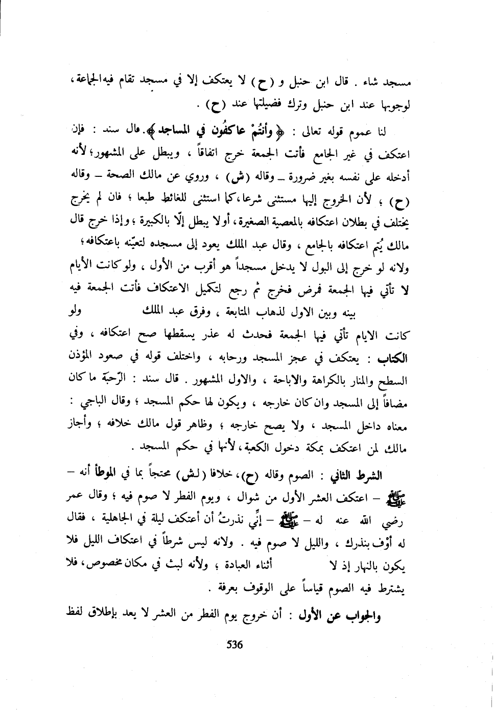 مَسْجِدٍ شَاءَ قَالَ ابْنُ حَنْبَلٍ وَ (ح) لَا يَعْتَكِفُ إِلَّا فِي مَسْجِدٍ تُقَامُ فِيهِ الْجَمَاعَةُ لِوُجُوبِهَا عِنْدَ ابْنِ حَنْبَلٍ وَتَرْكِ فَضِيلَتِهَا عِنْدَ (ح) لَنَا عُمُومُ قَوْله تَعَالَى {وَأَنْتُمْ عاكفون فِي الْمَسَاجِد} قَالَ سَنَدٌ فَإِنِ اعْتَكَفَ فِي غَيْرِ الْجَامِعِ فَأَتَتِ الْجُمُعَةُ خَرَجَ اتِّفَاقًا وَيَبْطُلُ عَلَى الْمَشْهُورِ لِأَنَّهُ أَدْخَلَهُ عَلَى نَفْسِهِ بِغَيْرِ ضَرُورَةٍ وَقَالَهُ (ش) وَرُوِيَ عَنْ مَالِكٍ الصِّحَّةُ وَقَالَهُ (ح) لِأَنَّ الْخُرُوجَ إِلَيْهَا مُسْتَثْنًى شَرْعًا كَمَا اسْتُثْنِيَ لِلْغَائِطِ طَبْعًا فَإِنْ لَمْ يَخْرُجْ يُخْتَلَفْ فِي بُطْلَانِ اعْتِكَافِهِ بِالْمَعْصِيَةِ الصَّغِيرَةِ أَوْ لَا يَبْطُلُ إِلَّا بِالْكَبِيرَةِ وَإِذَا خَرَجَ قَالَ مَالِكٌ يَتِمُّ اعْتِكَافُهُ بِالْجَامِعِ وَقَالَ عَبْدُ الْمَلِكِ يَعُودُ إِلَى مَسْجِدِهِ لِتَعَيُّنِهِ بِاعْتِكَافِهِ وَلِأَنَّهُ لَوْ خَرَجَ إِلَى الْبَوْلِ لَا يَدْخُلُ مَسْجِدًا هُوَ أَقْرَبُ مِنَ الْأَوَّلِ وَلَوْ كَانَتِ الْأَيَّامُ لَا تَأْتِي فِيهَا الْجُمُعَةُ فَمَرِضَ فَخَرَجَ ثُمَّ رَجَعَ لِتَكْمِيلِ الِاعْتِكَافِ فَأَتَتِ الْجُمُعَةُ فِيهِ بَيْنَهُ وَبَيْنَ الْأَوَّلِ لِذَهَابِ الْمُتَابَعَةِ وَفَرَّقَ عَبْدُ الْمَلِكِ وَلَوْ كَانَتِ الْأَيَّامُ تَأْتِي فِيهَا الْجُمُعَةُ فَحَدَثَ لَهُ عُذْرٌ يُسْقِطُهَا صَحَّ اعْتِكَافُهُ وَفِي الْكِتَابِ يَعْتَكِفُ فِي عَجُزِ الْمَسْجِدِ وَرِحَابِهِ وَاخْتَلَفَ قَوْلُهُ فِي صُعُودِ الْمُؤَذِّنِ السَّطْحَ وَالْمَنَارَ بِالْكَرَاهَةِ وَالْإِبَاحَةِ وَالْأَوَّلُ الْمَشْهُورُ قَالَ سَنَدٌ الرَّحَبَةُ مَا كَانَ مُضَافًا إِلَى الْمَسْجِدِ وَإِنْ كَانَ خَارِجَهُ وَيَكُونُ لَهَا حُكْمُ الْمَسْجِدِ وَقَالَ الْبَاجِيُّ مَعْنَاهُ دَاخِلَ الْمَسْجِدِ وَلَا يَصِحُّ خَارِجَهُ وَظَاهِرُ قَوْلِ مَالِكٍ خِلَافُهُ وَأَجَازَ مَالِكٌ لِمَنِ اعْتَكَفَ بِمَكَّةَ دُخُولَ الْكَعْبَةِ لِأَنَّهَا فِي حكم الْمَسْجِد الشَّرْط الثَّانِي الصَّوْم وَقَالَهُ (ح) خِلَافًا (لِ ش) مُحْتَجًّا بِمَا فِي الْمُوَطَّأِ أَنَّهُ - صَلَّى اللَّهُ عَلَيْهِ وَسَلَّم َ - اعْتَكَفَ الْعَشْرَ الْأُوَّلَ مِنْ شَوَّالٍ وَيَوْمُ الْفِطْرِ لَا صَوْمَ فِيهِ وَقَالَ عُمَرُ رَضِيَ اللَّهُ عَنهُ لَهُ - صَلَّى اللَّهُ عَلَيْهِ وَسَلَّم َ -