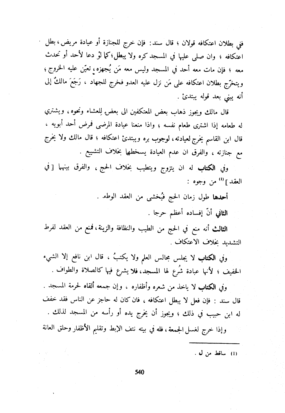 فَفِي بُطْلَانِ اعْتِكَافِهِ قَوْلَانِ قَالَ سَنَدٌ فَإِنْ خَرَجَ لِلْجِنَازَةِ أَوْ عِيَادَةِ مَرِيضٍ بَطَلَ اعْتِكَافُهُ وَإِنْ صَلَّى عَلَيْهَا فِي الْمَسْجِدِ كُرِهَ وَلَا يَبْطُلُ كَمَا لَوْ دَعَا لِأَحَدٍ أَوْ تَحَدَّثَ مَعَهُ فَإِنْ مَاتَ مَعَهُ أَحَدٌ فِي الْمَسْجِدِ وَلَيْسَ مَعَهُ مَنْ يُجَهِّزُهُ تَعَيَّنَ عَلَيْهِ الْخُرُوجُ وَيَتَخَرَّجُ بُطْلَانُ اعْتِكَافِهِ عَلَى مَنْ نَزَلَ عَلَيْهِ الْعَدُوُّ فَخَرَجَ لِلْجِهَادِ رَجَعَ مَالِكٌ إِلَى أَنَّهُ يَبْنِي بَعْدَ قَوْلِهِ يَبْتَدِئُ قَالَ مَالِكٌ وَيَجُوزُ ذَهَابُ بَعْضِ الْمُعْتَكِفِينَ إِلَى بَعْضٍ لِلْعَشَاءِ وَنَحْوِهِ وَيَشْتَرِي لَهُ طَعَامَهُ إِذَا اشْتَرَى طَعَامَ نَفْسِهِ وَإِذَا مَنَعْنَا عِيَادَةَ الْمَرْضَى فَمَرِضَ أَحَدُ أَبَوَيْهِ قَالَ ابْنُ الْقَاسِمِ يَخْرُجُ لِعِيَادَتِهِ لِوُجُوبِ بِرِّهِ وَيَبْتَدِئُ اعْتِكَافَهُ قَالَ مَالِكٌ وَلَا يَخْرُجُ مَعَ جِنَازَتِهِ وَالْفَرْقُ أَنَّ عَدَمَ الْعِيَادَةِ يُسْخِطُهُمَا بِخِلَافِ التَّشْيِيعِ وَفِي الْكِتَابِ لَهُ أَنْ يَتَزَوَّجَ وَيَتَطَيَّبَ بِخِلَافِ الْحَجِّ وَالْفَرْقُ بَيْنَهُمَا فِي الْعَقْدِ مِنْ وُجُوهٍ أَحَدُهُمَا طُولُ زَمَانِ الْحَجِّ فَيُخْشَى مِنَ الْعَقْدِ الْوَطْءُ الثَّانِي أَنَّ إِفْسَادَهُ أَعْظَمُ حَرَجًا الثَّالِثُ أَنَّهُ مُنِعَ فِي الْحَجِّ مِنَ الطِّيبِ وَالنَّظَافَةِ وَالزِّينَةِ فَمُنِعَ مِنَ الْعَقْدِ لِفَرْطِ التَّشْدِيدِ بِخِلَافِ الِاعْتِكَافِ وَفِي الْكِتَابِ لَا يَجْلِسُ مَجَالِسَ الْعِلْمِ وَلَا يَكْتُبُ قَالَ ابْنُ نَافِعٍ إِلَّا الشَّيْءَ الْخَفِيفَ لِأَنَّهَا عِبَادَةٌ شُرِعَ لَهَا الْمَسْجِدُ فَلَا يُشْرَعُ فِيهَا كَالصَّلَاةِ وَالطَّوَافِ وَفِي الْكِتَابِ لَا يَأْخُذُ مِنْ شَعْرِهِ وَأَظْفَارِهِ وَإِنْ جَمَعَهُ أَلْقَاهُ لِحُرْمَةِ الْمَسْجِدِ قَالَ سَنَدٌ فَإِنْ فَعَلَ لَا يَبْطُلُ اعْتِكَافُهُ فَإِنْ كَانَ لَهُ حَاجِزٌ عَنِ النَّاسِ فَقَدْ خَفَّفَ لَهُ ابْنُ حَبِيبٍ فِي ذَلِكَ وَيَجُوزُ أَنْ يُخْرِجَ يَدَهُ أَوْ رَأْسَهُ مِنَ الْمَسْجِدِ لِذَلِكَ وَإِذَا خَرَجَ لِغُسْلِ الْجُمُعَةِ فَلَهُ فِي بَيْتِهِ نَتْفُ الْإِبْطِ وَتَقْلِيمُ الْأَظْفَارِ وَحَلْقُ الْعَانَةِ