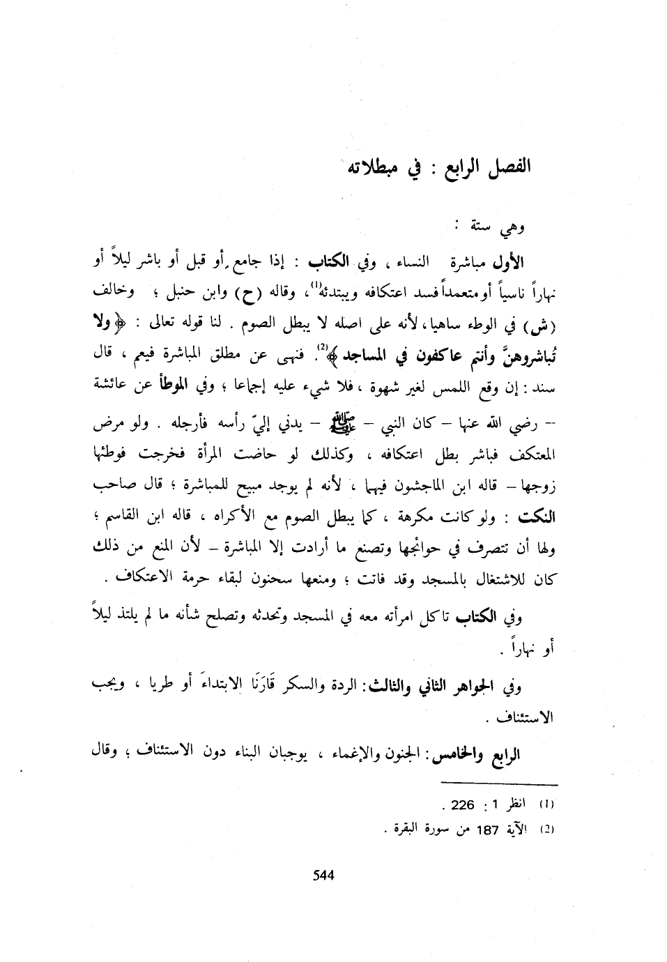 وَهِيَ سِتَّةٌ الْأَوَّلُ مُبَاشَرَةُ النِّسَاءِ وَفِي الْكِتَابِ إِذَا جَامَعَ أَوْ قَبَّلَ أَوْ بَاشَرَ لَيْلًا أَوْ نَهَارًا نَاسِيًا أَوْ مُتَعَمِّدًا فَسَدَ اعْتِكَافُهُ وَيَبْتَدِئُهُ وَقَالَهُ (ح) وَابْنُ حَنْبَلٍ وَخَالَفَ (ش) فِي الْوَطْءِ سَاهِيًا لِأَنَّهُ عَلَى أَصْلِهِ لَا يُبْطِلُ الصَّوْمَ لَنَا قَوْله تَعَالَى {وَلا تُبَاشِرُوهُنَّ وَأَنْتُمْ عَاكِفُونَ فِي الْمَسَاجِد} فَنَهَى عَنْ مُطْلَقِ الْمُبَاشَرَةِ فَيَعُمُّ قَالَ سَنَدٌ إِنْ وَقَعَ اللَّمْسُ لِغَيْرِ شَهْوَةٍ فَلَا شَيْءَ عَلَيْهِ إِجْمَاعًا وَفِي الْمُوَطَّأِ عَنْ عَائِشَةَ رَضِيَ اللَّهُ عَنْهَا كَانَ النَّبِيُّ - صَلَّى اللَّهُ عَلَيْهِ وَسَلَّم َ - يُدْنِي إِلَيَّ رَأْسَهُ فَأُرَجِّلُهُ وَلَوْ مَرِضَ الْمُعْتَكِفُ فَبَاشَرَ بَطَلَ اعْتِكَافُهُ وَكَذَلِكَ لَوْ حَاضَتِ الْمَرْأَةُ فَخَرَجَتْ فَوَطِئَهَا زَوْجُهَا قَالَهُ ابْنُ الْمَاجِشُونِ فِيهِمَا لِأَنَّهُ لَمْ يُوجَدْ مُبِيحٌ لِلْمُبَاشَرَةِ قَالَ صَاحِبُ النُّكَتِ وَلَوْ كَانَتْ مُكْرَهَةً كَمَا يَبْطُلُ الصَّوْمُ مَعَ الْإِكْرَاهِ قَالَهُ ابْنُ الْقَاسِمِ وَلَهَا أَنْ تَتَصَرَّفَ فِي حَوَائِجِهَا وَتَصْنَعَ مَا أَرَادَتْ إِلَّا الْمُبَاشَرَةَ لِأَنَّ الْمَنْعَ مِنْ ذَلِكَ كَانَ لِلِاشْتِغَالِ بِالْمَسْجِدِ وَقَدْ فَاتَتْ وَمَنَعَهَا سَحْنُونٌ لِبَقَاءِ حُرْمَةِ الِاعْتِكَافِ وَفِي الْكِتَابِ تَأْكُلُ امْرَأَتُهُ مَعَهُ فِي الْمَسْجِدِ وَتُحَدِّثُهُ وَتُصْلِحُ شَأْنَهُ مَا لَمْ يَلْتَذَّ لَيْلًا أَوْ نَهَارًا وَفِي الْجَوَاهِرِ الثَّانِي وَالثَّالِثُ الرِّدَّةُ وَالسُّكْرُ قَارَنَا الِابْتِدَاءَ أَوْ طَرَيَا وَيَجِبُ الِاسْتِئْنَافُ الرَّابِعُ وَالْخَامِسُ الْجُنُونُ وَالْإِغْمَاءُ يُوجِبَانِ الْبِنَاءَ دُونَ الِاسْتِئْنَافِ وَقَالَ