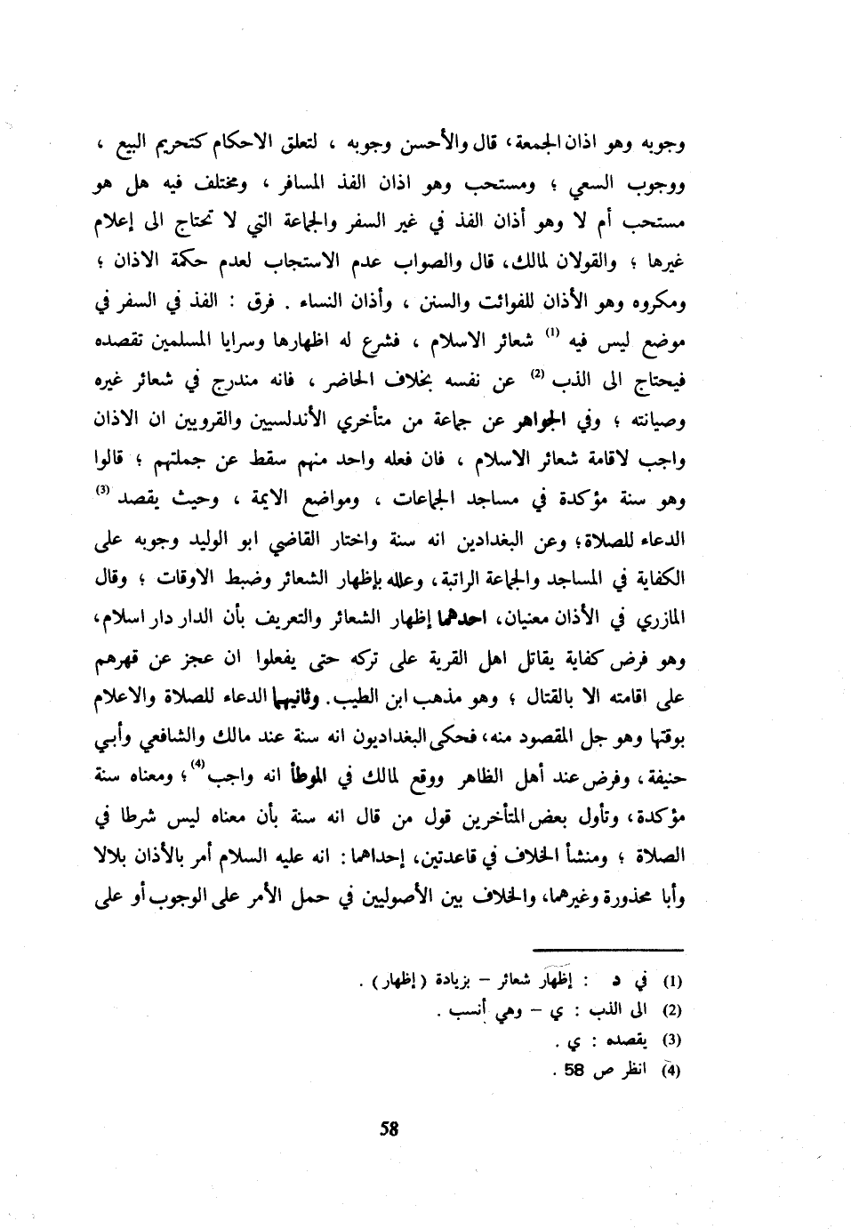 وُجُوبه وَهُوَ أَذَان الْجُمُعَة قَالَ وَالْأَحْسَن وُجُوبه لتَعلق الْأَحْكَام كَتَحْرِيمِ الْبَيْعِ وَوُجُوبِ السَّعْيِ وَمُسْتَحَبٌّ وَهُوَ أَذَانُ الْفَذِّ الْمُسَافِرِ وَمُخْتَلَفٌ فِيهِ هَلْ هُوَ مُسْتَحَبٌّ أَمْ لَا وَهُوَ أَذَانُ الْفَذِّ فِي غَيْرِ السّفر وَالْجَمَاعَةُ الَّتِي لَا تَحْتَاجُ إِلَى إِعْلَامِ غَيْرِهَا وَالْقَوْلَانِ لِمَالِكٍ قَالَ وَالصَّوَابُ عَدَمُ الِاسْتِحْبَابِ لِعَدَمِ حِكْمَةِ الْأَذَانِ وَمَكْرُوهٌ وَهُوَ الْأَذَانُ لِلْفَوَائِتِ وَالسُّنَنِ وَأَذَانُ النِّسَاءِ فَرْقٌ الْفَذُّ فِي السَّفَرِ فِي مَوضِع لَيْسَ فِيهِ شَعَائِرِ الْإِسْلَامِ فَشُرِعَ لَهُ إِظْهَارُهَا وَسَرَايَا الْمُسْلِمِينَ تقصده فَيحْتَاج إِلَى الذب عَنْ نَفْسِهِ بِخِلَافِ الْحَاضِرِ فَإِنَّهُ مُنْدَرِجٌ فِي شَعَائِرِ غَيْرِهِ وَصِيَانَتِهِ وَفِي الْجَوَاهِرِ عَنْ جَمَاعَةٍ مِنْ مُتَأَخَّرِي الْأَنْدَلُسِيِّينَ وَالْقَرَوِيِّينَ أَنَّ الْأَذَانَ وَاجِبٌ لِإِقَامَةِ شَعَائِرِ الْإِسْلَامِ فَإِنْ فَعَلَهُ وَاحِدٌ مِنْهُمْ سَقَطَ عَنْ جُمْلَتِهِمْ قَالُوا وَهُوَ سُنَّةٌ مُؤَكَّدَةٌ فِي مَسَاجِد الْجَمَاعَات ومواضع الأيمة وَحَيْثُ يقْصد الدُّعَاء للصَّلَاة وَعَن البغدادين أَنَّهُ سُنَّةٌ وَاخْتَارَ الْقَاضِي أَبُو الْوَلِيدِ وُجُوبَهُ عَلَى الْكِفَايَةِ فِي الْمَسَاجِدِ وَالْجَمَاعَةِ الرَّاتِبَةِ وَعَلَّلَهُ بِإِظْهَارِ الشَّعَائِرِ وَضَبْطِ الْأَوْقَاتِ وَقَالَ الْمَازِرِيُّ فِي الْأَذَانِ مَعْنَيَانِ أَحَدُهُمَا إِظْهَارُ الشَّعَائِرِ وَالتَّعْرِيفُ بِأَنَّ الدَّارَ دَارُ إِسْلَامٍ وَهُوَ فَرْضُ كِفَايَةٍ يُقَاتَلُ أهل الْقرْيَة على تَركه حَتَّى يَفْعَلُوا إِن عجز عَن قهرهم على إِقَامَة إِلَّا بِالْقِتَالِ وَهُوَ مَذْهَب ابْن الطّيب وَثَانِيهمَا الدُّعَاء للصَّلَاة والإعلام بوقتها وَهُوَ جُلُّ الْمَقْصُودِ مِنْهُ فَحَكَى الْبَغْدَادِيُّونَ أَنَّهُ سُنَّةٌ عِنْدَ مَالِكٍ وَالشَّافِعِيِّ وَأَبِي حَنِيفَةَ وَفَرْضٌ عِنْدَ أَهْلِ الظَّاهِرِ وَوَقَعَ لِمَالِكٍ فِي الْمُوَطَّأِ أَنَّهُ وَاجِبٌ وَمَعْنَاهُ سُنَّةٌ مُؤَكَّدَةٌ وَتَأَوَّلَ بَعْضُ الْمُتَأَخِّرِينَ قَوْلَ مَنْ قَالَ إِنَّهُ سُنَّةٌ بِأَنَّ مَعْنَاهُ لَيْسَ شرطا فِي الصَّلَاة ومنشأ الْخلاف فِي قاعدتين إِحْدَاهمَا أَنه عَلَيْهِ السَّلَام أَمَرَ بِالْأَذَانِ بِلَالًا وَأَبَا مَحْذُورَةَ وَغَيْرَهُمَا وَالْخِلَافُ بَيْنَ الْأُصُولِيِّينَ فِي حَمْلِ الْأَمْرِ عَلَى الْوُجُوبِ أَو على