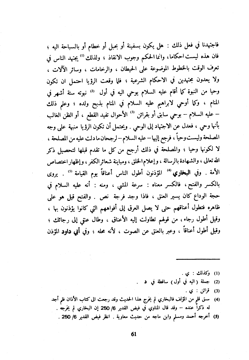 فَاجْتَهَدْنَا فِي فِعْلِ ذَلِكَ هَلْ يَكُونُ بِسَفِينَةٍ أَو بِحَبل أَو خطام أَو بالسباحة إِلَيْهِ فَإِنَّ هَذِهِ لَيْسَتْ أَحْكَامًا وَإِنَّمَا الْحُكْمُ وُجُوبُ الْإِنْقَاذِ وَلِذَلِكَ يَجْتَهِدُ النَّاسُ فِي تَعَرُّفِ الْوَقْت بالخطوط الْمَوْضُوعَة عَلَى الْحِيطَانِ وَالرُّخَامَاتِ وَسَائِرِ الْآلَاتِ وَلَا يُعَدُّونَ مُجْتَهِدِينَ فِي الْأَحْكَامِ الشَّرْعِيَّةِ فَلَمَّا وَقَعَتِ الرُّؤْيَا احْتَمَلَ أَنْ تَكُونَ وَحْيًا مِنَ النُّبُوَّةِ كَمَا أَقَامَ عَلَيْهِ السَّلَامُ يُوحَى إِلَيْهِ فِي أَوَّلِ نُبُوَّتِهِ سِتَّةَ أَشْهُرٍ فِي الْمَنَامِ وَكَمَا أُوحِيَ لِإِبْرَاهِيمَ عَلَيْهِ السَّلَامُ فِي الْمَنَامِ بِذَبْحِ وَلَدِهِ وَعَلِمَ ذَلِكَ عَلَيْهِ السَّلَامُ بِوَحْيٍ سَابِقٍ أَوْ بِقَرَائِنِ الْأَحْوَالِ تُفِيدُ الْقَطْعَ أَوِ الظَّنَّ الْغَالِبِ بِأَنَّهَا وَحْيٌ فَعَدَلَ عَنِ الِاجْتِهَادِ إِلَى الْوَحْيِ وَيُحْتَمَلُ أَنْ تَكُونَ الرُّؤْيَا مُنَبِّهَةٌ عَلَى وَجْهِ الْمَصْلَحَةِ وَلَيْسَتْ وَحْيًا فَرَجَعَ إِلَيْهَا عَلَيْهِ السَّلَامُ لِرُجْحَانِ مَا دَلَّتْ عَلَيْهِ مِنَ الْمَصْلَحَةِ لَا لِكَوْنِهَا وَحْيًا وَالْمَصْلَحَةُ فِي ذَلِكَ أَرْجَحُ مِنْ كُلِّ مَا تَقَدَّمَ قَبْلَهَا لِتَحْصِيلِ ذِكْرِ اللَّهِ تَعَالَى وَالشَّهَادَةِ بِالرِّسَالَةِ وَإِعْلَامِ الْخَلْقِ وَمُبَايَنَةِ شَعَائِرِ الْكُفْرِ وَإِظْهَارِ اخْتِصَاصِ الْأُمَّةِ وَفِي الْبُخَارِيِّ الْمُؤَذِّنُونَ أَطْوَلُ النَّاسِ أَعْنَاقًا يَوْمَ الْقِيَامَةِ يُرْوَى بِالْكَسْرِ وَالْفَتْحِ فَالْكَسْرُ مَعْنَاهُ سُرْعَةُ الْمَشْيِ وَمِنْهُ أَنَّهُ عَلَيْهِ السَّلَامُ فِي حَجَّةِ الْوَدَاعِ كَانَ يَسِيرُ الْعَنَقَ فَإِذَا وَجَدَ فُرْجَةً نَصَّ وَالْفَتْحُ قِيلَ هُوَ عَلَى ظَاهِرِهِ فَتُطَوَّلُ أَعْنَاقُهُمْ حَتَّى لَا يَصِلَ الْعَرَقُ إِلَى أَفْوَاهِهِمُ الَّتِي كَانُوا يُؤَذِّنُونَ بِهَا وَقِيلَ أَطْوَلُ رَجَاءً مِنْ قَوْلِهِمْ تَطَاوَلَتْ إِلَيْهِ الْأَعْنَاقُ وَطَالَ عُنُقِي إِلَى رَجَائِكَ وَقِيلَ أطول أعناقا وَعَبَّرَ بِالْعُنُقِ عَنِ الصَّوْتِ لِأَنَّهُ مَحَلُّهُ وَفِي أَبِي دَاوُدَ الْمُؤَذِّنُ