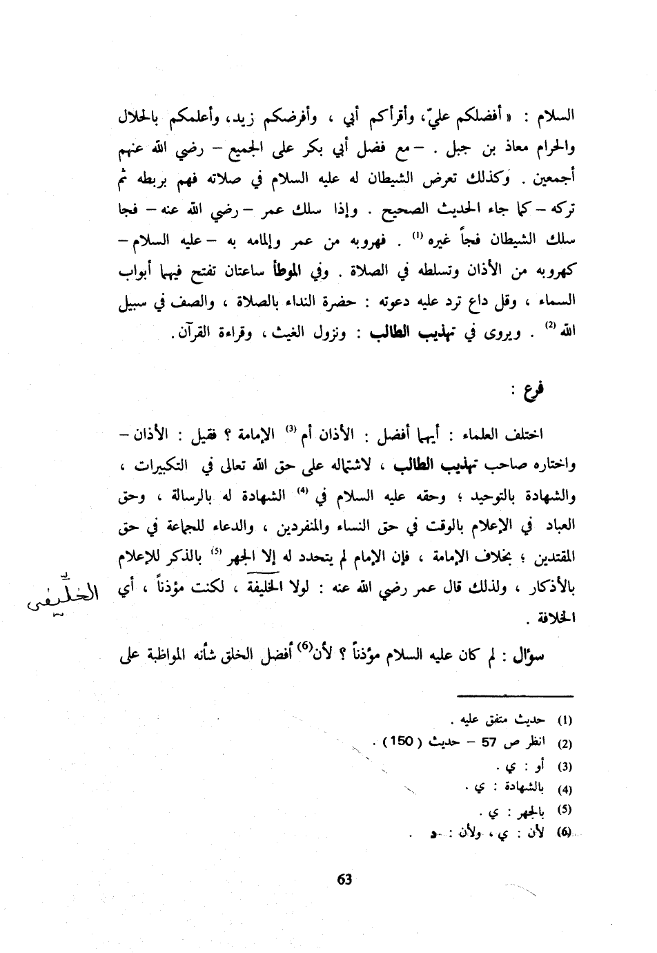 أفضلكم عَلِيٌّ وَأَقْرَأُكُمْ أُبَيٌّ وَأَفْرَضُكُمْ زَيْدٌ وَأَعْلَمُكُمْ بِالْحَلَالِ وَالْحَرَامِ مُعَاذُ بْنُ جَبَلٍ مَعَ فَضْلِ أَبِي بَكْرٍ عَلَى الْجَمِيعِ رَضِيَ اللَّهُ عَنْهُمْ أَجْمَعِينَ وَكَذَلِكَ تَعَرَّضَ الشَّيْطَانُ لَهُ عَلَيْهِ السَّلَامُ فِي صلَاته فهم يربطه ثمَّ تَركه كَمَا جَاءَ الْحَدِيثِ الصَّحِيحِ وَإِذَا سَلَكَ عُمَرُ رَضِيَ اللَّهُ عَنْهُ فَجًّا سَلَكَ الشَّيْطَانُ فَجًّا غَيْرَهُ فَهُرُوبُهُ مِنْ عُمَرَ وَإِلْمَامُهُ بِهِ عَلَيْهِ السَّلَامُ كَهُرُوبِهِ مِنَ الْأَذَانِ وَتَسَلُّطِهِ فِي الصَّلَاةِ وَفِي الْمُوَطَّأِ سَاعَتَانِ تُفْتَحُ فِيهِمَا أَبْوَابُ السَّمَاءِ وَقَلَّ دَاعٍ تُرَدُّ عَلَيْهِ دَعْوَتُهُ حَضْرَةُ النِّدَاءِ بِالصَّلَاةِ وَالصَّفُّ فِي سَبِيلِ اللَّهِ وَيُرْوَى فِي تَهْذِيبِ الطَّالِبِ وَنُزُولُ الْغَيْثِ وَقِرَاءَةُ الْقُرْآنِ