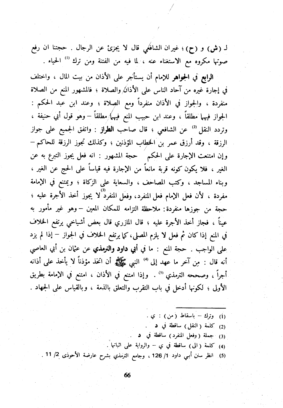لِ (ش) وَ (ح) غَيْرَ أَنَّ الشَّافِعِيَّ قَالَ لَا يُجْزِئُ عَنِ الرِّجَالِ حُجَّتُنَا أَنَّ رَفْعَ صَوْتِهَا مَكْرُوهٌ مَعَ الِاسْتِغْنَاءِ عَنْهُ لِمَا فِيهِ مِنَ الْفِتْنَةِ وَمِنْ تَرْكِ الْحَيَاءِ الرَّابِعُ فِي الْجَوَاهِرِ لِلْإِمَامِ أَنْ يَسْتَأْجِرَ عَلَى الْأَذَانِ مِنْ بَيْتِ الْمَالِ وَاخْتُلِفَ فِي إِجَارَةِ غَيْرِهِ مِنْ آحَادِ النَّاسِ عَلَى الْأَذَانِ وَالصَّلَاةِ فَالْمَشْهُورُ الْمَنْعُ مِنَ الصَّلَاةِ مُنْفَرِدَةً وَالْجَوَازُ فِي الْأَذَانِ مُنْفَرِدًا وَمَعَ الصَّلَاةِ وَعِنْدَ ابْنِ عَبْدِ الْحَكَمِ الْجَوَازُ فِيهِمَا مُطْلَقًا وَعِنْدَ ابْنِ حَبِيبٍ الْمَنْعُ فِيهِمَا مُطْلَقًا وَهُوَ قَوْلُ أَبِي حَنِيفَةَ وَتَرَدَّدَ النَّقْلُ عَنِ الشَّافِعِي قَالَ صَاحِبُ الطَّرَّازِ وَاتَّفَقَ الْجَمِيعُ عَلَى جَوَازِ الرُّزْقَةِ وَقَدْ أَرْزَقَ عُمَرُ بن الْخطاب الْمُؤَذِّنِينَ وَكَذَلِكَ تَجُوزُ الرُّزْقَةُ لِلْحَاكِمِ وَإِنِ امْتَنَعَتِ الْإِجَارَةُ عَلَى الْحُكْمِ حُجَّةُ الْمَشْهُورِ أَنَّهُ فِعْلٌ يَجُوزُ التَّبَرُّعُ بِهِ عَنِ الْغَيْرِ فَلَا يَكُونُ كَوْنُهُ قُرْبَةً مَانِعًا مِنَ الْإِجَارَةِ فِيهِ قِيَاسًا عَلَى الْحَجِّ عَنِ الْغَيْرِ وَبِنَاءِ الْمَسَاجِدِ وَكَتْبِ الْمَصَاحِفِ وَالسِّعَايَةِ عَلَى الزَّكَاةِ وَيَمْتَنِعُ فِي الْإِمَامَةِ مُفْرَدَةً لِأَنَّ فِعْلَ الْإِمَامِ فِعْلُ الْمُنْفَرِدِ وَفِعْلُ الْمُنْفَرِدِ لَا يَجُوزُ أَخْذُ الْأُجْرَةِ عَلَيْهِ حُجَّةُ مَنْ جَوَّزَهَا مُنْفَرِدَةً مُلَاحَظَةُ الْتِزَامِهِ لِلْمَكَانِ الْمُعَيَّنِ وَهُوَ غَيْرُ مَأْمُورٍ بِهِ عَيْنًا فَجَازَ أَخْذُ الْأُجْرَةِ عَلَيْهِ قَالَ الْمَازِرِيُّ قَالَ بَعْضُ أَشْيَاخِي يَرْتَفِعُ الْخِلَافُ فِي الْمَنْعِ إِذَا كَانَ ثَمَّ فِعْلٌ لَا يَلْزَمُ الْمُصَلِّي كَمَا يَرْتَفِعُ الْخِلَافُ فِي الْجَوَازِ إِذَا لَمْ يَزِدْ عَلَى الْوَاجِبِ حُجَّةُ الْمَنْعِ مَا فِي أَبِي دَاوُدَ وَالتِّرْمِذِيِّ عَن عُثْمَان بن أبي العَاصِي أَنَّهُ قَالَ مِنْ آخِرِ مَا عُهِدَ إِلَى النَّبِي - صَلَّى اللَّهُ عَلَيْهِ وَسَلَّم َ -