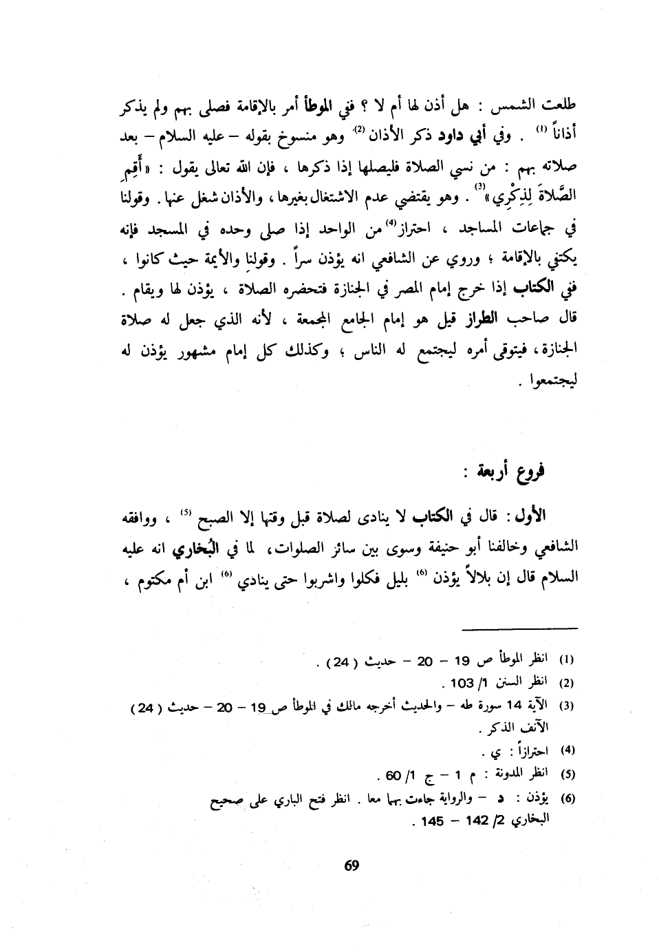 فُرُوعٌ أَرْبَعَةٌ الْأَوَّلُ قَالَ فِي الْكِتَابِ لَا يُنَادَى لِصَلَاةٍ قَبْلَ وَقْتِهَا إِلَّا الصُّبْحُ وَوَافَقَهُ الشَّافِعِيُّ وَخَالَفَنَا أَبُو حنيفَة وَسوى بَين سَائِر الصَّلَوَات لما فِي البُخَارِيّ أَنه عَلَيْهِ السَّلَام