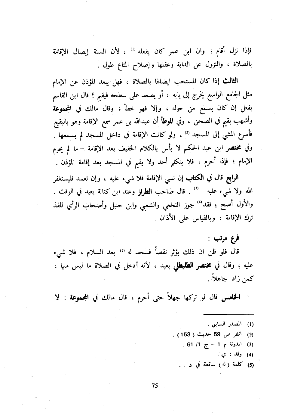 فَإِذَا نَزَلَ أَقَامَ وَأَنَّ ابْنَ عُمَرَ كَانَ يَفْعَله لِأَن السّنة إِيصَال الْإِقَامَةِ بِالصَّلَاةِ وَالنُّزُولُ عَنِ الدَّابَّةِ وَعَقْلُهَا وَإِصْلَاحُ الْمَتَاع طول الثَّالِث إِذا كَانَ الْمُسْتَحبّ إيصالها بِالصَّلَاةِ فَهَل يبعد الْمُؤَذّن عَن الإِمَام مِثْلِ الْجَامِعِ الْوَاسِعِ يَخْرُجُ إِلَى بَابِهِ أَوْ يَصْعَدُ عَلَى سَطْحِهِ فَيُقِيمُ قَالَ ابْنُ الْقَاسِمِ يَفْعَلُ إِنْ كَانَ يُسْمِعُ مَنْ حَوْلَهُ وَإِلَّا فَهُوَ خطأ وَقَالَ مَالك فِي الْمَجْمُوعَةِ وَأَشْهَبُ يُقِيمُ فِي الصَّحْنِ وَفِي الْمُوَطَّأِ أَنَّ عَبْدَ اللَّهِ بْنَ عُمَرَ سَمِعَ الْإِقَامَةَ وَهُوَ بِالْبَقِيعِ فَأَسْرَعَ الْمَشْيَ إِلَى الْمَسْجِدِ وَلَوْ كَانَتِ الْإِقَامَةُ فِي دَاخِلِ الْمَسْجِدِ لَمْ يَسْمَعْهَا وَفِي مُخْتَصَرِ ابْنِ عَبْدِ الْحَكَمِ لَا بَأْسَ بِالْكَلَامِ الْخَفِيفِ بَعْدَ الْإِقَامَةِ مَا لَمْ يُحْرِمِ الْإِمَامُ فَإِذَا أَحْرَمَ فَلَا يَتَكَلَّمُ أَحَدٌ وَلَا يُقِيمُ فِي الْمَسْجِدِ بَعْدَ إِقَامَةِ الْمُؤَذِّنِ الرَّابِعُ قَالَ فِي الْكِتَابِ إِنْ نَسِيَ الْإِقَامَةَ فَلَا شَيْءَ عَلَيْهِ وَإِنْ تَعَمَّدَ فَلْيَسْتَغْفِرِ اللَّهَ وَلَا شَيْءَ عَلَيْهِ قَالَ صَاحِبُ الطَّرَّازِ وَعِنْدَ ابْنِ كِنَانَةَ يُعِيدُ فِي الْوَقْتِ وَالْأَوَّلُ أَصَحُّ فَقَدْ جَوَّزَ النَّخَعِيُّ وَالشَّعْبِيُّ وَابْنُ حَنْبَلٍ وَأَصْحَابُ الرَّأْيِ لِلْفَذِّ تَرْكَ الْإِقَامَةِ وَبِالْقِيَاسِ عَلَى الْأَذَانِ