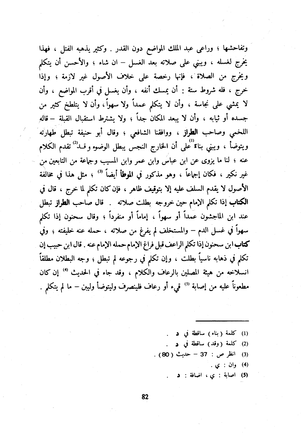 وَتَفَاحُشِهَا وَرَاعَى عَبْدُ الْمَلِكِ الْمَوَاضِعَ دُونَ الْقَدْرِ وَكثير يذهبه الفتل فَهَذَا يَخْرُجُ لِغَسْلِهِ وَيَبْنِي عَلَى صَلَاتِهِ بَعْدَ الْغَسْلِ إِنْ شَاءَ وَالْأَحْسَنُ أَنْ يَتَكَلَّمَ وَيَخْرُجَ مِنَ الصَّلَاةِ فَإِنَّهَا رُخْصَةٌ عَلَى خِلَافِ الْأُصُولِ غَيْرُ لَازِمَةٍ وَإِذَا خَرَجَ فَلَهُ شُرُوطٌ سِتَّةٌ أَنْ يُمْسِكَ أَنْفَهُ وَأَنْ يَغْسِلَ فِي أَقْرَبِ الْمَوَاضِع وَأَن لَا يمشي على نَجَاسَة وَأَن لَا يتَكَلَّم عمدا وَلَا سَهوا وَأَن لَا يتلطخ كثير من جسده أَو ثِيَابه وَأَن لَا يَبْعُدَ الْمَكَانُ جِدًّا وَلَا يُشْتَرَطُ اسْتِقْبَالُ الْقِبْلَةِ قَالَهُ اللَّخْمِيُّ وَصَاحِبُ الطَّرَّازِ وَوَافَقَنَا الشَّافِعِيُّ وَقَالَ أَبُو حنيفَة تَبْطُلُ طَهَارَتُهُ وَيَتَوَضَّأُ وَيَبْنِي بِنَاءً عَلَى أَنَّ الْخَارِجَ النَّجِسَ يُبْطِلُ الْوُضُوءَ وَقَدْ تَقَدَّمَ الْكَلَامُ عَنْهُ لَنَا مَا يُرْوَى عَنِ ابْنِ عَبَّاسٍ وَابْنِ عُمَرَ وَابْنِ الْمُسَيِّبِ وَجَمَاعَةٍ مِنَ التَّابِعِينَ مِنْ غَيْرِ نَكِيرٍ فَكَانَ إِجْمَاعًا وَهُوَ مَذْكُورٌ فِي الْمُوَطَّأ أَيْضا مِثْلُ هَذَا فِي مُخَالَفَةِ الْأُصُولِ لَا يُقْدِمُ السَّلَفُ عَلَيْهِ إِلَّا بِتَوْقِيفٍ ظَاهِرٍ فَإِنْ كَانَ تَكَلَّمَ لَمَّا خَرَجَ قَالَ فِي الْكِتَابِ إِذَا تَكَلَّمَ الْإِمَامُ حِينَ خُرُوجِهِ بَطَلَتْ صَلَاتُهُ قَالَ صَاحِبُ الطَّرَّازِ تَبْطُلُ عِنْدَ ابْنِ الْمَاجِشُونِ عَمْدًا أَوْ سَهْوًا إِمَامًا أَوْ مُنْفَرِدًا وَقَالَ سَحْنُونٌ إِذَا تَكَلَّمَ سَهْوًا فِي غَسْلِ الدَّمِ وَالْمُسْتَخْلَفُ لم يفرغ من صلَاته حمله عِنْد خَلِيفَته وَفِي كتاب ابْن سَحْنُون إِذا تَكَلَّمَ الرَّاعِفُ قَبْلَ فَرَاغِ الْإِمَامِ حَمَلَهُ الْإِمَامُ عَنْهُ قَالَ ابْنُ حَبِيبٍ إِنْ تَكَلَّمَ فِي ذَهَابه نَاسِيا بطلت وَإِنْ تَكَلَّمَ فِي رُجُوعِهِ لَمْ تَبْطُلْ وَجْهُ الْبُطْلَانِ مُطْلَقًا انْسِلَاخُهُ مِنْ هَيْئَةِ الْمُصَلِّينَ بِالرُّعَافِ وَالْكَلَام وَقد جَاءَ فِي الحَدِيث إِن كَانَ مَطْعُونًا عَلَيْهِ مَنْ أَصَابَهُ قَيْءٌ أَوْ رُعَافٌ فَلْيَنْصَرِفْ وَلْيَتَوَضَّأْ وَلْيَبْنِ مَا لَمْ يَتَكَلَّمْ