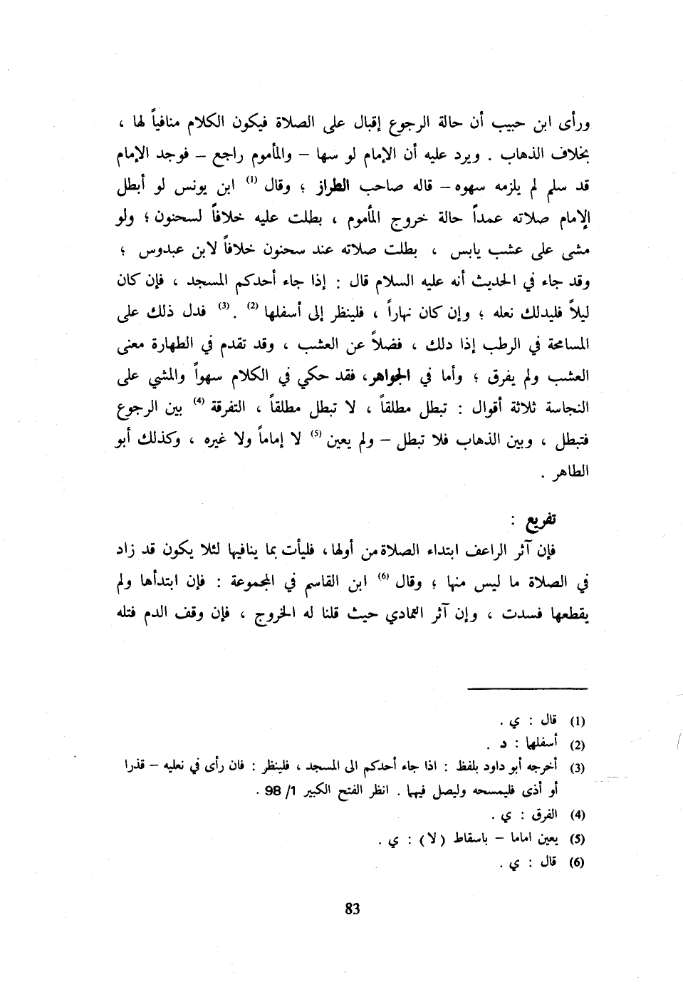 وَرَأَى ابْنُ حَبِيبٍ أَنَّ حَالَةَ الرُّجُوعِ إِقْبَالٌ عَلَى الصَّلَاةِ فَيَكُونُ الْكَلَامُ مُنَافِيًا لَهَا بِخِلَافِ الذَّهَابِ وَيُرَدُّ عَلَيْهِ أَنَّ الْإِمَامَ لَوْ سَهَا وَالْمَأْمُومُ رَاجِعٌ فَوَجَدَ الْإِمَامَ قَدْ سَلَّمَ لَمْ يَلْزَمْهُ سَهْوُهُ قَالَهُ صَاحِبُ الطَّرَّازِ وَقَالَ ابْنُ يُونُسَ لَوْ أَبْطَلَ الْإِمَامُ صَلَاتَهُ عَمْدًا حَالَةَ خُرُوجِ الْمَأْمُومِ بَطَلَتْ عَلَيْهِ خِلَافًا لِسَحْنُونٍ وَلَوْ مَشى على عشب يَابِس بطلت صلَاته عِنْد سَحْنُونٍ خِلَافًا لِابْنِ عَبْدُوسٍ وَقَدْ جَاءَ فِي الْحَدِيثِ أَنَّهُ عَلَيْهِ السَّلَامُ قَالَ إِذَا جَاءَ أَحَدُكُمُ الْمَسْجِدَ فَإِنْ كَانَ لَيْلًا فَلْيُدَلِّكْ نَعْلَهُ وَإِنْ كَانَ نَهَارًا فَلْيَنْظُرْ إِلَى أَسْفَلِهَا فَدَلَّ ذَلِكَ عَلَى الْمُسَامَحَةِ فِي الرَّطْبِ إِذَا دُلِّكَ فضلا عَن العشب وَقد تقدم فِي الطَّهَارَة معنى العشب وَلم يفرق وَأَمَّا فِي الْجَوَاهِرِ فَقَدْ حُكِيَ فِي الْكَلَامِ سَهْوًا وَالْمَشْيُ عَلَى النَّجَاسَةِ ثَلَاثَةُ أَقْوَالٍ تَبْطُلُ مُطْلَقًا لَا تَبْطُلُ مُطْلَقًا التَّفْرِقَةُ بَيْنَ الرُّجُوعِ فَتَبْطُلُ وَبَيْنَ الذَّهَابِ فَلَا تَبْطُلُ وَلَمْ يُعَيِّنْ لَا إِمَامًا وَلَا غَيْرَهُ وَكَذَلِكَ أَبُو الطَّاهِرِ
