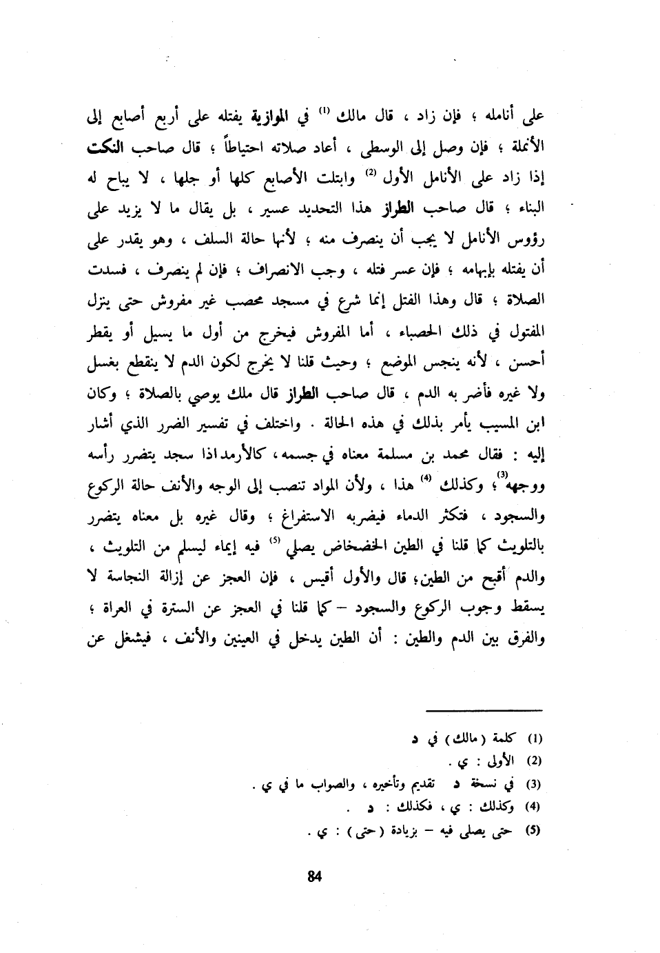 عَلَى أَنَامِلِهِ فَإِنْ زَادَ قَالَ مَالِكٌ فِي الْمَوَّازِيَّةِ يَفْتِلُهُ عَلَى أَرْبَعِ أَصَابِعٍ إِلَى الْأُنْمُلَةِ فَإِنْ وَصَلَ إِلَى الْوُسْطَى أَعَادَ صَلَاتَهُ احْتِيَاطًا قَالَ صَاحِبُ النُّكَتِ إِذَا زَادَ عَلَى الْأَنَامِلِ الْأُوَلِ وَابْتَلَّتِ الْأَصَابِعُ كُلُّهَا أَوْ جُلُّهَا لَا يُبَاحُ لَهُ الْبِنَاءُ قَالَ صَاحِبُ الطَّرَّازِ هَذَا التَّحْدِيدُ عَسِيرٌ بَلْ يُقَالُ مَا لَا يَزِيدُ على رُؤُوس الْأَنَامِلِ لَا يَجِبُ أَنْ يَنْصَرِفَ مِنْهُ لِأَنَّهَا حَالَةُ السَّلَفِ وَهُوَ يَقْدِرُ عَلَى أَنْ يَفْتِلَهُ بِإِبْهَامِهِ فَإِنْ عَسُرَ فَتْلُهُ وَجَبَ الِانْصِرَافُ فَإِنْ لَمْ يَنْصَرِفْ فَسَدَتِ الصَّلَاةُ قَالَ وَهَذَا الْفَتْلُ إِنَّمَا شُرِعَ فِي مَسْجِدٍ مُحْصِبٍ غَيْرِ مَفْرُوشٍ حَتَّى ينزل المفتول فِي ذَلِك الْحَصْبَاءِ أَمَّا الْمَفْرُوشُ فَيَخْرُجُ مِنْ أَوَّلِ مَا يَسِيلُ أَوْ يَقْطُرُ أَحْسَنُ لِأَنَّهُ يُنَجِّسُ الْمَوْضِعَ وَحَيْثُ قُلْنَا لَا يَخْرُجُ لِكَوْنِ الدَّمُ لَا يَنْقَطِعُ بِغَسْلٍ وَلَا غَيْرِهِ فَأَضَرَّ بِهِ الدَّمُ قَالَ صَاحب الطّراز قَالَ ملك يُوصي بِالصَّلَاةِ وَكَانَ ابْنُ الْمُسَيِّبِ يَأْمُرُ بِذَلِكَ فِي هَذِه الْحَالة وَاخْتلف فِي تَفْسِيرِ الضَّرَرِ الَّذِي أَشَارَ إِلَيْهِ فَقَالَ مُحَمَّدُ بْنُ مَسْلَمَةَ مَعْنَاهُ فِي جِسْمِهِ كَالْأَرْمَدِ إِذا سجد يتَضَرَّر رَأسه وَوَجهه وَكَذَلِكَ هَذَا وَلِأَنَّ الْمَوَادَّ تَنْصَبُّ إِلَى الْوَجْهِ وَالْأَنْفِ حَالَة الرُّكُوع وَالسُّجُود فتكثر الدِّمَاء فيضربه الاستفراغ وَقَالَ غَيره بل مَعْنَاهُ يتَضَرَّر بِالتَّلْوِيثِ كَمَا قُلْنَا فِي الطِّينِ الْخَضْخَاضِ يُصَلِّي فِيهِ إِيمَاءً لِيَسْلَمَ مِنَ التَّلْوِيثِ وَالدَّمُ أَقْبَحُ مِنَ الطِّينِ قَالَ وَالْأَوَّلُ أَقْيَسُ فَإِنَّ الْعَجْزَ عَنْ إِزَالَةِ النَّجَاسَةِ لَا يُسْقِطُ وُجُوبَ الرُّكُوعِ وَالسُّجُودِ كَمَا قُلْنَا فِي الْعَجْزِ عَنِ السُّتْرَةِ فِي الْعُرَاةِ وَالْفَرْقُ بَيْنَ الدَّمِ وَالطِّينِ أَنَّ الطين يدْخل فِي الْعَينَيْنِ وَالْأَنْفِ فَيَشْغَلُ عَنِ