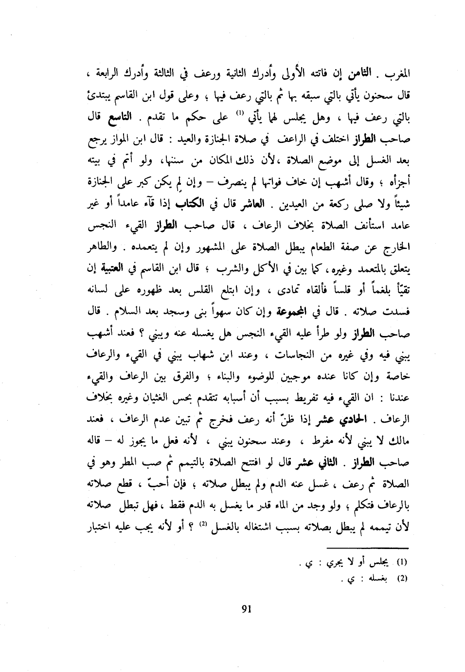 الْمَغْرِبِ الثَّامِنُ إِنْ فَاتَتْهُ الْأُولَى وَأَدْرَكَ الثَّانِيَةَ وَرَعَفَ فِي الثَّالِثَةِ وَأَدْرَكَ الرَّابِعَةَ قَالَ سَحْنُونٌ يَأْتِي بِالَّتِي سَبَقَهُ بِهَا ثُمَّ بِالَّتِي رَعَفَ فِيهَا وَعَلَى قَوْلِ ابْنِ الْقَاسِمِ يَبْتَدِئُ بِالَّتِي رَعَفَ فِيهَا وَهَلْ يَجْلِسُ لَهُمَا يَأْتِي عَلَى حُكْمِ مَا تَقَدَّمَ التَّاسِعُ قَالَ صَاحِبُ الطَّرَّازِ اخْتُلِفَ فِي الرَّاعِفِ فِي صَلَاةِ الْجَنَازَةِ وَالْعِيدِ قَالَ ابْنُ الْمَوَّازِ يَرْجِعُ بَعْدَ الْغَسْلِ إِلَى مَوْضِعِ الصَّلَاةِ لِأَنَّ ذَلِكَ الْمَكَانَ مِنْ سُنَنِهَا وَلَوْ أَتَمَّ فِي بَيْتِهِ أَجَزَأَهُ وَقَالَ أَشْهَبُ إِنْ خَافَ فَوَاتَهَا لَمْ يَنْصَرِفْ وَإِنْ لَمْ يَكُنْ كَبَّرَ عَلَى الْجِنَازَةِ شَيْئًا وَلَا صَلَّى رَكْعَةً مِنَ الْعِيدَيْنِ الْعَاشِرُ قَالَ فِي الْكِتَابِ إِذَا قَاءَ عَامِدًا أَوْ غَيْرَ عَامِدٍ اسْتَأْنَفَ الصَّلَاةَ بِخِلَافِ الرُّعَافِ قَالَ صَاحِبُ الطَّرَّازِ الْقَيْءُ النَّجِسُ الْخَارِجُ عَنْ صِفَةِ الطَّعَامِ يُبْطِلُ الصَّلَاةَ عَلَى الْمَشْهُورِ وَإِنْ لَمْ يَتَعَمَّدْهُ وَالطَّاهِرُ يَتَعَلَّقُ بِالْمُتَعَمَّدِ وَغَيْرِهِ كَمَا بَيَّنَ فِي الْأَكْلِ وَالشُّرْبِ قَالَ ابْنُ الْقَاسِمِ فِي الْعُتْبِيَّةِ إِنْ تَقَيَّأَ بَلْغَمًا أَوْ قَلْسًا فَأَلْقَاهُ تَمَادَى وَإِنِ ابْتَلَعَ الْقَلَسَ بَعْدَ ظُهُورِهِ عَلَى لِسَانِهِ فَسَدَتْ صَلَاتُهُ قَالَ فِي الْمَجْمُوعَةِ وَإِنْ كَانَ سَهْوًا بَنَى وَسَجَدَ بَعْدَ السَّلَامِ قَالَ صَاحِبُ الطَّرَّازِ وَلَوْ طَرَأَ عَلَيْهِ الْقَيْءُ النَّجِسُ هَلْ يَغْسِلُهُ عَنْهُ وَيَبْنِي فَعِنْدَ أَشْهَبَ يَبْنِي فِيهِ وَفِي غَيْرِهِ مِنَ النَّجَاسَاتِ وَعِنْدَ ابْنِ شِهَابٍ يَبْنِي فِي الْقَيْءِ وَالرُّعَافِ خَاصَّةً وَإِنْ كَانَا عِنْدَهُ مُوجِبَيْنِ لِلْوُضُوءِ وَالْبِنَاءِ وَالْفَرْقُ بَيْنَ الرُّعَافِ وَالْقَيْءِ عِنْدَنَا أَنَّ الْقَيْءَ فِيهِ تَفْرِيطٌ بِسَبَبِ أَنَّ أَسْبَابَهُ تَتَقَدَّمُ بِحَسِّ الْغَثَيَانِ وَغَيْرِهِ بِخِلَافِ الرُّعَافِ الْحَادِيَ عَشَرَ إِذَا ظَنَّ أَنَّهُ رَعَفَ فَخَرَجَ ثُمَّ تَبَيَّنَ عَدَمُ الرُّعَافِ فَعِنْدَ مَالِكٍ لَا يَبْنِي لِأَنَّهُ مُفَرِّطٌ وَعِنْدَ سَحْنُونٍ يَبْنِي لِأَنَّهُ فَعَلَ مَا يَجُوزُ لَهُ قَالَهُ صَاحِبُ الطَّرَّازِ الثَّانِيَ عَشَرَ قَالَ لَوِ افْتَتَحَ الصَّلَاةَ بِالتَّيَمُّمِ ثُمَّ صَبَّ الْمَطَرَ وَهُوَ فِي الصَّلَاةِ ثُمَّ رَعَفَ غَسَلَ عَنْهُ الدَّمَ وَلَمْ يُبْطِلْ صَلَاتَهُ فَإِنْ أَحَبَّ قَطَعَ صَلَاتَهُ بِالرُّعَافِ فَتَكَلَّمَ وَلَوْ وَجَدَ مِنَ الْمَاءِ قَدْرَ مَا يَغْسِلُ بِهِ الدَّمَ فَقَطْ فَهَلْ تَبْطُلُ صَلَاتُهُ لِأَنَّ تَيَمُّمَهُ لَمْ يَبْطُلْ بِصَلَاتِهِ بِسَبَبِ اشْتِغَالِهِ بِالْغَسْلِ أَوْ لِأَنَّهُ يَجِبُ عَلَيْهِ اخْتِبَارُ