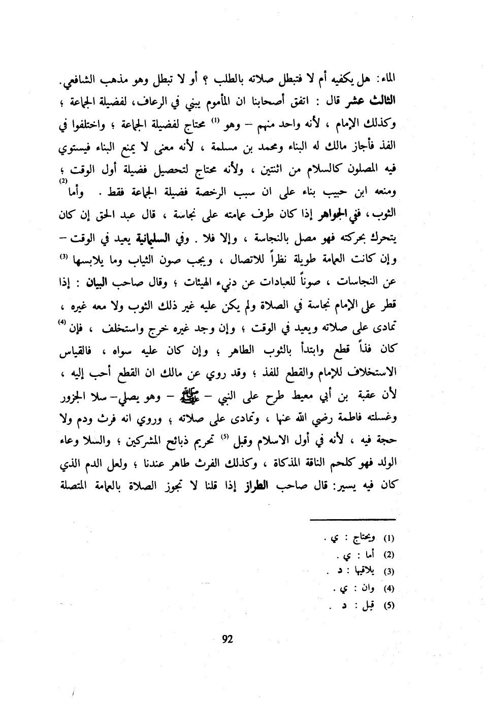 الْمَاءِ هَلْ يَكْفِيهِ أَمْ لَا فَتَبْطُلُ صَلَاتُهُ بِالطَّلَبِ أَو لَا تبطل وَهُوَ مَذْهَب الشَّافِعِي الثَّالِثَ عَشَرَ قَالَ اتَّفَقَ أَصْحَابُنَا أَنَّ الْمَأْمُومَ يَبْنِي فِي الرُّعَافِ لِفَضِيلَةِ الْجَمَاعَةِ وَكَذَلِكَ الْإِمَامُ لِأَنَّهُ وَاحِدٌ مِنْهُمْ وَهُوَ مُحْتَاجٌ لِفَضِيلَةِ الْجَمَاعَةِ وَاخْتَلَفُوا فِي الْفَذِّ فَأَجَازَ مَالِكٌ لَهُ الْبِنَاءَ وَمُحَمَّدُ بْنُ مَسْلَمَةَ لِأَنَّهُ مَعْنَى لَا يَمْنَعُ الْبِنَاءَ فَيَسْتَوِي فِيهِ الْمُصَلُّونَ كَالسَّلَامِ مِنِ اثْنَتَيْنِ وَلِأَنَّهُ مُحْتَاجٌ لِتَحْصِيلِ فَضِيلَةِ أَوَّلِ الْوَقْتِ وَمَنَعَهُ ابْنُ حَبِيبٍ بِنَاءً عَلَى أَنَّ سَبَبَ الرُّخْصَةِ فَضِيلَةُ الْجَمَاعَةِ فَقَطْ وَأَمَّا الثَّوْبُ فَفِي الْجَوَاهِرِ إِذَا كَانَ طَرَفُ عِمَامَتِهِ عَلَى نَجَاسَةٍ قَالَ عَبْدُ الْحَقِّ إِنْ كَانَ يَتَحَرَّكُ بِحَرَكَتِهِ فَهُوَ مُصَلٍّ بِالنَّجَاسَةِ وَإِلَّا فَلَا وَفِي السُّلَيْمَانِيَّةِ يُعِيدُ فِي الْوَقْتِ وَإِنْ كَانَتِ الْعِمَامَةُ طَوِيلَةً نَظَرًا لِلِاتِّصَالِ وَيَجِبُ صَوْنُ الثِّيَابِ وَمَا يُلَابِسُهَا عَنِ النَّجَاسَاتِ صَوْنًا لِلْعِبَادَاتِ عَنْ دَنِيءِ الْهَيْئَاتِ وَقَالَ صَاحِبُ الْبَيَانِ إِذَا قُطِّرَ عَلَى الْإِمَامِ نَجَاسَةٌ فِي الصَّلَاةِ وَلَمْ يَكُنْ عَلَيْهِ غَيْرُ ذَلِكَ الثَّوْبِ وَلَا مَعَهُ غَيْرُهُ تَمَادَى عَلَى صَلَاتِهِ وَيُعِيدُ فِي الْوَقْتِ وَإِنْ وَجَدَ غَيْرَهُ خَرَجَ وَاسْتَخْلَفَ فَإِنْ كَانَ فَذًّا قَطَعَ وَابْتَدَأَ بِالثَّوْبِ الطَّاهِرِ وَإِنْ كَانَ عَلَيْهِ سِوَاهُ فَالْقِيَاسُ الِاسْتِخْلَافُ لِلْإِمَامِ وَالْقَطْعُ لِلْفَذِّ وَقَدْ رُوِيَ عَنْ مَالِكٍ أَنَّ الْقَطْعَ أَحَبُّ إِلَيْهِ لِأَنَّ عُقْبَةَ بْنَ أَبِي مُعَيْطٍ طَرَحَ عَلَى النَّبِيِّ - صَلَّى اللَّهُ عَلَيْهِ وَسَلَّم َ - وَهُوَ يُصَلِّي سَلَا الْجَزُورِ وَغَسَلَتْهُ فَاطِمَةُ رَضِيَ اللَّهُ عَنْهَا وَتَمَادَى عَلَى صَلَاتِهِ وَرُوِيَ أَنَّهُ فَرْثٌ وَدَمٌ وَلَا حُجَّةَ فِيهِ لِأَنَّهُ فِي أَوَّلِ الْإِسْلَامِ وَقَبْلَ تَحْرِيمِ ذَبَائِحِ الْمُشْرِكِينَ وَالسَّلَا وِعَاءُ الْوَلَدِ فَهُوَ كَلَحْمِ النَّاقَةِ الْمُذَكَّاةِ وَكَذَلِكَ الْفَرْثُ طَاهِرٌ عِنْدَنَا وَلَعَلَّ الدَّمَ الَّذِي كَانَ فِيهِ يَسِيرٌ قَالَ صَاحِبُ الطَّرَّازِ إِذَا قُلْنَا لَا تَجُوزُ الصَّلَاةُ بِالْعِمَامَةِ الْمُتَّصِلَةِ