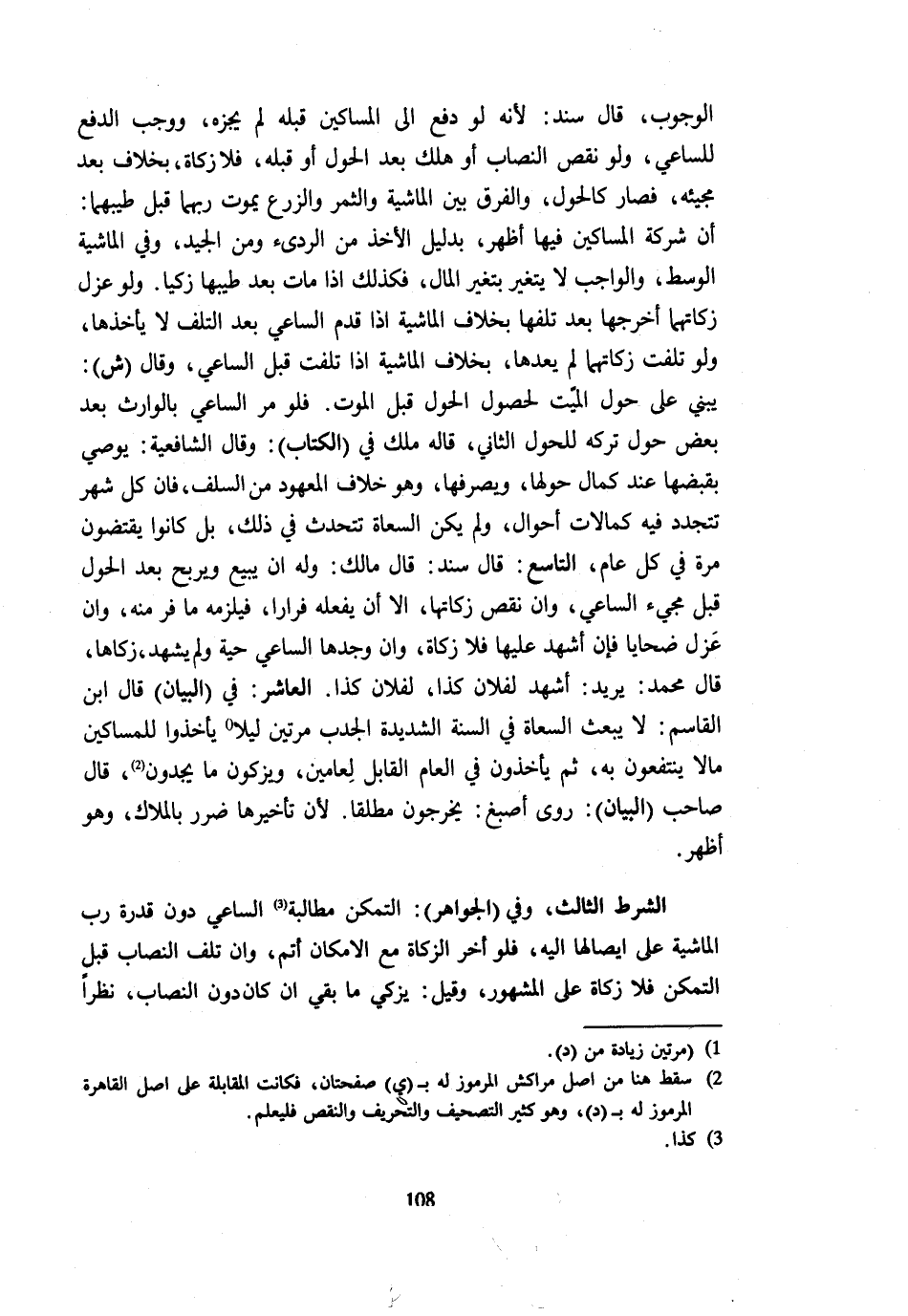 الْوُجُوبِ قَالَ سَنَدٌ لِأَنَّهُ لَوْ دَفَعَ إِلَى الْمَسَاكِينِ قَبْلَهُ لَمْ يُجْزِهِ وَوَجَبَ الدَّفْعُ لِلسَّاعِي وَلَوْ نَقَصَ النِّصَابُ أَوْ هَلَكَ بَعْدَ الْحَوْلِ أَوْ قَبْلَهُ فَلَا زَكَاةَ بِخِلَافِ بَعْدَ مَجِيئِهِ فَصَارَ كالحول وَالْفرق بَين الْمَاشِيَة وَالثَّمَر وَالزَّرْعِ يَمُوتُ رَبُّهُمَا قَبْلَ طِيبِهِمَا أَنَّ شَرِكَةَ الْمَسَاكِين فِيهَا أظهر بِدَلِيل الْأَخْذ من الردئ وَمِنَ الْجَيِّدِ وَفِي الْمَاشِيَةِ الْوَسَطُ وَالْوَاجِبُ لَا يتَغَيَّر بِغَيْر الْمَالِ فَكَذَلِكَ إِذَا مَاتَ بَعْدَ طِيبِهَا زُكِّيَا وَلَو عزل زكاتهما أخرجهَا بعد تلفهَا بِخِلَافِ الْمَاشِيَةِ إِذَا قَدِمَ السَّاعِي بَعْدَ التَّلَفِ لَا يَأْخُذُهَا وَلَوْ تَلِفَتْ زَكَاتُهُمَا لَمْ يَعِدَّهَا بِخِلَاف الْمَاشِيَة إِذا تلفت قبل السَّاعِي وَقَالَ ش يَبْنِي عَلَى حَوْلِ الْمَيِّتِ لِحُصُولِ الْحَوْلِ قَبْلَ الْمَوْتِ فَلَوْ مَرَّ السَّاعِي بالوارث بعد بعض حول تَركه للحول الثَّانِي قَالَ ملك فِي الْكتاب وَقَالَ الشَّافِعِيَّةُ يُوصَى بِقَبْضِهَا عِنْدَ كَمَالِ حَوْلِهَا وَيَصْرِفُهَا وَهُوَ خِلَافُ الْمَعْهُودِ مِنَ السَّلَفِ فَإِنَّ كُلَّ شهر تتجدد فِيهِ كمالات أَحْوَال وَلم تكن السعاة تَتَحَدَّث فِي ذَلِك بل كَانُوا يقتضون مرّة فِي كُلَّ عَامٍ التَّاسِعُ قَالَ سَنَدٌ قَالَ مَالِكٌ وَلَهُ أَنْ يَبِيعَ وَيَرْبَحَ بَعْدَ الْحَوْلِ قَبْلَ مَجِيء السَّاعِي وان نقص زَكَاتِهَا إِلَّا أَنْ يَفْعَلَهُ فِرَارًا فَيَلْزَمُهُ مَا فَرَّ مِنْهُ وَإِنْ عَزَلَ ضَحَايَا فَإِنْ أُشْهِدَ عَلَيْهَا فَلَا زَكَاةَ وَإِنْ وَجَدَهَا السَّاعِي حَيَّةً وَلم يَشْهَدْ زَكَّاهَا قَالَ مُحَمَّدٌ يُرِيدُ أَشْهَدُ لِفُلَانٍ كَذَا لِفُلَانٍ كَذَا الْعَاشِرُ فِي الْبَيَانِ قَالَ ابْن الْقَاسِم لَا يبْعَث السعاة فِي السّنة الشَّدِيدَة الجدب مرَّتَيْنِ لَيْلًا يَأْخُذُوا للْمَسَاكِين مَالا يَنْتَفِعُونَ بِهِ ثُمَّ يَأْخُذُونَ فِي الْعَامِ الْقَابِلِ لعامين وَيُزَكُّونَ مَا يَجِدُونَ قَالَ صَاحِبُ الْبَيَانِ رَوَى أَصْبَغُ يَخْرُجُونَ مُطْلَقًا لِأَنَّ تَأْخِيرَهَا ضَرَرٌ بِالْمُلَّاكِ وَهُوَ أَظْهَرُ الشَّرْطُ الثَّالِثُ وَفِي الْجَوَاهِرِ التَّمَكُّنُ مُطَالَبَةِ السَّاعِي دُونَ قُدْرَةِ رَبِّ الْمَاشِيَةِ عَلَى إِيصَالِهَا إِلَيْهِ فَلَوْ أَخَّرَ الزَّكَاةَ مَعَ الْإِمْكَانِ أتم وَإِنْ تَلِفَ النِّصَابُ قَبْلَ التَّمَكُّنِ فَلَا زَكَاةَ عَلَى الْمَشْهُورِ وَقِيلَ يُزَكِّي مَا بَقِيَ إِنْ كَانَ دُونَ النِّصَابِ نَظَرًا