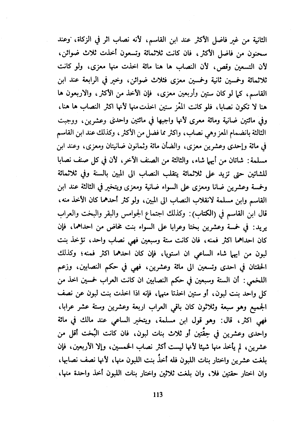 الثانيةُ مِنْ غَيْرِ فَاضِلِ الْأَكْثَرِ عِنْدَ ابْنِ الْقَاسِمِ لِأَنَّهُ نِصَابٌ أَثَّرَ فِي الزَّكَاةِ وَعِنْدَ سَحْنُونٍ مِنْ فَاضِلِ الْأَكْثَرِ فَإِنْ كَانَتْ ثَلَاثَمِائَةٍ وَتسْعُونَ أُخِذَتْ ثَلَاثُ ضَوَائِنَ لِأَنَّ التِسْعِينَ وَقَصٌ لِأَنَّ النّصاب هَا هُنَا مائَة أخذت مِنْهَا معزى وَلَو كَانَت ثَلَاثمِائَة وَخمسين ثَانِيَة وَخمسين معزى فَثَلَاث ضوائن وَخير من الْأَرْبَعَة عِنْد ابْن الْقَاسِم كَمَا لَو كَانَ سِتِّينَ وَأَرْبَعِينَ مَعْزًى فَإِنَّ الْأَخْذَ مِنَ الْأَكْثَرِ وَالْأَرْبَعُونَ هَا هُنَا لَا تَكُونُ نِصَابًا فَلَوْ كَانَتِ الْمَعَزُ سِتِّينَ أخذت مِنْهَا لِأَنَّهَا اكثر النّصاب هَا هُنَا وَفِي مِائَتَيْنِ ضانية وَمِائَة معرى لِأَنَّهَا وَاجِبُهَا فِي مِائَتَيْنِ وَإِحْدَى وَعِشْرِينَ وَوَجَبَتِ الثَّالِثَةُ بِانْضِمَامِ الْمَعَزِ وَهِيَ نِصَابٌ وَأَكْثَرُ مِمَّا فَضَلَ مِنَ الْأَكْثَرِ وَكَذَلِكَ عِنْدَ ابْنِ الْقَاسِمِ فِي مِائَةٍ وَإِحْدَى وَعِشْرِينَ مَعْزًى وَالضَّأْنُ مِائَةٌ وَثَمَانُونَ ضانيتان ومعزى وَعند ابْن مسلمة شَاتَان فِي أَيهمَا شَاءَ وَالثَّالِثَة فِي الصِّنْفِ الْآخَرِ لِأَنَّ فِي كُلِّ صِنْفٍ نِصَابًا للشاتين حَتَّى تزيد على الثلاثمائة يَنْقَلِب النّصاب إِلَى الْمُبين بِالسنةِ وَفِي ثَلَاثُمِائَةٍ وَخَمْسَةٍ وَعِشْرِينَ ضَأْنًا وَمَعْزًى عَلَى السَّوَاءِ ضانية ومعزى وَيتَخَيَّر فِي الثَّالِثَةِ عِنْدَ ابْنِ الْقَاسِمِ وَابْنِ مَسْلَمَةَ لِانْقِلَابِ النِّصَابِ إِلَى الْمُبَيَّنِ وَلَوْ كَثُرَ أَحَدُهُمَا كَانَ الْأَخْذُ مِنْهُ قَالَ ابْنُ الْقَاسِمِ فِي الْكتاب وَكَذَلِكَ اجْتِمَاع الجوامس وَالْبَقر وَالْبخْت والعراب يُرِيد فِي خَمْسَة وَعِشْرِينَ بُخْتًا وَعِرَابًا عَلَى السَّوَاءِ بِنْتُ مَخَاضٍ فِي أحداهما فَإِن كَانَ أحداهما أَكْثَرَ فَمِنْهُ فَإِنْ كَانَتْ سِتَّةً وَسَبْعِينَ فَهِيَ نِصَاب وَاحِد تُؤْخَذ بِنْتُ لَبُونٍ مِنْ أَيِّهِمَا شَاءَ السَّاعِي إِنِ اسْتَوَيَا فَإِنْ كَانَ أَحَدُهُمَا أَكْثَرَ فَمِنْهُ وَكَذَلِكَ الْحُقَّتَانِ فِي إِحْدَى وَتِسْعِينَ إِلَى مِائَةٍ وَعِشْرِينَ فَهِيَ فِي حُكْمِ النِّصَابَيْنِ وَزَعَمَ اللَّخْمِيُّ أَنَّ السِّتَّة وَالسبْعين فِي حكم النصابين إِن كَانَ الْعِرَابُ خَمْسِينَ أَخَذَ مِنْ كُلِّ وَاحِدٍ بِنْتَ لَبُونٍ أَوْ سِتِّينَ أُخِذَتَا مِنْهُمَا فَإِنَّهُ إِذَا أُخِذَتْ بِنْتُ لَبُونٍ عَنْ نِصْفِ الْجَمِيعِ وَهُوَ سَبْعَة وَثَلَاثُونَ كَانَ بَاقِي العراب أَرْبَعَة وَعِشْرُونَ وَسِتَّة عشرَة عِرَابًا فَهِيَ أَكْثَرُ قَالَ وَهُوَ قَوْلُ ابْنِ مَسْلَمَةَ وَيَتَخَيَّرُ السَّاعِي عِنْدَ مَالِكٍ فِي مِائَةٍ وَإِحْدَى وَعشْرين فِي حقتين أَو ثَلَاث بنت لَبُونٍ فَإِنْ كَانَتِ الْبُخْتُ أَقَلَّ مِنْ عِشْرِينَ لَمْ يَأْخُذْ مِنْهَا شَيْئًا لِأَنَّهَا لَيْسَتْ أَكْثَرَ نِصَاب الْخمسين وَإِلَّا الْأَرْبَعِينَ فَإِنْ بَلَغَتْ عِشْرِينَ وَاخْتَارَ بَنَاتِ اللَّبُونِ فَلهُ أَخذ بَنَات اللَّبُون مِنْهَا لِأَنَّهَا نِصْفُ نِصَابِهَا وَإِنِ اخْتَارَ حِقَّتَيْنِ فَلَا وَإِنْ بَلَغَتْ ثَلَاثِينَ وَاخْتَارَ بَنَاتِ اللَّبُونِ أَخذ وَاحِدَة مِنْهَا