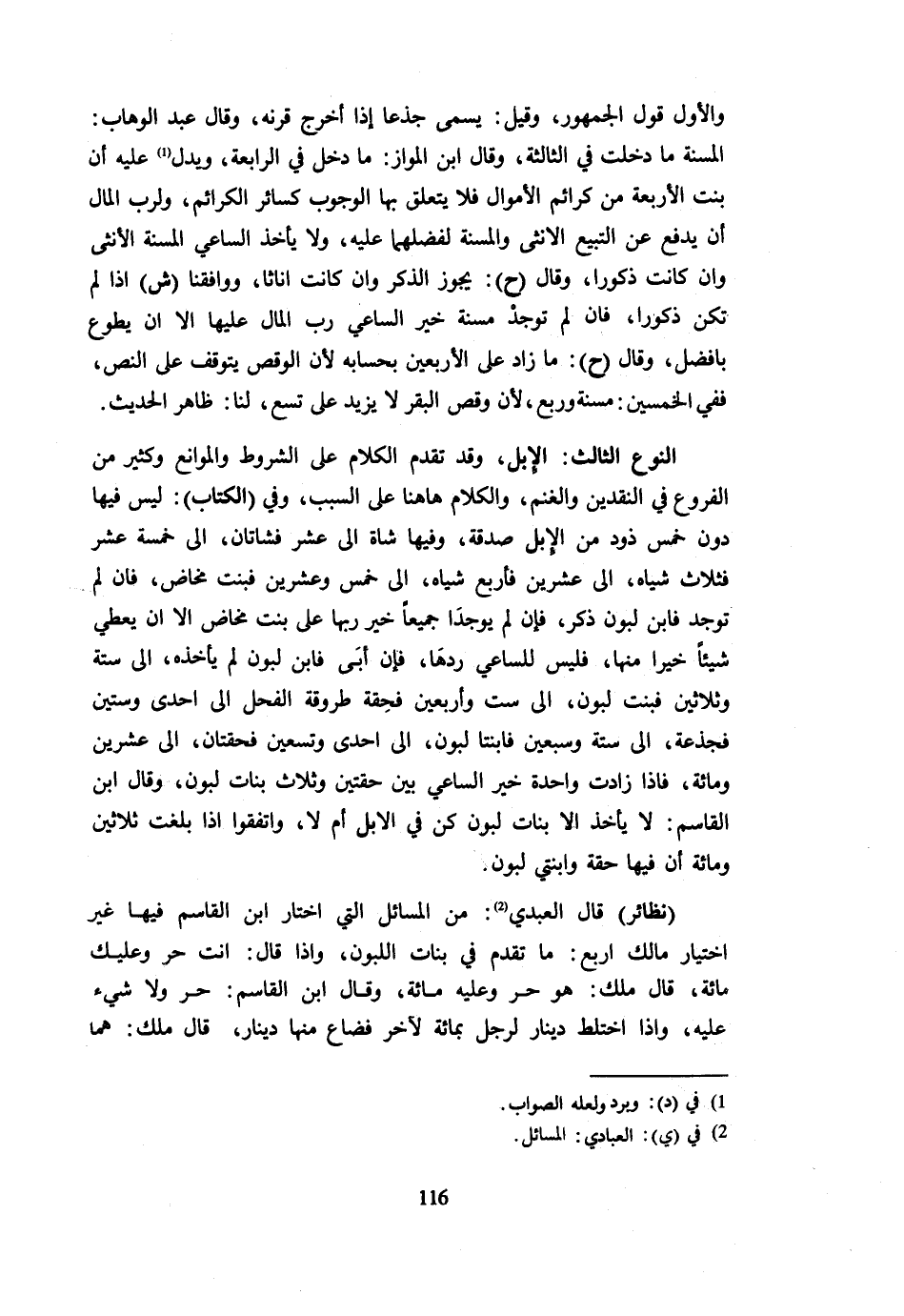 وَالْأَوَّلُ قَوْلُ الْجُمْهُورِ وَقِيلَ يُسَمَّى جَذَعًا إِذَا أَخْرَجَ قَرْنَهُ وَقَالَ عَبْدُ الْوَهَّابِ الْمُسِنَّةُ مَا دَخَلَتْ فِي الثَّالِثَةِ وَقَالَ ابْنُ الْمَوَّازِ مَا دجل فِي الرَّابِعَة وَيدل عَلَيْهِ أَنَّ بِنْتَ الْأَرْبَعَةِ مِنْ كَرَائِمِ الْأَمْوَالِ فَلَا يتَعَلَّق بهَا الْوُجُوب كَسَائِر الكرائم وَلِرَبِّ الْمَالِ أَنْ يَدْفَعَ عَنِ التَّبِيعِ الْأُنْثَى وَالْمُسِنَّةَ لِفَضْلِهِمَا عَلَيْهِ وَلَا يَأْخُذُ السَّاعِي الْمُسِنَّةَ الْأُنْثَى وَإِنْ كَانَتْ ذُكُورًا وَقَالَ ح يَجُوزُ الذَّكَرُ وَإِنْ كَانَتْ إِنَاثًا وَوَافَقَنَا ش إِذَا لَمْ تَكُنْ ذُكُورًا فَإِنْ لَمْ تُوجَدْ مُسِنَّةٌ خَيَّرَ السَّاعِي رَبَّ الْمَالِ عَلَيْهَا إِلَّا أَنْ يَطَّوَّعَ بِأَفْضَلَ وَقَالَ ح مَا زَادَ عَلَى الْأَرْبَعِينَ بِحِسَابِهِ لِأَنَّ الْوَقَصَ يَتَوَقَّفُ عَلَى النَّصِّ فَفِي الْخَمْسِينَ مُسِنَّةٌ وَرُبْعٌ لِأَنَّ وَقَصَ الْبَقَرِ لَا يَزِيدُ عَلَى تِسْعٍ لَنَا ظَاهِرُ الْحَدِيثِ النَّوْعُ الثَّالِثُ الْإِبِلُ وَقَدْ تَقَدَّمَ الْكَلَامُ عَلَى الشُّرُوطِ وَالْمَوَانِعِ وَكَثِيرٍ مِنَ الْفُرُوعِ فِي النَّقْدَيْنِ وَالْغنم وَالْكَلَام هَا هُنَا على السَّبَب وَفِي الْكتاب لَيْسَ فِيهَا دُونَ خَمْسِ ذَوْدٍ مِنَ الْإِبِلِ صَدَقَةٌ وَفِيهَا شَاةٌ إِلَى عَشْرٍ فَشَاتَانِ إِلَى خَمْسَةَ عَشَرَ فَثَلَاثُ شِيَاهٍ إِلَى عِشْرِينَ فَأَرْبَعُ شِيَاهٍ إِلَى خَمْسٍ وَعِشْرِينَ فَبِنْتُ مَخَاضٍ فَإِنْ لَمْ تُوجَدْ فَابْن لبون ذكر فَإِن يُوجَدَا جَمِيعًا خُيِّرَ رَبُّهَا عَلَى بِنْتِ مَخَاضٍ إِلَّا أَنْ يُعْطِيَ شَيْئًا خَيْرًا مِنْهَا فَلَيْسَ لِلسَّاعِي رَدُّهَا فَإِنْ أَبَى فَابْنُ لَبُونٍ لَمْ يَأْخُذْهُ إِلَى سِتَّةٍ وَثَلَاثِينَ فَبِنْتُ لَبُونٍ إِلَى سِتٍّ وَأَرْبَعِينَ فَحِقَّةٌ طَرُوقَةُ الْفَحْلِ إِلَى إِحْدَى وَسِتِّينَ فَجَذَعَةٌ إِلَى سِتَّةٍ وَسَبْعِينَ فَابْنَتَا لَبُونٍ إِلَى إِحْدَى وَتِسْعِينَ فَحِقَّتَانِ إِلَى عِشْرِينَ وَمِائَةٍ فَإِذَا زَادَتْ وَاحِدَةٌ خُيِّرَ السَّاعِي بَيْنَ حِقَّتَيْنِ وَثَلَاث بَنَات لبون قَالَ ابْنُ الْقَاسِمِ لَا يَأْخُذُ إِلَّا بَنَاتِ لَبُونٍ كُنَّ فِي الْإِبِلِ أَمْ لَا وَاتَّفَقُوا إِذَا بَلَغَتْ ثَلَاثِينَ وَمِائَةً أَنَّ فِيهَا حِقَّةٌ وَابْنَتَيْ لَبُونٍ نَظَائِرُ قَالَ الْعَبْدِيُّ مِنَ الْمَسَائِلِ الَّتِي اخْتَارَ ابْنُ الْقَاسِمِ فِيهَا غَيْرَ اخْتِيَارِ مَالِكٍ أَربع مَا تقدم فِي بَنَات اللَّبُون إِذا قَالَ أَنْت حر وَعَلَيْك مائَة قَالَ ملك هُوَ حُرٌّ وَعَلَيْهِ مِائَةٌ وَقَالَ ابْنُ الْقَاسِمِ حُرٌّ وَلَا شَيْءَ عَلَيْهِ وَإِذَا اخْتَلَطَ دِينَارٌ لِرَجُلٍ بِمِائَةٍ لِآخَرَ فَضَاعَ مِنْهَا دِينَارٌ قَالَ ملك هما