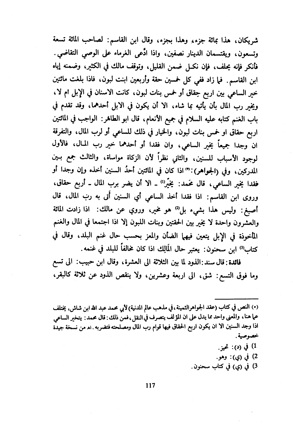 شَرِيكَانِ هَذَا بِمِائَةِ جُزْءٍ وَهَذَا بِجُزْءٍ وَقَالَ ابْنُ الْقَاسِمِ لِصَاحِبِ الْمِائَةِ تِسْعَةٌ وَتِسْعُونَ وَيَقْتَسِمَانِ الدِّينَارَ نِصْفَيْنِ وَإِذَا ادَّعَى الْغُرَمَاءُ عَلَى الْوَصِيِّ التقاضي فَأنْكر فَإِنَّهُ يَحْلِفُ فَإِنْ نَكَلَ ضَمِنَ الْقَلِيلَ وَتَوَقَّفَ مَالِكٌ فِي الْكَثِيرِ وَضَمَّنَهُ إِيَّاهُ ابْنُ الْقَاسِمِ فَمَا زَاد فَفِي كل خمسين حقة وَأَرْبَعين ابنت لَبُونٍ فَإِذَا بَلَغَتْ مِائَتَيْنِ خُيِّرَ السَّاعِي بَيْنَ أَرْبَعِ حِقَاقٍ أَوْ خَمْسِ بَنَاتِ لَبُونٍ كَانَتِ الاسنان فِي الْإِبِل أم لَا وَيُخَير رب المَال بِأَن يَأْتِيهِ بِمَا شَاءَ إِلَّا أَنْ يَكُونَ فِي الْإِبِلِ أَحَدُهُمَا وَقَدْ تَقَدَّمَ فِي بَابِ الْغَنَمِ كِتَابُهُ - صَلَّى اللَّهُ عَلَيْهِ وَسَلَّم َ - فِي جَمِيعِ الْأَنْعَامِ قَالَ أَبُو الطَّاهِرِ الْوَاجِبُ فِي الْمِائَتَيْنِ أَرْبَعُ حِقَاقٍ أَوْ خَمْسُ بَنَاتِ لَبُونٍ وَالْخِيَارُ فِي ذَلِكَ لِلسَّاعِي أَوْ لِرَبِّ الْمَالِ وَالتَّفْرِقَةُ إِنْ وُجِدَا جَمِيعًا يُخَيَّرُ السَّاعِي وَإِنْ فُقِدَا أَوْ أَحَدُهُمَا خُيِّرَ رَبُّ الْمَالِ فَالْأَوَّلُ لِوُجُودِ الْأَسْبَابِ لِلسِّنِينَ وَالثاني نَظَرًا لِأَنَّ الزَّكَاةَ مُوَاسَاةٌ وَالثَّالِثُ جَمَعَ بَيْنَ الْمُدْرَكَيْنِ وَفِي الْجَوَاهِرِ إِذَا كَانَ فِي الْمِائَتَيْنِ أَحَدُ السِّنِينَ أَخذه وَإِن وجدا أَو فقدا يُخَيّر السَّاعِي قَالَ مُحَمَّدٌ يُخَيَّرُ إِلَّا أَنْ يَضُرَّ بِرَبّ المَال أَربع حقاق وَرَوَى ابْنُ الْقَاسِمِ إِذَا فُقِدَا أَخَذَ السَّاعِي أَيَّ السِّنِينَ أَتَى بِهِ رَبَّ الْمَالِ قَالَ أَصْبَغُ وَلَيْسَ هَذَا بِشَيْءٍ بَلْ هُوَ مُخَيَّرٌ وَرُوِيَ عَنْ مَالِكٍ إِذَا زَادَتِ الْمِائَةُ وَالْعِشْرُونَ وَاحِدَةً لَا يُخَيَّرُ بَيْنَ الْحِقَّتَيْنِ وَبَنَاتِ اللَّبُونِ إِلَّا إِذَا اجْتَمَعَا فِي الْمَالِ وَالْغَنَمِ الْمَأْخُوذَةِ فِي الْإِبِلِ يَتَعَيَّنُ فِيهِمَا الضَّأْنُ وَالْمَعَزُ بِحَسَبِ حَالِ غَنَمِ الْبَلَدِ وَقَالَ فِي كِتَابِ ابْنِ سَحْنُونٍ يُعْتَبَرُ حَالُ الْمَالِكِ إِذَا كَانَ مُخَالِفًا للبلد فِي غَنَمِهِ فَائِدَةٌ قَالَ سَنَدٌ الذَّوْدُ لِمَا بَيْنِ الثَّلَاثَةِ إِلَى الْعَشْرَةِ وَقَالَ ابْنُ حَبِيبٍ إِلَى تسع وَمَا فَوق التسع شقّ إِلَى أَرْبَعَةٍ وَعِشْرِينَ وَلَا يَنْقُصُ الذَّوْدُ عَنْ ثَلَاثَة كالبقر