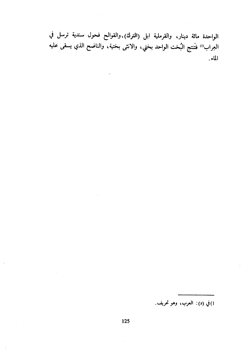 الْوَاحِدَة مائَة دِينَار والقرملية إبل التّرْك والقوالح فحول سندية ترسل فِي الْعِرَابِ فَتُنْتِجُ الْبُخْتَ الْوَاحِدُ بُخْتِيٌّ وَالْأُنْثَى بُخْتِيَّةٌ والناضح الَّذِي يسْقِي عَلَيْهِ المَاء