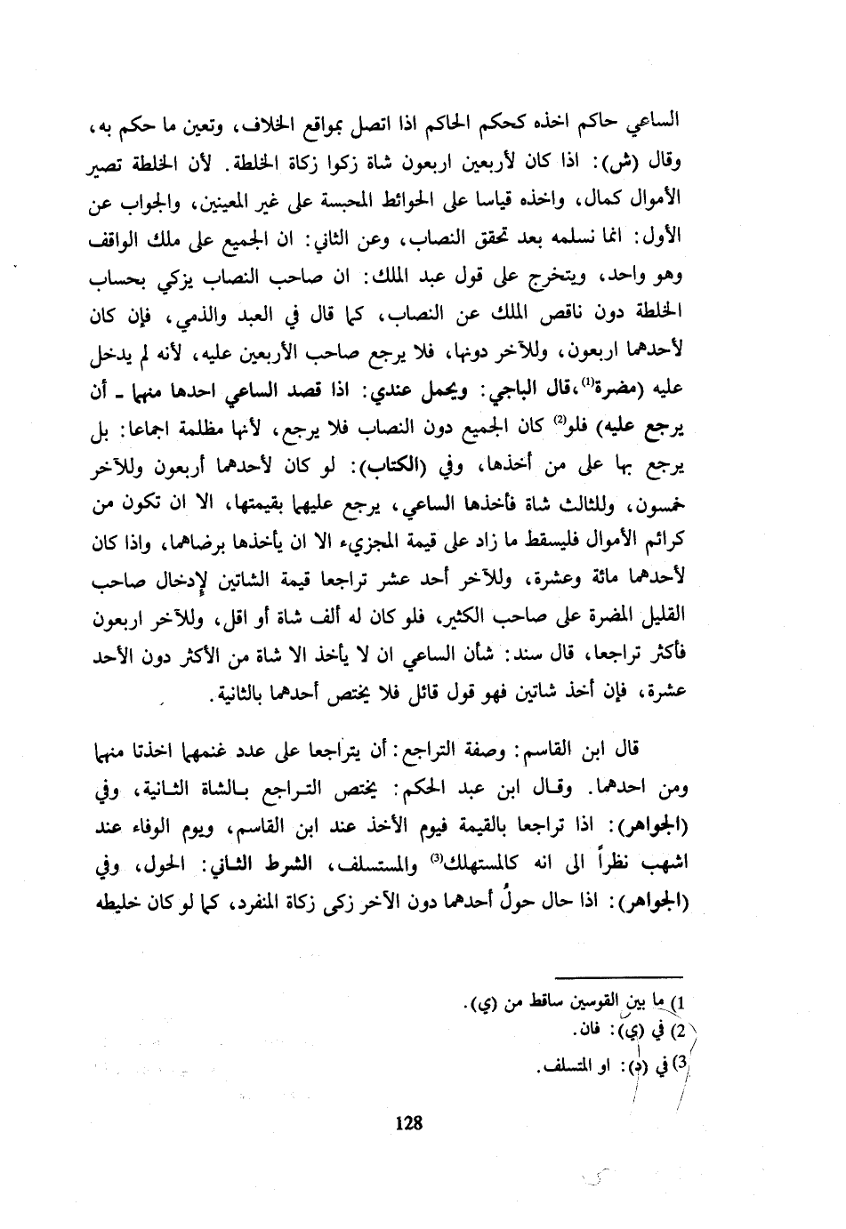 السَّاعِي حَاكِمٌ أَخَذَهُ كَحُكْمِ الْحَاكِمِ إِذَا اتَّصَلَ بِمَوَاقِعِ الْخِلَافِ وَتَعَيَّنَ مَا حَكَمَ بِهِ وَقَالَ ش إِذَا كَانَ لِأَرْبَعِينَ أَرْبَعُونَ شَاةً زُكُّوا زَكَاةَ الْخُلْطَةِ لِأَنَّ الْخُلْطَةَ تُصَيِّرُ الْأَمْوَالَ كَمَالٍ وَأَخْذُهُ قِيَاسًا عَلَى الْحَوَائِطِ الْمُحَبَّسَةِ عَلَى غَيْرِ الْمُعَيَّنِينَ وَالْجَوَابُ عَنِ الْأَوَّلِ أنَّمَا نُسَلِّمُهُ بَعْدَ تَحَقُّقِ النِّصَابِ وَعَنِ الثَّانِي أَنَّ الْجَمِيعَ عَلَى مِلْكِ الْوَاقِفِ وَهُوَ وَاحِدٌ وَيَتَخَرَّجُ عَلَى قَوْلِ عَبْدِ الْمَلِكِ أنَّ صَاحِبَ النِّصَابِ يُزَكِّي بِحِسَابِ الْخُلْطَةِ دُونَ نَاقِصِ الْمِلْكِ عَنِ النِّصَابِ كَمَا قَالَ فِي الْعَبْدِ وَالذِّمِّيِّ فَإِنْ كَانَ لِأَحَدِهِمَا أَرْبَعُونَ وَلِلْآخَرِ دُونَهَا فَلَا يَرْجِعُ صَاحِبُ الْأَرْبَعِينَ عَلَيْهِ لِأَنَّهُ لَمْ يَدْخُلْ عَلَيْهِ مَضَرَّةٌ قَالَ الْبَاجِيّ وَيحمل عِنْدِي إِذا قصد السَّاعِي أَحدهَا مِنْهُمَا أَن يرجع عَلَيْهِ فَلَو كَانَ الْجَمِيعُ دُونَ النِّصَابِ فَلَا يَرْجِعُ لِأَنَّهَا مَظْلَمَةٌ إِجْمَاعًا بَلْ يَرْجِعُ بِهَا عَلَى مَنْ أَخَذَهَا وَفِي الْكِتَابِ لَوْ كَانَ لِأَحَدِهِمَا أَرْبَعُونَ وَللْآخر خَمْسُونَ وللثالث شَاة فَأَخذهَا السَّاعِي يرجع عَلَيْهِمَا بِقِيمَتِهَا إِلَّا أَنْ تَكُونَ مِنْ كَرَائِمِ الْأَمْوَال فليسقط مَا زَاد على قيمَة المجزي إِلَّا أَنْ يَأْخُذَهَا بِرِضَاهُمَا وَإِذَا كَانَ لِأَحَدِهِمَا مائَة وَعشرَة وَللْآخر أحد عشر تَرَاجَعَا قِيمَةَ الشَّاتَيْنِ لِإِدْخَالِ صَاحِبِ الْقَلِيلِ الْمَضَرَّةَ عَلَى صَاحِبِ الْكَثِيرِ فَلَوْ كَانَ لَهُ أَلْفُ شَاةٍ أَوْ أَقَلُّ وَلِلْآخَرِ أَرْبَعُونَ فَأَكْثَرَ تَرَاجَعَا قَالَ سَنَد شَأْن السَّاعِي أَن لَا يَأْخُذ إِلَّا شَاة من الْأَكْثَر دون الْأَحَد عَشْرَةَ فَإِنْ أَخَذَ شَاتَيْنِ فَهُوَ قَوْلُ قَائِلٍ فَلَا يَخْتَصُّ أَحَدُهُمَا بالثانيةِ قَالَ ابْنُ الْقَاسِمِ وَصِفَةُ التَّرَاجُعِ أَنْ يَتَرَاجَعَا عَلَى عَدَدِ غَنَمِهِمَا أُخِذَتَا مِنْهُمَا وَمِنْ أَحَدِهِمَا وَقَالَ ابْنُ عَبْدِ الْحَكَمِ يَخْتَصُّ التَّرَاجُعُ بِالشَّاةِ الثانيةِ وَفِي الْجَوَاهِرِ إِذَا تَرَاجَعَا بِالْقِيمَةِ فَيَوْمَ الْأَخْذِ عِنْدَ ابْنِ الْقَاسِمِ وَيَوْمَ الْوَفَاءِ عِنْدَ أَشْهَبَ نَظَرًا إِلَى أَنَّهُ كَالْمُسْتَهْلِكِ وَالْمُسْتَسْلِفِ الشَّرْطُ الثَّانِي الْحَوْلُ وَفِي الْجَوَاهِرِ إِذَا حَالَ حَوْلُ أَحَدِهِمَا دُونَ الْآخَرِ زَكَّى زَكَاةَ الْمُنْفَرِدِ كَمَا لَوْ كَانَ خَلِيطَهُ