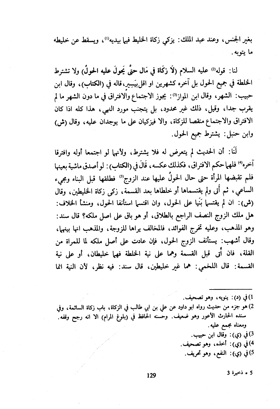 لَا زَكَاةَ فِي مَالٍ حَتَّى يَحُولَ عَلَيْهِ الْحَوْلُ وَلَا تُشْتَرَطُ الْخُلْطَةُ فِي جَمِيعِ الْحَوْلِ بَلْ آخِرِهِ كَشَهْرَيْنِ أَوْ أَقَلَّ بِيَسِيرٍ قَالَهُ فِي الْكِتَابِ وَقَالَ ابْنُ حَبِيبٍ الشَّهْرُ وَقَالَ ابْن الْمَوَّاز يجوز الِاجْتِمَاع والافتراق فِي مَا دُونَ الشَّهْرِ مَا لَمْ يَقْرُبْ جِدًّا وَقِيلَ ذَلِك غير مَحْدُود بل يتَجَنَّب مورد النَّهْي هَذَا كُلُّهُ إِذَا كَانَ الِافْتِرَاقُ وَالِاجْتِمَاعُ مُنْقِصًا لِلزَّكَاةِ وَإِلَّا فَيُزَكَّيَانِ عَلَى مَا يُوجَدَانِ عَلَيْهِ وَقَالَ ش وَابْنُ حَنْبَلٍ يُشْتَرَطُ جَمِيعُ الْحَوْلِ لَنَا أَنَّ الْحَدِيثَ لَمْ يَتَعَرَّضْ لَهُ فَلَا يُشْتَرَطُ وَلِأَنَّهُمَا لَوِ اجْتَمَعَا أَوَّلَهُ وَافْتَرَقَا آخِرَهُ فَلَهُمَا حُكْمُ الِافْتِرَاقِ فَكَذَلِكَ عَكْسُهُ قَالَ فِي الْكِتَابِ لَوْ أَصْدَقَ مَاشِيَةً بِعَيْنِهَا فَلَمْ تَقْبِضْهَا الْمَرْأَةُ حَتَّى حَالَ الْحَوْلُ عَلَيْهَا عِنْدَ الزَّوْجِ فَطَلَّقَهَا قَبْلَ الْبِنَاءِ وَمَجِيءِ السَّاعِي ثُمَّ أَتَى وَلَمْ يَقْتَسِمَاهَا أَوْ خَلَطَاهَا بَعْدَ الْقِسْمَةِ زَكَّى زَكَاةَ الْخَلِيطَيْنِ وَقَالَ ش إِنْ لَمْ يَقْتَسِمَا بَنَيَا عَلَى الْحَوْلِ وَإِنِ اقْتَسَمَا اسْتَأْنَفَا الْحَوْلَ وَمَنْشَأُ الْخِلَافِ هَلْ مِلْكُ الزَّوْجِ النِّصْفُ الرَّاجِعُ بِالطَّلَاقِ أَو هُوَ بَاقٍ عَلَى أَصْلِ مِلْكِهِ قَالَ سَنَدٌ وَهُوَ الْمَذْهَبُ وَعَلَيْهِ تُخَرَّجُ الْفَوَائِدُ فَالْمُخَالِفُ يَرَاهَا لِلزَّوْجَةِ وَالْمَذْهَبُ أَنَّهَا بَيْنَهُمَا وَقَالَ أَشْهَبُ يَسْتَأْنِفُ الزَّوْجُ الْحَوْلَ فَإِنْ عَادَتْ عَلَى أَصْلِ مِلْكِهِ لما للْمَرْأَة من الْقلَّة فَإِن أَتَى قبل الْقِسْمَة وهما غير خليطين قَالَ سَنَدٌ فِيهِ نَظَرٌ لِأَنَّ النِّيَّة إِنَّمَا