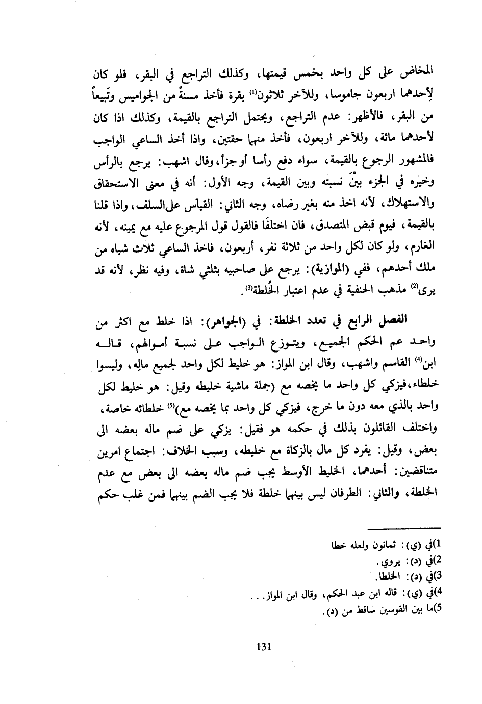 الْمَخَاضِ عَلَى كُلِّ وَاحِدٍ بِخُمْسِ قِيمَتِهَا وَكَذَلِكَ التَّرَاجُعُ فِي الْبَقْرِ فَلَوْ كَانَ لِأَحَدِهِمَا أَرْبَعُونَ جَامُوسًا وَلِلْآخَرِ ثَلَاثُونَ بَقَرَةً فَأَخَذَ مُسِنَّةً مِنَ الْجَوَامِيسِ وَتَبِيعًا مِنَ الْبَقَرِ فَالْأَظْهَرُ عَدَمُ التَّرَاجُعِ وَيُحْتَمَلُ التَّرَاجُعُ بِالْقِيمَةِ وَكَذَلِكَ إِذَا كَانَ لِأَحَدِهِمَا مِائَةٌ وَلِلْآخَرِ أَرْبَعُونَ فَأَخَذَ مِنْهُمَا حِقَّتَيْنِ وَإِذَا أَخَذَ السَّاعِي الْوَاجِبَ فَالْمَشْهُورُ الرُّجُوعُ بِالْقِيمَةِ سَوَاءٌ دفع رَأْسا أَو جزأ وَقَالَ أَشْهَبُ يَرْجِعُ بِالرَّأْسِ وَخَيَّرَهُ فِي الْجُزْءِ بَيْنَ نِسْبَتِهِ وَبَيْنَ الْقِيمَةِ وَجْهُ الْأَوَّلِ أَنَّهُ فِي مَعْنَى الِاسْتِحْقَاقِ وَالِاسْتِهْلَاكِ لِأَنَّهُ أُخِذَ مِنْهُ بِغَيْرِ رِضَاهُ وَجْهُ الثَّانِي الْقِيَاسُ عَلَى السَّلَفِ وَإِذا قُلْنَا بِالْقيمَةِ فَيوم قبض الْمُتَصَدّق فَإِنِ اخْتَلَفَا فَالْقَوْلُ قَوْلُ الْمَرْجُوعِ عَلَيْهِ مَعَ يَمِينِهِ لِأَنَّهُ الْغَارِمُ وَلَوْ كَانَ لِكُلِّ وَاحِدٍ مِنْ ثَلَاثَةِ نَفَرٍ أَرْبَعُونَ فَأَخَذَ السَّاعِي ثَلَاثَ شِيَاهٍ مِنْ مِلْكِ أَحَدِهِمْ فَفِي الْمَوَّازِيَّةِ يَرْجِعُ عَلَى صَاحِبَيْهِ بِثُلُثَيْ شَاةٍ وَفِيهِ نَظَرٌ لِأَنَّهُ قَدْ يَرَى مَذْهَبَ الْحَنَفِيَّةِ فِي عَدَمِ اعْتِبَارِ الْخلطَة الْفَصْل الرَّابِع فِي تعدد الْخلطَة فِي الْجَوَاهِرِ إِذَا خُلِطَ مَعَ أَكْثَرَ مِنْ وَاحِدٍ عَمَّ الْحُكْمُ الْجَمِيعَ وَيَتَوَزَّعُ الْوَاجِبُ عَلَى نِسْبَةِ أَمْوَالِهِمْ قَالَهُ ابْنُ الْقَاسِمِ وَأَشْهَبُ وَقَالَ ابْن الْمَوَّاز هُوَ خليط لكل وَاحِد لجَمِيع مَاله وَلَيْسوا خلطاء فيزكي كل وَاحِد مَا يَخُصُّهُ مَعَ جُمْلَةِ مَاشِيَةِ خَلِيطِهِ وَقِيلَ هُوَ خلطائه خَاصَّة وَاحِدٍ بِالَّذِي مَعَهُ دُونَ مَا خَرَجَ فَيُزَكِّي كُلَّ وَاحِدٍ بِمَا يَخُصُّهُ مَعَ خُلَطَائِهِ خَاصَّةً وَاخْتَلَفَ الْقَائِلُونَ بِذَلِكَ فِي حُكْمِهِ هُوَ فَقِيلَ يُزَكِّي عَلَى ضَمِّ مَالِهِ بَعْضِهِ إِلَى بَعْضٍ وَقِيلَ يُفْرَدُ كُلُّ مَالٍ بِالزَّكَاةِ مَعَ خَلِيطِهِ وَسَبَبُ الْخِلَافِ اجْتِمَاعُ أَمْرَيْنِ مُتَنَاقِضَيْنِ أَحَدُهُمَا الْخَلِيطُ الْأَوْسَطُ يَجِبُ ضَمُّ مَالِهِ بَعْضِهِ إِلَى بَعْضٍ مَعَ عَدَمِ الْخُلْطَةِ وَالثَّانِي الطَّرَفَانِ لَيْسَ بَيْنَهُمَا خُلْطَةٌ فَلَا يَجِبُ الضَّمُّ بَيْنَهُمَا فَمَنْ غَلَّبَ حكم