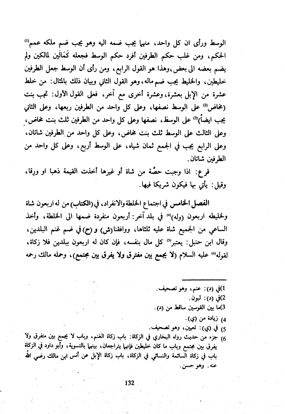الْوَسَطِ وَرَأَى أَنْ كُلَّ وَاحِدٍ مِنْهُمَا يجِبُ ضَمُّهُ إِلَيْهِ وَهُوَ يجِبُ ضَمُّ مِلْكِهِ عَمَّمَ الْحُكْمَ وَمَنْ غَلَّبَ حُكْمَ الطَّرَفَيْنِ أَفْرَدَ حُكْمَ الْوسط فَجعله كمالين لمالكين وَلَمْ يَضُمَّ بَعْضَهُ إِلَى بَعْضٍ وَهَذَا هُوَ الْقَوْلُ الرَّابِعُ وَمَنْ رَأَى أَنَّ الْوَسَطَ جَعَلَ الطَّرَفَيْنِ خَلِيطَيْنِ وَالْخَلِيطُ يجِبُ ضَمُّ مَالِهِ وَهُوَ الْقَوْلُ الثَّانِي وَبَيَانُ ذَلِكَ بِالْمِثَالِ مَنْ خَلَطَ عَشَرَةً مِنَ الْإِبِلِ بِعَشَرَةٍ وَعَشَرَةً أُخْرَى مَعَ آخَرَ فَعَلَى الْقَوْلِ الْأَوَّلِ تَجِبُ بِنْتُ مَخَاضٍ على الْوسط نصفهَا وعَلى كل وَاحِد من الطَّرَفَيْنِ رُبْعُهَا وَعَلَى الثَّانِي يجِبُ أَيْضًا عَلَى الْوسط نصفهَا وعَلى كل وَاحِد من الطَّرفَيْنِ ثُلُثُ بِنْتِ مَخَاضٍ وَعَلَى الثَّالِثِ عَلَى الْوَسَطِ ثُلُثُ بِنْتِ مَخَاضٍ وَعَلَى كُلِّ وَاحِدٍ مِنَ الطَّرفَيْنِ شَاتَان وعَلى الرَّابِع يجب فِي الْجمع ثَمَان شِيَاهٍ عَلَى الْوَسَطِ أَرْبَعٌ وَعَلَى كُلِّ وَاحِدٍ مِنَ الطَّرَفَيْنِ شَاتَانِ فَرْعٌ إِذَا وَجَبَتْ حِصَّةٌ من شَاة أَو غَيرهَا أخذت الْقِيمَةُ ذَهَبًا أَوْ وَرِقًا وَقِيلَ يَأْتِي بِهَا فَيَكُونُ شَرِيكًا فِيهَا الْفَصْلُ الْخَامِسُ فِي اجْتِمَاعِ الْخُلْطَةِ وَالِانْفِرَادُ فِي الْكِتَابِ مَنْ لَهُ أَرْبَعُونَ شَاةً وَلِخَلِيطِهِ أَرْبَعُونَ وَلَهُ فِي بَلَدٍ آخَرَ أَرْبَعُونَ مُنْفَرِدَةً ضَمَّهَا إِلَى الْخُلْطَةِ وَأَخَذَ السَّاعِي مِنَ الْجَمِيعِ شَاةً عَلَيْهِ ثُلُثَاهَا وَوَافَقَنَا ش وح ضَمِّ غَنَمِ الْبَلَدَيْنِ وَقَالَ ابْنُ حَنْبَلٍ يُعْتَبَرُ كُلُّ مَالٍ بِنَفْسِهِ فَإِنْ كَانَ لَهُ أَرْبَعُونَ ببلدين فَلَا زَكَاة لقَوْله - صَلَّى اللَّهُ عَلَيْهِ وَسَلَّم َ -