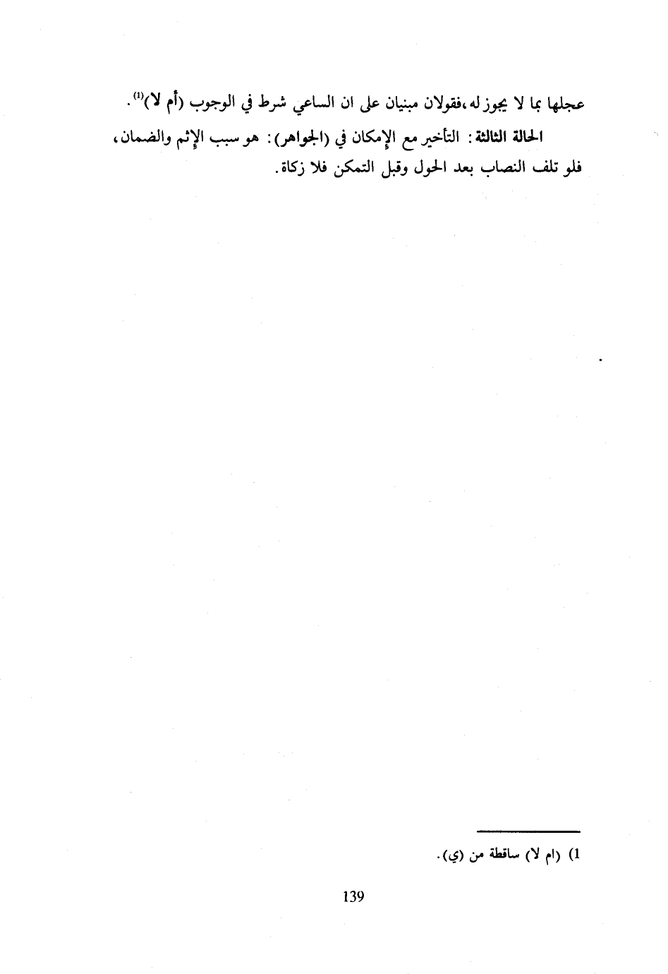 عجلها بِمَا لَا يَجُوزُ لَهُ فَقَوْلَانِ مَبْنِيَّانِ عَلَى أَنَّ السَّاعِيَ شَرْطٌ فِي الْوُجُوبِ أَمْ لَا الْحَالَةُ الثَّالِثَةُ التَّأْخِيرُ مَعَ الْإِمْكَانِ فِي الْجَوَاهِرِ هُوَ سَبَبُ الْإِثْمِ وَالضَّمَانِ فَلَوْ تَلِفَ النِّصَابُ بَعْدَ الْحَوْلِ وَقَبْلَ التَّمَكُّنِ فَلَا زَكَاةَ