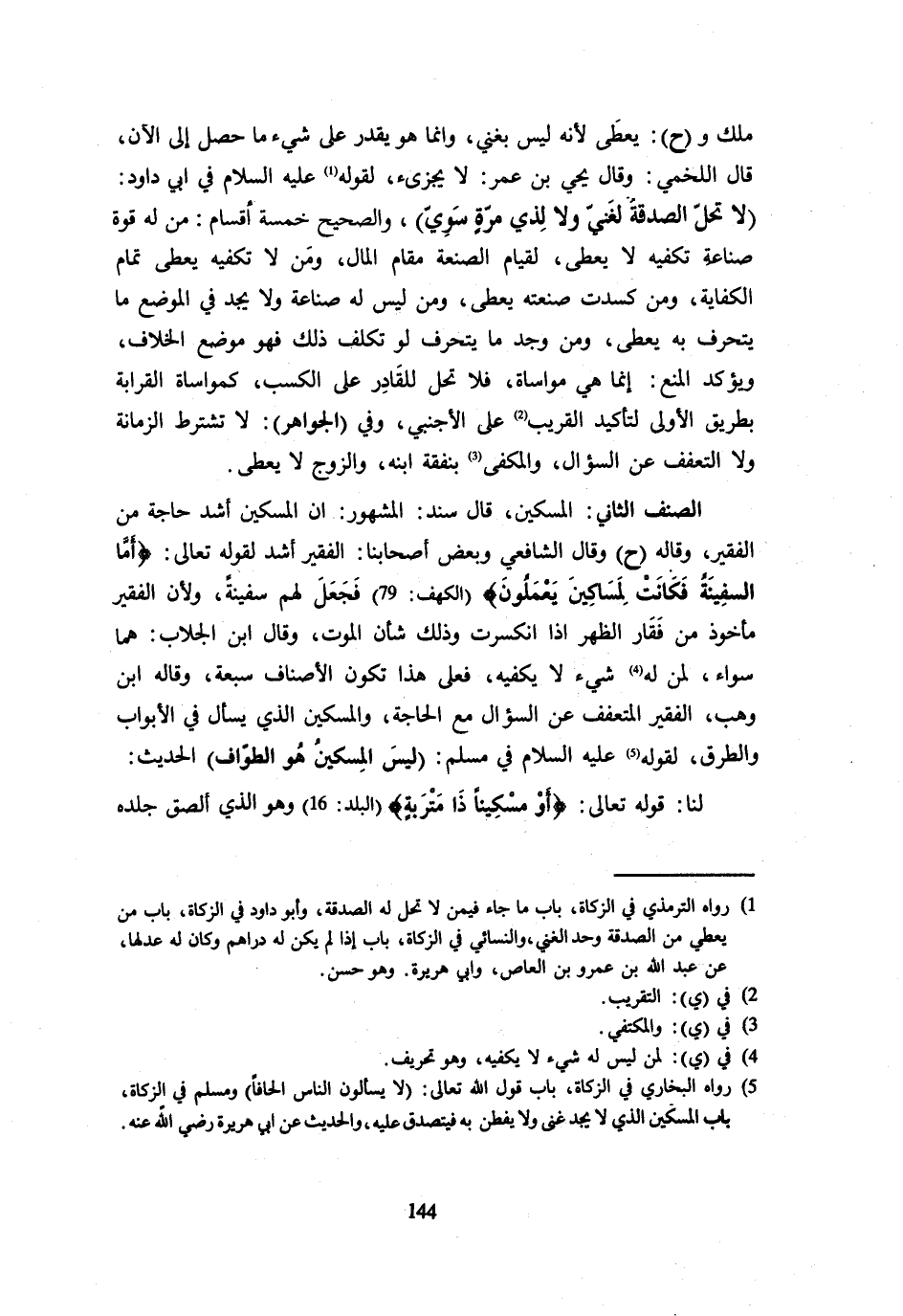 ملك وح يُعْطَى لِأَنَّهُ لَيْسَ بِغَنِيٍّ وَإِنَّمَا هُوَ يَقْدِرُ عَلَى شَيْءٍ مَا حَصَلَ إِلَى الْآنِ قَالَ اللَّخْمِيُّ وَقَالَ يَحْيَى بْنُ عُمَرَ لَا يُجْزِئُ لقَوْله - صَلَّى اللَّهُ عَلَيْهِ وَسَلَّم َ - فِي أَبِي دَاوُدَ لَا تَحِلُّ الصَّدَقَةُ لِغَنِيٍّ وَلَا لِذِي مِرَّةٍ سَوِيٌّ وَالصَّحِيحُ خَمْسَةُ أَقْسَامٍ مَنْ لَهُ قُوَّةُ صِنَاعَةٍ تَكْفِيهِ لَا يُعْطَى لِقِيَامِ الصَّنْعَةِ مَقَامَ الْمَالِ وَمَنْ لَا تَكْفِيهِ يُعْطَى تَمَامَ الْكِفَايَةِ وَمَنْ كَسَدَتْ صَنْعَتُهُ يُعْطَى وَمَنْ لَيْسَ لَهُ صِنَاعَةٌ وَلَا يَجِدُ فِي الْمَوْضِعِ مَا يَتَحَرَّفُ بِهِ يُعْطَى وَمَنْ وَجَدَ مَا يَتَحَرَّفُ لَوْ تَكَلَّفَ ذَلِكَ فَهُوَ مَوْضِعُ الْخلاف ويؤكد الْمَنْع إِنَّمَا هِيَ مُوَاسَاةٌ فَلَا تَحِلُّ لِلْقَادِرِ عَلَى الْكَسْبِ كَمُوَاسَاةِ الْقَرَابَةِ بِطَرِيقِ الْأَوْلَى لِتَأْكِيدِ الْقَرِيبِ عَلَى الْأَجْنَبِيِّ وَفِي الْجَوَاهِرِ لَا تُشْتَرَطُ الزَّمَانَةُ وَلَا التَّعَفُّفُ عَنِ السُّؤَالِ وَالْمَكْفِيُّ بِنَفَقَةِ ابْنِهِ وَالزَّوْجُ لَا يُعْطَى الصِّنْفُ الثَّانِي الْمِسْكِينُ قَالَ سَنَدٌ الْمَشْهُورُ أَنَّ الْمِسْكِينَ أَشَدُّ حَاجَةً مِنَ الْفَقِيرِ وَقَالَهُ ح وَقَالَ الشَّافِعِي وَبَعْضُ أَصْحَابِنَا الْفَقِيرُ أَشَدُّ لِقَوْلِهِ تَعَالَى {أَمَّا السَّفِينَةُ فَكَانَتْ لِمَسَاكِينَ يَعْمَلُونَ} الْكَهْف 79 فَجَعَلَ لَهُمْ سَفِينَةً وَلِأَنَّ الْفَقِيرَ مَأْخُوذٌ مِنْ فِقَارِ الظَّهْرِ إِذَا انْكَسَرَتْ وَذَلِكَ شَأْنُ الْمَوْتِ وَقَالَ ابْنُ الْجُلَّابِ هُمَا سَوَاءٌ لِمَنْ لَهُ شَيْءٌ لَا يَكْفِيهِ فعلى هَذَا تكون الْأَصْنَاف سَبْعَة وَقَالَهُ ابْنُ وَهْبٍ الْفَقِيرُ الْمُتَعَفِّفُ عَنِ السُّؤَالِ مَعَ الْحَاجَةِ وَالْمِسْكِينُ الَّذِي يَسْأَلُ فِي الْأَبْوَابِ وَالطُّرُقِ لقَوْله - صَلَّى اللَّهُ عَلَيْهِ وَسَلَّم َ - فِي مُسْلِمٍ