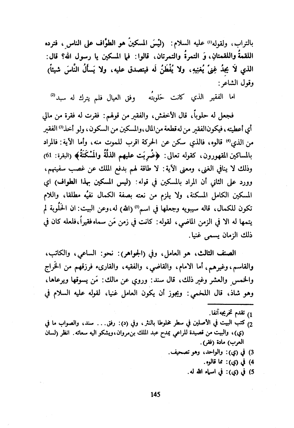 فَجعل لَهُ حلوبا قَالَ الْأَخْفَشُ وَالْفَقِيرُ مِنْ قَوْلِهِمْ فَقَرْتُ لَهُ فِقْرَةً مِنْ مَالِي أَيْ أَعْطَيْتُهُ فَيَكُونُ الْفَقِيرُ مَنْ لَهُ قِطْعَةٌ مِنَ الْمَالِ وَالْمِسْكِينُ مِنَ السُّكُونِ وَلَوْ أَخَذَ الْفَقِيرُ مِنَ الَّذِي قَالُوهُ فَالَّذِي سَكَنَ عَنِ الْحَرَكَةِ أَقْرَبُ لِلْمَوْتِ مِنْهُ وَأما الْآيَة فَالْمُرَاد بالمساكين المقهورون كَقَوْلِه تَعَالَى {ضربت عَلَيْهِمُ الذِّلَّةُ وَالْمَسْكَنَةُ} الْبَقَرَة 61 وَذَلِكَ لَا يُنَافِي الْغِنَى وَمَعْنَى الْآيَةِ لَا طَاقَةَ لَهُمْ بِدَفْعِ الْملك عَن غصب سفينهم وَورد عل الثَّانِي أَنَّ الْمُرَادَ بِالْمِسْكِينِ فِي قَوْلِهِ لَيْسَ الْمِسْكِينُ بِهَذَا الطَّوَّافِ أَيِ الْمِسْكِينِ الْكَامِلِ الْمَسْكَنَةِ وَلَا يلْزم من نَعته بِصفة الْكَمَالِ نَفْيُهُ مُطْلَقًا وَاللَّامُ تَكُونُ لِلْكَمَالِ قَالَهُ سِيبَوَيْهِ وَجَعَلَهَا فِي اسْمِ اللَّهِ لَهُ وَعَنِ الْبَيْت إِن الحلوبة لم يُتمهَا لَهُ إِلَّا فِي الزَّمَنِ الْمَاضِي لِقَوْلِهِ كَانَتْ فِي زَمَنِ مَنْ سَمَّاهُ فَقِيرًا فَلَعَلَّهُ كَانَ فِي ذَلِك الزَّمَان غَنِيًّا الصِّنْفُ الثَّالِثُ هُوَ الْعَامِلُ وَفِي الْجَوَاهِرِ نَحْوُ السَّاعِي وَالْكَاتِبِ وَالْقَاسِمِ وَغَيْرِهِمْ أَمَّا الْإِمَامُ وَالْقَاضِي وَالْفَقِيهُ وَالْقَارِئُ فَرِزْقُهُمْ مِنَ الْخَرَاجِ وَالْخُمْسِ وَالْعُشْرِ وَغَيْرِ ذَلِكَ قَالَ سَنَدٌ وَرُوِيَ عَنْ مَالِكٍ مَنْ يَسُوقُهَا وَيَرْعَاهَا وَهُوَ شَاذٌّ قَالَ اللَّخْمِيُّ وَيَجُوزُ أَنْ يَكُونَ الْعَامِلُ غَنِيًّا لِقَوْلِهِ - صَلَّى اللَّهُ عَلَيْهِ وَسَلَّم َ - فِي