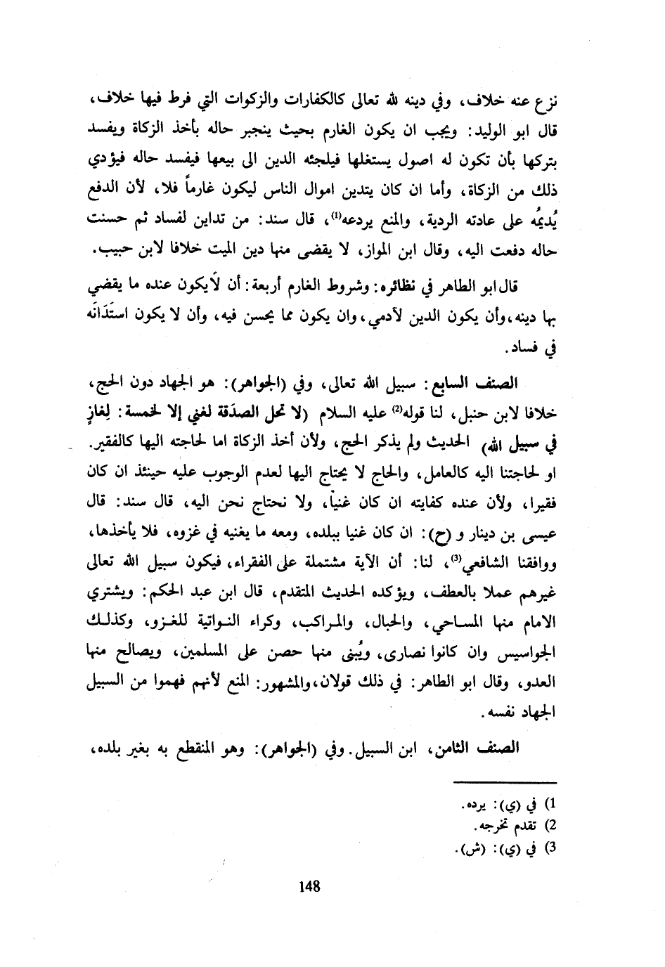 لَا تَحِلُّ الصَّدَقَةُ لِغَنِيٍّ إِلَّا لِخَمْسَةٍ لِغَازٍ فِي سَبِيلِ اللَّهِ الْحَدِيثَ وَلَمْ يَذْكُرِ الْحَجَّ وَلِأَنَّ آخذ الزَّكَاةِ إِمَّا لِحَاجَتِهِ إِلَيْهَا كَالْفَقِيرِ أَوْ لِحَاجَتِنَا إِلَيْهِ كَالْعَامِلِ وَالْحَاجُّ لَا يَحْتَاجُ إِلَيْهَا لِعَدَمِ الْوُجُوبِ عَلَيْهِ حِينَئِذٍ إِنْ كَانَ فَقِيرًا وَلِأَنَّ عِنْدَهُ كِفَايَتَهُ إِنْ كَانَ غَنِيًّا وَلَا نَحْتَاجُ نَحْنُ إِلَيْهِ قَالَ سَنَدٌ قَالَ عِيسَى بن دِينَار وح إِن كَانَ غَنِيا بِبَلَدِهِ وَمَعَهُ مَا يُغْنِيه فِي غَزوه فَلَا يَأْخُذهَا ووافقنا الشَّافِعِي لَنَا أَنَّ الْآيَةَ مُشْتَمِلَةٌ عَلَى الْفُقَرَاءِ فَيَكُونُ سَبِيلُ اللَّهِ تَعَالَى غَيْرُهُمْ عَمَلًا بِالْعَطْفِ وَيُؤَكِّدُهُ الْحَدِيثُ الْمُتَقَدِّمُ قَالَ ابْنُ عَبْدِ الْحَكَمِ وَيَشْتَرِي الإِمَام مِنْهَا الْمساحِي والحبال وَالْمَرَاكِبَ وَكِرَاءَ النَّوَاتِيَّةِ لِلْغَزْوِ وَكَذَلِكَ الْجَوَاسِيسُ وَإِنْ كَانُوا نَصَارَى وَيُبْنَى مِنْهَا حِصْنٌ عَلَى الْمُسْلِمِينَ وَيُصَالِحُ مِنْهَا الْعَدُوَّ وَقَالَ أَبُو الطَّاهِرِ فِي ذَلِكَ قَوْلَانِ وَالْمَشْهُورُ الْمَنْعُ لِأَنَّهُمْ فَهِمُوا مِنَ السَّبِيل الْجِهَاد نَفسه الصِّنْف الثّمن ابْنُ السَّبِيلِ وَفِي الْجَوَاهِرِ وَهُوَ الْمُنْقَطِعُ بِهِ بِغَيْر بَلَده