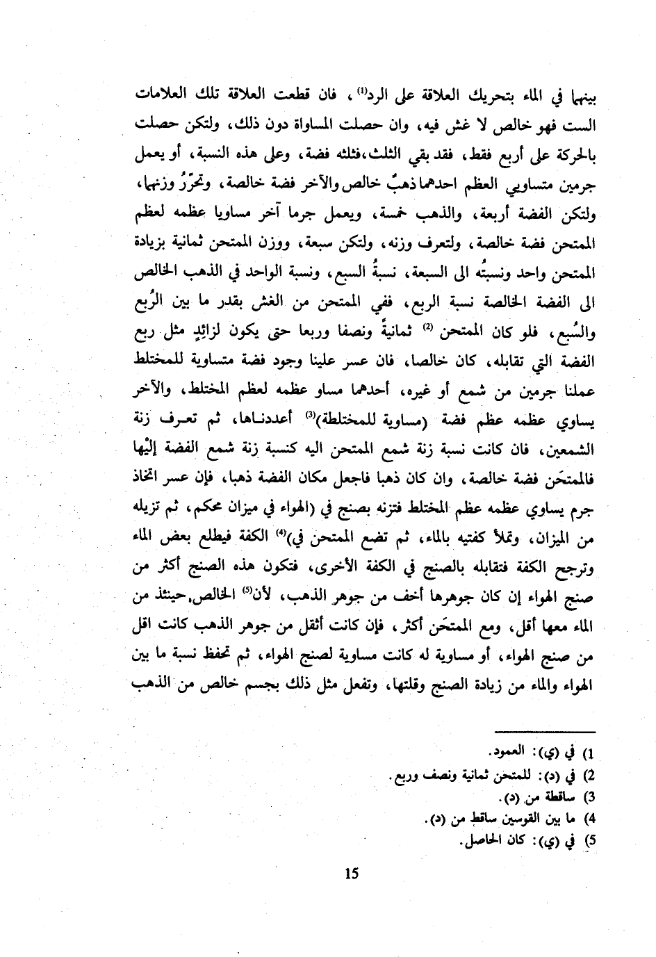 بَيْنَهُمَا فِي الْمَاءِ بِتَحْرِيكِ الْعِلَاقَةِ عَلَى الرَّدِّ فَإِنْ قَطَعَتِ الْعِلَاقَةُ تِلْكَ الْعَلَامَاتِ السِّتَّ فَهُوَ خَالِصٌ لَا غِشَّ فِيهِ وَإِنْ حَصَلَتِ الْمُسَاوَاةُ دُونَ ذَلِكَ وَلْتَكُنْ حَصَلَتْ بِالْحَرَكَةِ عَلَى أَرْبَعٍ فَقَطْ فَقَدْ بَقِيَ الثُّلُثُ فَثُلُثُهُ فِضَّةٌ وَعَلَى هَذِهِ النِّسْبَةِ أَوْ يَعْمَلُ جِرْمَيْنِ مُتَسَاوِيَيِ الْعَظْمِ أَحدهمَا ذهب خَالص وَالْآخر فضَّة خَالِصَة وتحرر وَزْنَهُمَا وَلْتَكُنِ الْفِضَّةُ أَرْبَعَةً وَالذَّهَبُ خَمْسَةً وَيَعْمَلُ جِرْمًا آخَرَ مُسَاوِيًا عَظْمُهُ لِعَظْمِ الْمُمْتَحَنِ فِضَّةً خَالِصَةً وَلِتَعْرِفْ وَزْنَهُ وَلْتَكُنْ سَبْعَةً وَوَزْنُ الْمُمْتَحَنِ ثَمَانِيَة بِزِيَادَة الممتحن وَاحِد ونسبته الى السَّبْعَة نِسْبَةُ السُّبْعِ وَنِسْبَةُ الْوَاحِدِ فِي الذَّهَبِ الْخَالِصِ إِلَى الْفِضَّةِ الْخَالِصَةِ نِسْبَةُ الرُّبُعِ فَفِي الْمُمْتَحَنِ مِنَ الْغِشِّ بِقَدْرِ مَا بَيْنَ الرُّبُعِ وَالسُّبُعِ فَلَوْ كَانَ الْمُمْتَحَنُ ثَمَانِيَةً وَنِصْفًا وَرُبْعًا حَتَّى يكون لزائد مِثْلَ رُبُعِ الْفِضَّةِ الَّتِي تُقَابِلُهُ كَانَ خَالِصًا فَإِنْ عَسُرَ عَلَيْنَا وُجُودُ فِضَّةٍ مُتَسَاوِيَةٍ لِلْمُخْتَلِطِ عَمِلْنَا جِرْمَيْنِ مِنْ شَمْعٍ أَوْ غَيْرِهِ أَحَدُهُمَا مسَاوٍ عظمه لعظم المختلظ وَالْآخَرُ يُسَاوِي عَظْمُهُ عَظْمَ فِضَّةٍ مُسَاوِيَةٍ لِلْمُخْتَلِطَةِ أَعْدَدْنَاهَا ثُمَّ تَعْرِفُ زِنَةَ الشَّمْعَيْنِ فَإِنْ كَانَتْ نِسْبَةُ زِنَةِ شَمْعِ الْمُمْتَحَنِ إِلَيْهِ كَنِسْبَةِ زِنَةِ شَمْعِ الْفِضَّةِ إِلَيْهَا فَالْمُمْتَحَنُ فِضَّةٌ خَالِصَةٌ وَإِنْ كَانَ ذَهَبًا فَاجْعَلْ مَكَانَ الْفِضَّةِ ذَهَبًا فَإِنَّ عسر اتِّخَاذ جرم يُسَاوِي عظمه عَظْمَ الْمُخْتَلِطِ فَتَزِنُهُ بِصَنْجٍ فِي الْهَوَاءِ فِي مِيزَانٍ مُحْكَمٍ ثُمَّ تُزِيلُهُ مِنَ الْمِيزَانِ وَتَمْلَأُ كِفَّتَيْهِ بِالْمَاءِ ثُمَّ تَضَعُ الْمُمْتَحَنَ فِي الْكِفَّةِ فَيَطْلَعُ بَعْضُ الْمَاءِ وَتُرَجِّحُ الْكِفَّةَ فَتُقَابِلُهُ بِالصَّنْجِ فِي الْكِفَّةِ الْأُخْرَى فَتَكُونُ هَذِهِ الصَّنْجُ أَكْثَرَ مِنْ صَنْجِ الْهَوَاءِ إِنْ كَانَ جَوْهَرُهَا أَخَفَّ مِنْ جَوْهَرِ الذَّهَبِ لِأَنَّ الْخَالِصَ حِينَئِذٍ مِنَ الْمَاءِ مَعَهَا أَقَلُّ وَمَعَ الْمُمْتَحَنِ أَكْثَرُ فَإِنْ كَانَتْ أَثْقَلَ مِنْ جَوْهَرِ الذَّهَبِ كَانَتْ أَقَلَّ مِنْ صَنْجِ الْهَوَاءِ أَوْ مُسَاوِيَةً لَهُ كَانَتْ مُسَاوِيَةً لِصَنْجِ الْهَوَاءِ ثُمَّ تَحْفَظُ نِسْبَةَ مَا بَيْنَ الْهَوَاءِ وَالْمَاءِ مِنْ زِيَادَةِ الصَّنْجِ وَقِلَّتِهَا وَتَفْعَلُ مِثْلَ ذَلِكَ بِجِسْمٍ خَالِصٍ مِنَ الذَّهَبِ