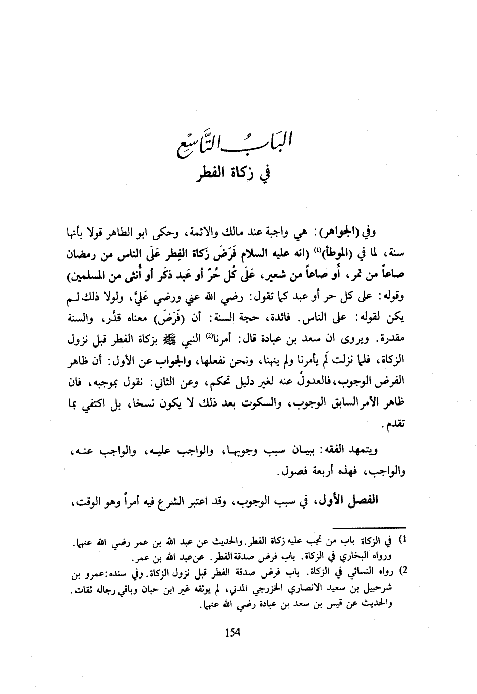 وَفِي الْجَوَاهِرِ هِيَ وَاجِبَةٌ عِنْدَ مَالِكٍ وَالْأَئِمَّةِ وَحَكَى أَبُو الطَّاهِرِ قَوْلًا بِأَنَّهَا سُنَّةٌ لِمَا فِي الْمُوَطَّأِ أَنَّهُ - صَلَّى اللَّهُ عَلَيْهِ وَسَلَّم َ - فَرَضَ زَكَاةَ الْفِطْرِ عَلَى النَّاسِ مِنْ رَمَضَانَ صَاعًا مِنْ تَمْرٍ أَوْ صَاعًا مِنْ شَعِيرٍ عَلَى كُلِّ حُرٍّ أَوْ عَبْدٍ ذَكَرٍ أَوْ أُنْثَى مِنَ الْمُسْلِمِينَ وَقَوْلُهُ عَلَى كُلِّ حُرٍّ أَوْ عَبْدٍ كَمَا تَقُولُ رَضِيَ اللَّهُ عَنِّي وَرَضِيَ عَلَيَّ وَلَوْلَا ذَلِكَ لَمْ يَكُنْ لِقَوْلِهِ عَلَى النَّاسِ فَائِدَةٌ حُجَّةُ السُّنَّةِ أَنَّ فَرَضَ مَعْنَاهُ قَدَّرَ وَالسُّنَّةُ مُقَدَّرَّةٌ وَيُرْوَى أَنَّ سَعْدَ بْنَ عُبَادَةَ قَالَ أَمَرَنَا النَّبِيُّ - صَلَّى اللَّهُ عَلَيْهِ وَسَلَّم َ - بِزَكَاةِ الْفِطْرِ قَبْلَ نُزُولِ الزَّكَاةِ فَلَمَّا نَزَلَتْ لَمْ يَأْمُرْنَا وَلَمْ يَنْهَنَا وَنَحْنُ نَفْعَلُهَا وَالْجَوَابُ عَنِ الْأَوَّلِ أَنَّ ظَاهِرَ الْفَرْضِ الْوُجُوبُ فَالْعُدُولُ عَنْهُ لِغَيْرِ دَلِيلٍ تَحَكُّمٌ وَعَنِ الثَّانِي نَقُولُ بِمُوجِبِهِ فَإِنَّ ظَاهِرَ الْأَمْرِ السَّابِقِ الْوُجُوبُ وَالسُّكُوتُ بَعْدَ ذَلِكَ لَا يَكُونُ نَسْخًا بَلِ اكْتُفِيَ بِمَا تَقَدَّمَ وَيَتَمَهَّدُ الْفِقْهُ بِبَيَانِ سَبَبِ وُجُوبِهَا وَالْوَاجِبُ عَلَيْهِ وَالْوَاجِبُ عَنْهُ وَالْوَاجِبُ فَهَذِهِ أَرْبَعَةُ فُصُولٌ الْفَصْلُ الْأَوَّلُ فِي سَبَبِ الْوُجُوبِ وَقَدِ اعْتبر الشَّرْع فِيهِ أمرا وَهُوَ الْوَقْت