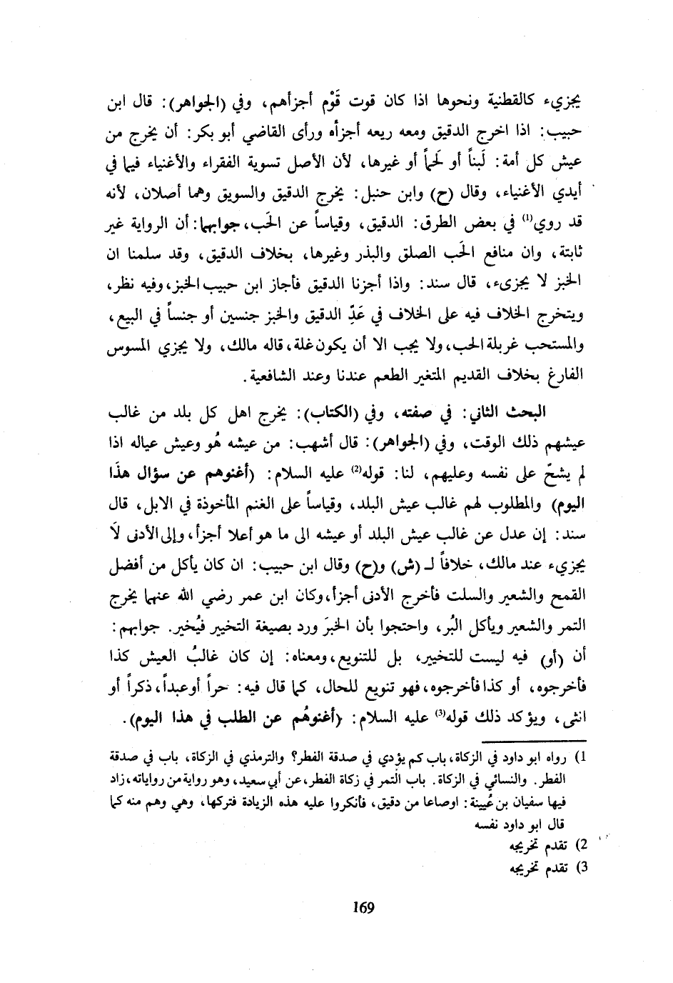 أَغْنُوهُمْ عَنْ سُؤَالِ هَذَا الْيَوْمَ وَالْمَطْلُوبُ لَهُمْ غَالِبُ عَيْشِ الْبَلَدِ وَقِيَاسًا عَلَى الْغَنَمِ الْمَأْخُوذِ فِي الْإِبِلِ قَالَ سَنَدٌ إِنْ عَدَلَ عَنْ غَالِبِ عَيْشِ الْبَلَدِ أَوْ عَيْشِهِ إِلَى مَا هُوَ أعلا أَجْزَأَ وَإِلَى الْأَدْنَى لَا يُجْزِئُ عِنْدَ مَالِكٍ خلافًا ل ش وح وَقَالَ ابْنُ حَبِيبٍ إِنْ كَانَ يَأْكُلُ مِنْ أَفْضَلِ الْقَمْحِ وَالشَّعِيرِ وَالسَّلْتِ فَأَخْرَجَ الْأَدْنَى أَجْزَأَ وَكَانَ ابْنُ عُمَرَ رَضِيَ اللَّهُ عَنْهُمَا يُخْرِجُ التَّمْرَ وَالشَّعِيرَ وَيَأْكُلُ الْبُرَّ وَاحْتَجُّوا بِأَنَّ الْخَبَرَ وَرَدَ بِصِيغَةِ التَّخْيِيرِ فَيُخَيَّرُ جَوَابُهُمْ أَنَّ أَوْ فِيهِ لَيْسَتْ لِلتَّخْيِيرِ بَلْ لِلتَّنْوِيعِ وَمَعْنَاهُ إِنْ كَانَ غَالب الْعَيْش كَذَا فأخرجوه أَو كَذَا فَأَخْرَجُوهُ فَهُوَ تَنْوِيعٌ لِلْحَالِ كَمَا قَالَ فِيهِ حرا أَو عبدا ذكرا أَو أُنْثَى وَيُؤَكِّدُ ذَلِكَ قَوْلُهُ - صَلَّى اللَّهُ عَلَيْهِ وَسَلَّم َ -