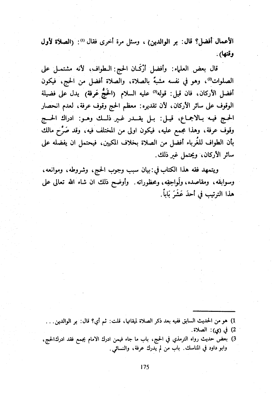 الْحَجُّ عَرَفَةُ يَدُلُّ عَلَى فَضِيلَةِ الْوُقُوفِ عَلَى سَائِرِ الْأَرْكَانِ لِأَنَّ تَقْدِيرَهُ مُعْظَمُ الْحَجِّ وُقُوفُ عَرَفَةَ لِعَدَمِ انْحِصَارِ الْحَجِّ فِيهِ بِالْإِجْمَاعِ قِيلَ بَلْ يُقَدَّرُ غَيْرُ ذَلِكَ وَهُوَ إِدْرَاكُ الْحَجِّ وُقُوفُ عَرَفَةَ وَهَذَا مُجْمَعٌ عَلَيْهِ فَيَكُونُ أَوْلَى مِنَ الْمُخْتَلَفِ فِيهِ وَقَدْ صَرَّحَ مَالِكٌ بِأَنَّ الطَّوَافَ لِلْغُرَبَاءِ أَفْضَلُ مِنَ الصَّلَاةِ بِخِلَافِ الْمَكِّيِّينَ فَيُحْتَمَلُ أَنْ يُفَضِّلَهُ عَلَى سَائِرِ الْأَرْكَانِ وَيُحْتَمَلُ غَيْرُ ذَلِكَ وَيَتَمَهَّدُ فِقْهُ هَذَا الْكِتَابِ فِي بَيَانِ سَبَبِ وُجُوبِ الْحَجِّ وَشُرُوطِهِ وَمَوَانِعِهِ وَسَوَابِقِهِ وَمَقَاصِدِهِ وَلَوَاحِقِهِ وَمَحْظُورَاتِهِ وَأُوَضِّحُ ذَلِكَ إِنْ شَاءَ اللَّهُ تَعَالَى عَلَى هَذَا التَّرْتِيبِ فِي أَحَدَ عشر بَابا