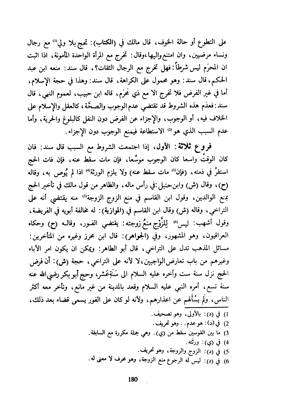 عَلَى التَّطَوُّعِ أَوْ حَالَةِ الْخَوْفِ قَالَ مَالِكٌ فِي الْكِتَابِ تَحُجُّ بِلَا وَلِيٍّ مَعَ رِجَالٍ وَنسَاء مرضيين وَإِن امْتنع واليها وَقَالَ تَخْرُجُ مَعَ الْمَرْأَةِ الْوَاحِدَةِ الْمَأْمُونَةِ إِذَا اثْبتْ أَن الْحرم لَيْسَ شَرْطًا فَهَلْ تَخْرُجُ مَعَ الرِّجَالِ الثِّقَاتِ قَالَ سَنَدٌ مَنَعَهُ ابْنُ عَبْدِ الْحَكَمِ قَالَ سَنَدٌ وَهُوَ مَحْمُولٌ عَلَى الْكَرَاهَةِ قَالَ سَنَدٌ وَهَذَا فِي حُجَّةِ الْإِسْلَامِ أَمَّا فِي غَيْرِ الْفَرْضِ فَلَا تَخْرُجُ إِلَّا مَعَ ذِي مَحْرَمٍ قَالَه ابْنُ حَبِيبٍ لِعُمُومِ النَّهْيِ قَالَ سَنَدٌ فَعَدَمُ هَذِهِ الشُّرُوطِ قَدْ تَقْتَضِي عَدَمَ الْوُجُوبِ وَالصِّحَّةِ كَالْعَقْلِ وَالْإِسْلَامِ عَلَى الْخِلَافِ فِيهِ أَوِ الْوُجُوبَ وَالْإِجْزَاءَ عَنِ الْفَرْضِ دُونَ النَّفْلِ كَالْبُلُوغِ وَالْحُرِّيَّةِ وَأَمَّا عَدَمُ السَّبَبِ الَّذِي هُوَ الِاسْتِطَاعَةُ فَيَمْنَعُ الْوُجُوبَ دُونَ الْإِجْزَاءِ فُرُوعٌ ثَلَاثَةٌ الْأَوَّلُ إِذَا اجْتَمَعَتِ الشُّرُوطُ مَعَ السَّبَبِ قَالَ سَنَدٌ فَإِنْ كَانَ الْوَقْتُ وَاسِعًا كَانَ الْوُجُوبُ مُوَسَّعًا فَإِنْ مَاتَ سَقَطَ عَنْهُ فَإِنْ فَاتَ الْحَجُّ اسْتَقَرَّ فِي ذِمَّتِهِ فَإِنْ مَاتَ سَقَطَ عَنْهُ وَلَا يَلْزَمُ الْوَرَثَةُ إِذَا لَمْ يُوصَ بِهِ وَقَالَهُ ح وَقَالَ ش وَابْنُ حَنْبَلٍ فِي رَأْسِ مَالِهِ وَالظَّاهِرُ مِنْ قَوْلِ مَالِكٍ فِي تَأْخِيرِ الْحَجِّ بِمَنْعِ الْوَالِدَيْنِ وَقَوْلِ ابْنِ الْقَاسِمِ فِي مَنْعِ الزَّوْجِ الزَّوْجَةَ مِنْهُ يَقْتَضِي أَنَّهُ عَلَى التَّرَاخِي وَقَالَهُ ش وَقَالَ ابْنُ الْقَاسِمِ فِي الْمَوَّازِيَّةِ لَهُ مُخَالَفَةُ أَبَوَيْهِ فِي الْفَرِيضَةِ وَقَوْلُ أَشْهَبَ لَيْسَ لِلزَّوْجِ مَنْعُ زَوْجَتِهِ يَقْتَضِي الْفَوْرَ وَقَالَهُ ح وَحَكَاهُ الْعِرَاقِيُّونَ وَهُوَ الْمَشْهُورُ وَفِي الْجَوَاهِرِ قَالَ ابْنُ مُحْرِزٍ وَغَيْرُهُ مِنَ الْمُتَأَخِّرِينَ مَسَائِلُ الْمَذْهَبِ تَدُلُّ عَلَى التَّرَاخِي قَالَ أَبُو الطَّاهِرِ وَيُمْكِنُ أَنْ يَكُونَ أَمْرُ الْآبَاءِ وَغَيْرُهُمْ مِنْ بَابِ تَعَارُضِ الْوَاجِبَيْنِ لَا لِأَنَّهُ عَلَى التَّرَاخِي حُجَّةُ ش أَنَّ فَرْضَ الْحَجِّ نَزَلَ سنة سِتّ وأخره - صَلَّى اللَّهُ عَلَيْهِ وَسَلَّم َ - إِلَى سَنَةِ عَشْرٍ وَحَجَّ أَبُو بَكْرٍ رَضِيَ الله عَنهُ سنة تسع أمره النَّبِي - صَلَّى اللَّهُ عَلَيْهِ وَسَلَّم َ - وَقَعَدَ بِالْمَدِينَةِ مِنْ غَيْرِ مَانِعٍ وَتَأَخَّرَ مَعَهُ أَكْثَرُ النَّاسِ وَلَمْ يَسْأَلْهُمْ عَنْ أَعْذَارِهِمْ وَلِأَنَّهُ لَوْ كَانَ عَلَى الْفَوْرِ يُسَمَّى قَضَاءً بَعْدَ ذَلِك