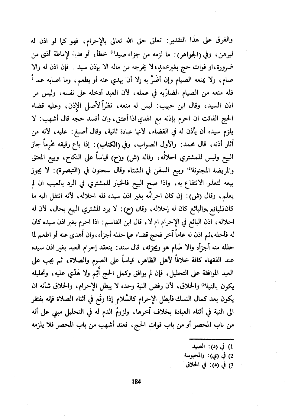 وَالْفَرْقُ عَلَى هَذَا التَّقْدِيرِ تَعَلُّقُ حَقِّ اللَّهِ تَعَالَى بِالْإِحْرَامِ فَهُوَ كَمَا لَوْ أُذِنَ لَهُ لِيُرْهِنَ وَفِي الْجَوَاهِرِ مَا لَزِمَهُ مِنْ جَزَاءِ صَيْدٍ خَطَأٍ أَوْ فِدْيَةٍ لِإِمَاطَةِ أَذًى مِنْ ضَرُورَةٍ أَوْ فَوَاتِ حَجٍّ بِغَيْرِ عَمْدٍ لَا يُخرجهُ من مَاله إِلَّا بِإِذن سيد فَإِنْ أُذِنَ لَهُ وَإِلَّا صَامَ وَلَا يَمْنَعُهُ الصِّيَامُ وَإِنْ أَضَرَّ بِهِ إِلَّا أَنْ يَهْدِيَ عَنْهُ أَوْ يُطْعِمَ وَمَا أَصَابَهُ عَمْدًا فَلَهُ مَنعه من الصّيام الضاربة فِي عَمَلِهِ لِأَنَّ الْعَبْدَ أَدْخَلَهُ عَلَى نَفْسِهِ وَلَيْسَ مر إِذْنِ السَّيِّدِ وَقَالَ ابْنُ حَبِيبٍ لَيْسَ لَهُ مَنْعُهُ نَظَرًا لِأَصْلِ الْإِذْنِ وَعَلَيْهِ قَضَاءُ الْحَجِّ الْفَائِتِ إِنْ أَحْرَمَ بِإِذْنِهِ مَعَ الْهَدْيِ إِذَا أَعْتَقَ وَإِنْ أَفْسَدَ حَجَّهُ قَالَ أَشْهَبُ لَا يلْزم سَنَده أَنْ يَأْذَنَ لَهُ فِي الْقَضَاءِ لِأَنَّهَا عِبَادَةٌ ثَانِيَةٌ وَقَالَ أَصْبَغُ عَلَيْهِ لِأَنَّهُ مِنْ آثَارِ إِذْنِهِ قَالَ مُحَمَّدٌ وَالْأَوَّلُ الصَّوَابُ وَفِي الْكِتَابِ إِذَا بَاعَ رَقِيقَهُ مُحْرِمًا جَازَ الْبَيْعُ وَلَيْسَ للْمُشْتَرِي إحلالا وَقَالَ ش وح قِيَاسًا عَلَى النِّكَاحِ وَبَيْعِ الْمُعْتَقِ وَالْمَرِيضَةِ الْمَجْنُونَةِ وَبَيْعِ السُّفُنِ فِي الشِّتَاءِ وَقَالَ سَحْنُونٌ فِي التَّبْصِرَةِ لَا يَجُوزُ بَيْعُهُ لِتَعَذُّرِ الِانْتِفَاعِ بِهِ وَإِذَا صَحَّ الْبَيْعُ فَالْخِيَارُ لِلْمُشْتَرِي فِي الرَّدِّ بِالْعَيْبِ إِنْ لَمْ يَعْلَمْ وَقَالَ ش إِنْ كَانَ إِحْرَامُهُ بِغَيْرِ إِذْنِ سَيِّدِهِ فَلَهُ إِحْلَالُهُ لِأَنَّهُ انْتَقَلَ إِلَيْهِ مَا كَانَ لِلْبَائِعِ وَالْبَائِعُ كَانَ لَهُ إِحْلَالُهُ وَقَالَ ح لَا يَرُدُّ الْمُشْتَرِي الْبَيْعَ بِحَالٍ لِأَنَّ لَهُ إِحْلَالَهُ أَذِنَ الْبَائِعُ فِي الْإِحْرَامِ أَمْ لَا قَالَ ابْنُ الْقَاسِمِ إِذَا أَحْرَمَ بِغَيْرِ إِذَنِ سَيِّدِهِ كَانَ لَهُ فَأَحَلَّهُ ثُمَّ أَذِنَ لَهُ عَامًا آخَرَ فَحَجَّ قَضَاءً عَمَّا حَلَّلَهُ أَجْزَأَهُ وَإِنْ أَهْدَى عَنهُ أَو طعم لِمَا حَلَّلَهُ مِنْهُ أَجْزَأَهُ وَإِلَّا صَامَ هُوَ وَيُجْزِئُهُ قَالَ سَنَدٌ يَنْعَقِدُ إِحْرَامُ الْعَبْدِ بِغَيْرِ إِذْنِ سَيِّدِهِ عِنْدَ الْفُقَهَاءِ كَافَّةً خِلَافًا لِأَهْلِ الظَّاهِرِ قِيَاسًا عَلَى الصَّوْمِ وَالصَّلَاةِ ثُمَّ يَجِبُ عَلَى الْعَبْدِ الْمُوَافَقَةُ عَلَى التَّحْلِيلِ فَإِنْ لَمْ يُوَافِقْ وَكَمَّلَ الْحَجَّ أَثِمَ وَلَا هَدْيَ عَلَيْهِ وَتَحْلِيلُهُ يَكُونُ بِالنِّيَّةِ وَالْحِلَاقِ لِأَنَّ رَفْضَ النِّيَّةِ وَحْدَهُ لَا يُبْطِلُ الْإِحْرَامَ وَالْحَلْقُ شَأْنُهُ أَنْ يَكُونَ بَعْدَ كَمَالِ النُّسُكِ فَأُبْطِلُ الْإِحْرَامُ كَالسَّلَامِ إِذَا وَقَعَ فِي أَثْنَاءِ الصَّلَاةِ فَإِنَّهُ يَفْتَقِرُ إِلَى النِّيَّةِ فِي أَثْنَاءِ الْعِبَادَةِ بِخِلَافِ آخِرِهَا وَلُزُومُ الدَّمِ لَهُ فِي التَّحْلِيلِ مَبْنِيٌّ عَلَى أَنه من بَابا الْمُحْصَرِ أَوْ مِنْ بَابِ فَوَاتِ الْحَجِّ فَعِنْدَ أَشْهَبَ مِنْ بَابِ الْمُحْصَرِ فَلَا يَلْزَمُهُ