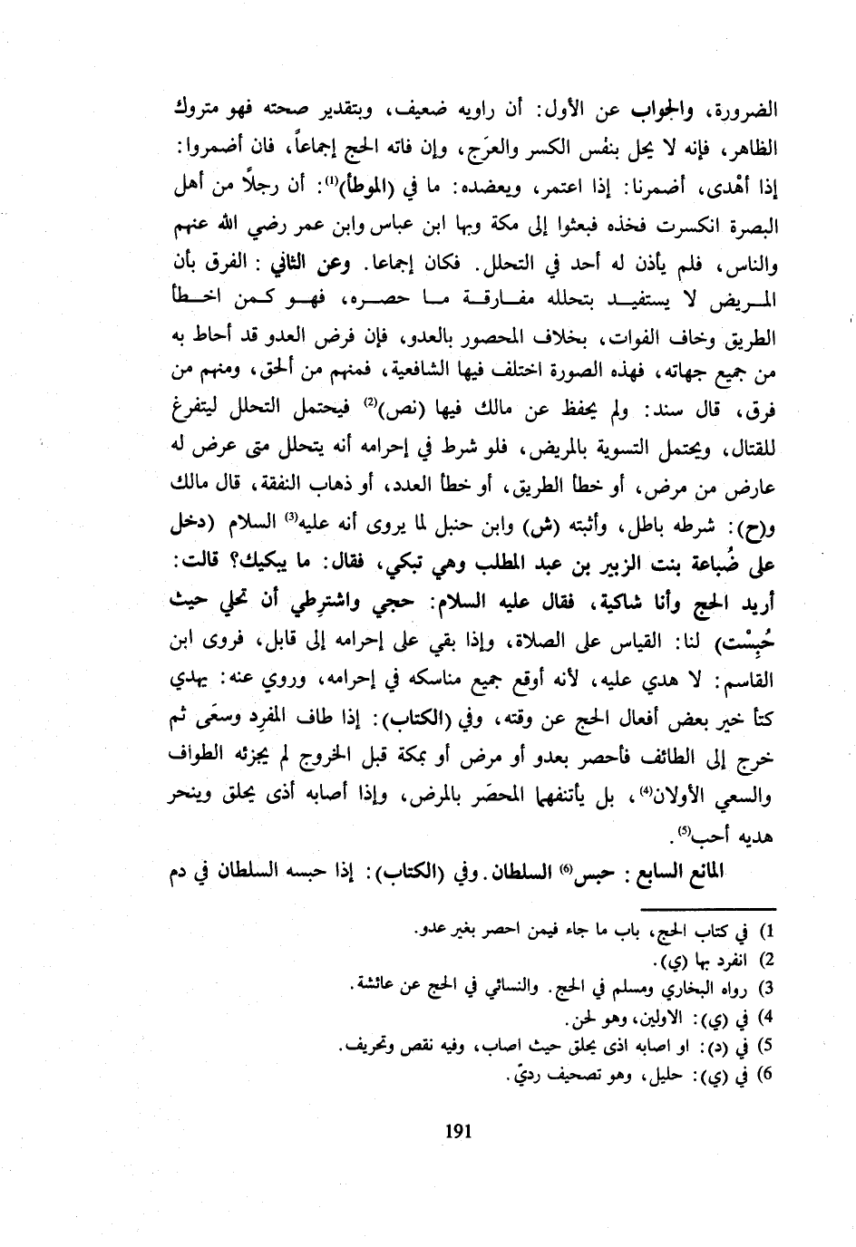الضَّرُورَةِ وَالْجَوَابُ عَنِ الْأَوَّلِ أَنَّ رَاوِيَهُ ضَعِيفٌ وَبِتَقْدِيرِ صِحَّتِهِ فَهُوَ مَتْرُوكُ الظَّاهِرِ فَإِنَّهُ لَا يَحِلُّ بِنَفْسِ الْكَسْرِ وَالْعَرَجِ وَإِنْ فَاتَهُ الْحَجُّ إِجْمَاعًا فَإِنْ أَضْمَرُوا إِذَا أَهْدَى أَضْمَرْنَا إِذَا اعْتَمَرَ وَيُعَضِّدُهُ مَا فِي الْمُوَطَّأِ أَنَّ رَجُلًا مِنْ أَهْلِ الْبَصْرَةِ انْكَسَرَتْ فَخْذُهُ فَبَعَثُوا إِلَى مَكَّةَ وَبِهَا ابْنُ عَبَّاسٍ وَابْنُ عُمَرَ رَضِيَ اللَّهُ عَنْهُمْ وَالنَّاسُ فَلَمْ يَأْذَنْ لَهُ أَحَدٌ فِي التَّحَلُّلِ فَكَانَ إِجْمَاعًا وَعَنِ الثَّانِي الْفَرْقُ بِأَنَّ الْمَرِيضَ لَا يَسْتَفِيدُ بِتَحَلُّلِهِ مُفَارَقَةَ مَا حَصَرَهُ فَهُوَ كَمَنْ أَخْطَأَ الطَّرِيقَ وَخَافَ الْفَوَاتَ بِخِلَافِ الْمَحْصُورِ بِالْعَدُوِّ فَإِنْ فُرِضَ الْعَدُوُّ قَدْ أَحَاطَ بِهِ مِنْ جَمِيعِ جِهَاتِهِ فَهَذِهِ الصُّورَةُ اخْتَلَفَ فِيهَا الشَّافِعِيَّةُ فَمِنْهُمْ مَنْ أَلْحَقَ وَمِنْهُمْ مَنْ فَرَّقَ قَالَ سَنَدٌ وَلَمْ يُحْفَظْ عَنْ مَالِكٍ فِيهَا نَصٌّ فَيُحْتَمَلُ التَّحَلُّلُ لِيَتَفَرَّغَ لِلْقِتَالِ وَيُحْتَمَلُ التَّسْوِيَةُ بِالْمَرِيضِ فَلَوْ شَرَطَ فِي إِحْرَامِهِ أَنَّهُ يَتَحَلَّلُ مَتَى عَرَضَ لَهُ عَارِضٌ مِنْ مَرَضٍ أَوْ خَطَأِ الطَّرِيقِ أَوْ خَطَأِ الْعَدَدِ أَو ذهَاب النَّفَقَة قَالَ مَالك وح شَرْطُهُ بَاطِلٌ وَأَثْبَتَهُ ش وَابْنُ حَنْبَلٍ لِمَا يروي أَنه - صَلَّى اللَّهُ عَلَيْهِ وَسَلَّم َ - دَخَلَ عَلَى ضُبَاعَةَ بِنْتِ الزُّبَيْرِ بْنِ عَبْدِ الْمُطَّلِبِ وَهِيَ تَبْكِي فَقَالَ مَا يُبْكِيكِ قَالَتْ أُرِيد الْحَج وَأَنا شاكية فَقَالَ - صَلَّى اللَّهُ عَلَيْهِ وَسَلَّم َ - حُجِّي وَاشْتَرِطِي أَنْ تُحِلِّي حَيْثُ حُبِسْتِ لَنَا الْقِيَاسُ عَلَى الصَّلَاةِ وَإِذَا بَقِيَ عَلَى إِحْرَامِهِ إِلَى قَابِلٍ فَرَوَى ابْنُ الْقَاسِمِ لَا هَدْيَ عَلَيْهِ لِأَنَّهُ أَوْقَعَ جَمِيعَ مَنَاسِكِهِ فِي إِحْرَامِهِ وَرُوِيَ عَنْهُ يَهْدِي كَتَأْخِيرِ بَعْضِ أَفْعَالِ الْحَجِّ عَنْ وَقْتِهِ وَفِي الْكِتَابِ إِذَا طَافَ الْمُفْرِدُ وَسَعَى ثُمَّ خَرَجَ إِلَى الطَّائِفِ فَأُحْصِرَ بِعَدُوٍّ أَوْ مَرَضٍ أَوْ بِمَكَّةَ قَبْلَ الْخُرُوجِ لَمْ يُجْزِئْهُ الطَّوَافُ وَالسَّعْيُ الْأَوَّلَانِ بَلْ يَأْتَنِفُهُمَا الْمُحْصَرُ بِالْمَرَضِ وَإِذَا أَصَابَهُ أَذًى يَحْلِقُ وَيَنْحَرُ هَدْيَهُ أحب الْمَانِعُ السَّابِعُ حَبْسُ السُّلْطَانِ وَفِي الْكِتَابِ إِذَا حَبَسَهُ السُّلْطَانُ فِي دَمٍ