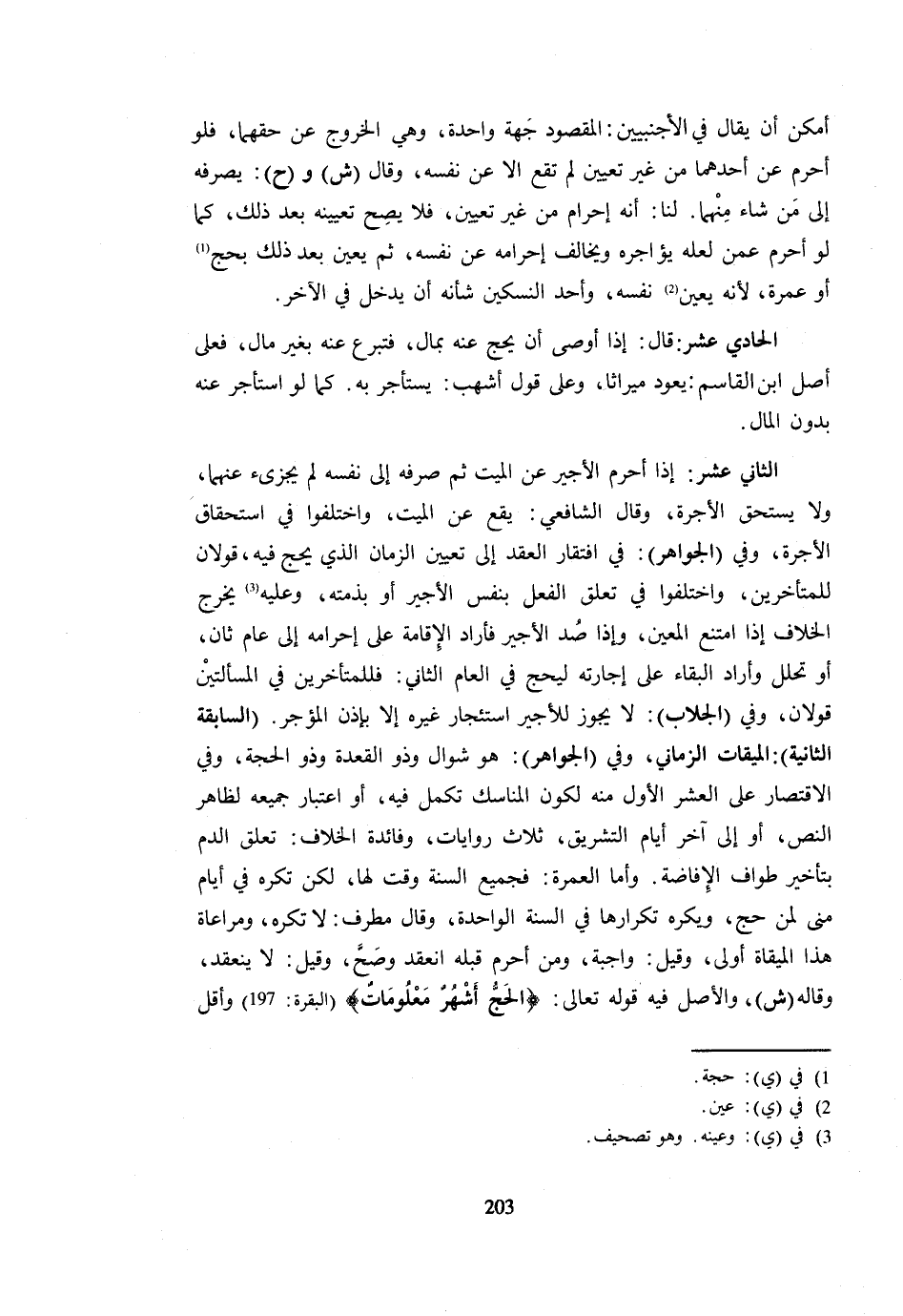 أمكن أَن يَقُول أَن الْأَجْنَبِيَّيْنِ الْمَقْصُودُ جِهَةٌ وَاحِدَةٌ وَهِيَ الْخُرُوجُ عَنْ حَقِّهِمَا فَلَوْ أَحْرَمَ عَنْ أَحَدِهِمَا مِنْ غَيْرِ تَعْيِينٍ لَمْ تَقَعْ إِلَّا عَنْ نَفْسِهِ وَقَالَ ش وح يَصْرِفُهُ إِلَى مَنْ شَاءَ مِنْهُمَا لَنَا أَنَّهُ إِحْرَامٌ مِنْ غَيْرِ تَعْيِينٍ فَلَا يَصِحُّ تَعْيِينُهُ بَعْدَ ذَلِكَ كَمَا لَوْ أَحْرَمَ عَمَّنْ لَعَلَّهُ يُؤَاجِرُهُ وَيُخَالِفُ إِحْرَامَهُ عَنْ نَفْسِهِ ثُمَّ يُعَيَّنَ بَعْدَ ذَلِكَ بِحَجٍّ أَوْ عُمْرَةٍ لِأَنَّهُ يُعَيِّنُ نَفسه وَأحد النُّسُكَيْنِ شَأْن أَنْ يَدْخُلَ فِي الْآخَرِ الْحَادِي عَشَرَ قَالَ إِذَا أَوْصَى أَنْ يَحُجَّ عَنْهُ بِمَالٍ فَتَبَرَّعَ عَنْهُ بِغَيْرِ مَالٍ فَعَلَى أَصْلِ ابْنِ الْقَاسِمِ يَعُودُ مِيرَاثًا وَعَلَى قَوْلِ أَشْهَبَ يَسْتَأْجِرُ بِهِ كَمَا لَو اسْتَأْجر عَنهُ بِدُونِ مَال الثَّانِي عَشَرَ إِذَا أَحْرَمَ الْأَجِيرُ عَنِ الْمَيِّتِ ثُمَّ صَرَفَهُ إِلَى نَفْسِهِ لَمْ يُجْزِئْ عَنْهُمَا وَلَا يسْتَحق الْأُجْرَة وَقَالَ الشَّافِعِي يَقَعُ عَنِ الْمَيِّتِ وَاخْتَلَفُوا فِي اسْتِحْقَاقِ الْأُجْرَةِ وَفِي الْجَوَاهِر فِي افتقار العقد إِلَى تعين الزَّمَانِ الَّذِي يَحُجُّ فِيهِ قَوْلَانِ لِلْمُتَأَخِّرِينَ وَاخْتَلَفُوا فِي تَعَلُّقِ الْفِعْلِ بِنَفْسِ الْأَجِيرِ أَوْ بِذِمَّتِهِ وَعَلِيهِ يخرج الْخلاف إِذا امْتنع الْعين وَإِذَا صُدَّ الْأَجِيرُ فَأَرَادَ الْإِقَامَةَ عَلَى إِحْرَامِهِ إِلَى عَامٍ ثَانٍ أَوْ تَحَلَّلَ وَأَرَادَ الْبَقَاءَ عَلَى إِجَارَتِهِ لِيَحُجَّ فِي الْعَامِ الثَّانِي فَلِلْمُتَأَخِّرِينَ فِي الْمَسْأَلَتَيْنِ قَوْلَانِ وَفِي الْجُلَّابِ لَا يَجُوزُ لِلْأَجِيرِ اسْتِئْجَارُ غَيْرِهِ إِلَّا بِإِذْنِ الْمُؤَجِّرِ السَّابِقَةُ الثَّانِيَةُ الْمِيقَاتُ الزَّمَانِيُّ وَفِي الْجَوَاهِرِ هُوَ شَوَّالٌ وَذُو الْقِعْدَةِ وَذُو الْحِجَّةِ وَفِي الِاقْتِصَارِ عَلَى الْعشْر الأول مِنْهُ لكَونه الناسك تَكْمُلُ فِيهِ أَوِ اعْتِبَارِ جَمِيعِهِ لِظَاهِرِ النَّصِّ أَوْ إِلَى آخِرِ أَيَّامِ التَّشْرِيقِ ثَلَاثُ رِوَايَاتٍ وَفَائِدَةُ الْخِلَافِ تَعَلُّقُ الدَّمِ بِتَأْخِيرِ طَوَافِ الْإِفَاضَةِ وَأَمَّا الْعُمْرَةُ فَجَمِيعُ السَّنَةِ وَقْتٌ لَهَا لَكِنْ تكره فِي أَيَّام منى لمن يحجّ وَيُكْرَهُ تَكْرَارُهَا فِي السَّنَةِ الْوَاحِدَةِ وَقَالَ مُطَرِّفٌ لَا تكره ومراعاة هَذِه المقياة أَوْلَى وَقِيلَ وَاجِبَةٌ وَمَنْ أَحْرَمَ قَبْلَهُ انْعَقَدَ وَصَحَّ وَقِيلَ لَا يَنْعَقِدُ وَقَالَهُ ش وَالْأَصْلُ فِيهِ قَوْله تَعَالَى {الْحَجُّ أَشْهُرٌ مَعْلُومَاتٌ} الْبَقَرَة 196 وَأَقل