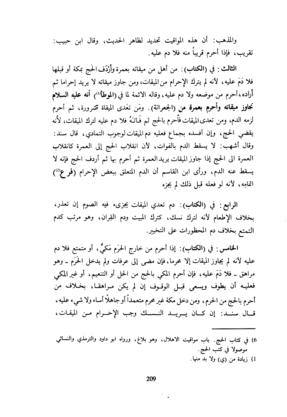 وَالْمَذْهَبُ أَنَّ هَذِهِ الْمَوَاقِيتَ تَحْدِيدٌ لِظَاهِرِ الْحَدِيثِ وَقَالَ ابْنُ حَبِيبٍ تَقْرِيبٌ فَإِذَا أَحْرَمَ قَرِيبًا مِنْهُ فَلَا دَمَ عَلَيْهِ الثَّالِثُ فِي الْكِتَابِ مَنْ أَهَلَّ مِنْ مِيقَاتِهِ بِعُمْرَةٍ وَأَرْدَفَ الْحَجَّ بِمَكَّةَ أَوْ قَبْلَهَا فَلَا دَمَ عَلَيْهِ لِأَنَّهُ لَمْ يَتْرُكِ الْإِحْرَامَ مِنَ الْمِيقَاتِ وَمَنْ جَاوَزَ مِيقَاتَهُ لَا يُرِيدُ إِحْرَامًا ثُمَّ أَرَادَهُ أَحْرَمَ من مَوْضِعه وَلَا دم عَلَيْهِ وَقَالَ الْأَئِمَّة لِمَا فِي الْمُوَطَّأِ أَنَّهُ - صَلَّى اللَّهُ عَلَيْهِ وَسَلَّم َ - تَجَاوَزَ مِيقَاتَهُ وَأَحْرَمَ بِعُمْرَةٍ مِنْ الْجُعْرَانَةِ وَمَنْ تعدى الميقاة ضَرُورَة ثُمَّ أَحْرَمَ لَزِمَهُ الدَّمُ وَمَنْ تَعَدَّى الْمِيقَاتَ فَأَحْرَمَ بِالْحَجِّ ثُمَّ فَاتَهُ فَلَا دَمَ عَلَيْهِ لِتَرْكِ الْمِيقَاتِ لِأَنَّهُ يَقْضِي الْحَجَّ وَإِنْ أَفْسَدَهُ بِجِمَاعٍ فَعَلَيْهِ دَمُ الْمِيقَاتِ لِوُجُوبِ التَّمَادِي قَالَ سَنَدٌ وَقَالَ أَشْهَبُ لَا يَسْقُطُ الدَّمُ بِالْفَوَاتِ لِأَنَّ انْقِلَابَ الْحَجِّ إِلَى الْعُمْرَةِ كَانْقِلَابِ الْعُمْرَةِ إِلَى الْحَجِّ إِذَا جَاوَزَ الْمِيقَاتَ يُرِيدُ الْعُمْرَةَ ثُمَّ أَحْرَمَ بِهَا ثُمَّ أَرْدَفَ الْحَجَّ فَإِنَّهُ لَا يَسْقُطُ عَنْهُ الدَّمُ وَرَأَى ابْنُ الْقَاسِمِ أَن الدَّم الْمُتَعَلّق بِبَعْض الْإِحْرَام فرغ إِتْمَامه لِأَنَّهُ لَو فعله قبل ذَلِك لم يُجِزْهُ الرَّابِعُ فِي الْكِتَابِ دَمُ تَعِدِي الْمِيقَاتِ يُجْزِئُ فِيهِ الصَّوْمُ إِنْ تَعَذَّرَ بِخِلَافِ الْإِطْعَامِ لِأَنَّهُ لِتَرْكِ نُسُكٍ كَتَرْكِ الْمَبِيتِ وَدَمُ الْقِرَانِ وَهُوَ مُرَتَّبٌ كَدَمِ التَّمَتُّعِ بِخِلَافِ دَمِ الْمَحْظُورَاتِ على التخير الْخَامِسُ فِي الْكِتَابِ إِذَا أَحْرَمَ مِنْ خَارِجِ الْحَرَمِ مَكِّيٌّ أَوْ مُتَمَتِّعٌ فَلَا دَمَ عَلَيْهِ لِأَنَّهُ لَمْ يُجَاوِزِ الْمِيقَاتَ إِلَّا مُحْرِمًا فَإِنْ مَضَى إِلَى عَرَفَاتٍ وَلَمْ يَدْخُلِ الْحَرَمَ وَهُوَ مُرَاهِقٌ فَلَا دَمَ عَلَيْهِ فَإِنْ أَحْرَمَ الْمَكِّيُّ بِالْحَجِّ مِنَ الْحِلِّ أَوِ التَّنْعِيمِ أَوْ غَيْرُ الْمَكِّيِّ فَعَلَيْهِ أَنْ يَطُوفَ وَيَسْعَى قَبْلَ الْوُقُوفِ فَإِنْ لَمْ يَكُنْ مُرَاهِقًا بِخِلَافِ مَنْ أَحْرَمَ بِالْحَجِّ مِنَ الْحَرَمِ وَمَنْ دَخَلَ مَكَّةَ غَيْرَ مُحْرِمٍ مُتَعَمِّدًا أَوْ جَاهِلًا أَسَاءَ وَلَا شَيْءَ عَلَيْهِ قَالَ سَنَدٌ إِنْ كَانَ يُرِيدُ النُّسُكَ وَجَبَ الْإِحْرَامُ مِنَ الْمِيقَاتِ