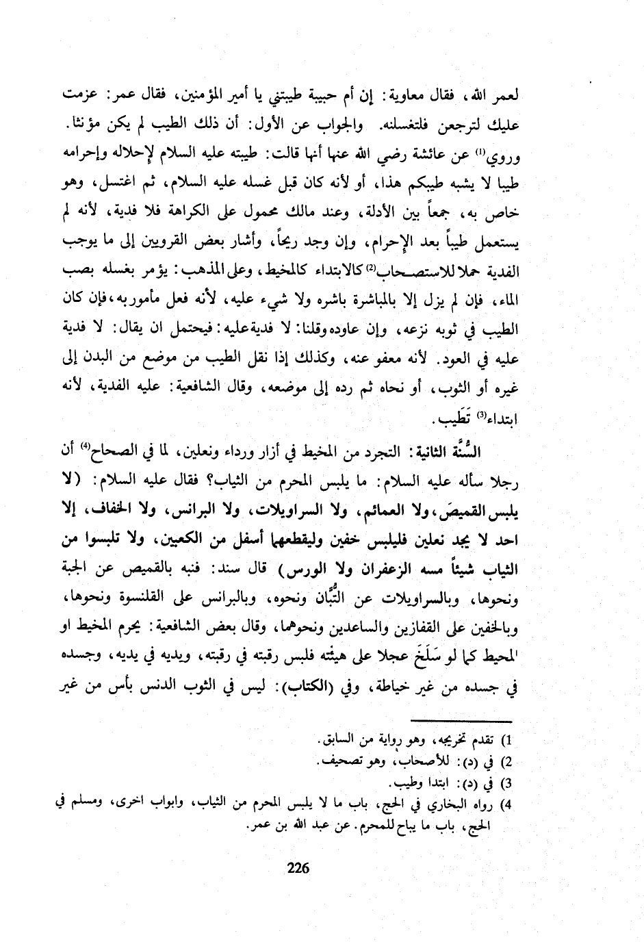 لَعَمْرُ اللَّهِ فَقَالَ مُعَاوِيَةُ إِنَّ أُمَّ حَبِيبَةَ طَيَّبَتْنِي يَا أَمِيرَ الْمُؤْمِنِينَ فَقَالَ عُمَرُ عَزَمْتُ عَلَيْكَ لَتَرْجِعَنَّ فَلْتَغْسِلَنَّهُ وَالْجَوَابُ عَنِ الْأَوَّلِ أَنَّ ذَلِكَ الطِّيبَ لَمْ يَكُنْ مُؤَنَّثًا وَرُوِيَ عَنْ عَائِشَةَ رَضِيَ اللَّهُ عَنْهَا أَنَّهَا قَالَتْ طَيَّبْتُهُ - صَلَّى اللَّهُ عَلَيْهِ وَسَلَّم َ - لِإِحْلَالِهِ وَإِحْرَامِهِ طِيبًا لَا يُشْبِهُ طِيبَكُمْ هَذَا أَو لِأَنَّهُ كَانَ قبل غسله - صَلَّى اللَّهُ عَلَيْهِ وَسَلَّم َ - ثُمَّ اغْتَسَلَ وَهُوَ خَاصٌّ بِهِ جَمْعًا بَيْنَ الْأَدِلَّةِ وَعِنْدَ مَالِكٍ مَحْمُولٌ عَلَى الْكَرَاهَةِ فَلَا فِدْيَةَ لِأَنَّهُ لَمْ يَسْتَعْمِلْ طِيبًا بَعْدَ الْإِحْرَامِ وَإِن وجد ريحًا أَشَارَ بَعْضُ الْقَرَوِيِّينَ إِلَى مَا يُوجِبُ الْفِدْيَةَ حَمْلًا لِلِاسْتِصْحَابِ كَالِابْتِدَاءِ كَالْمَخِيطِ وَعَلَى الْمَذْهَبِ يُؤْمَرُ بِغَسْلِهِ بِصَبِّ الْمَاءِ فَإِنْ لَمْ يَزَلْ إِلَّا بِالْمُبَاشَرَةِ بَاشَرَهُ وَلَا شَيْءَ عَلَيْهِ لِأَنَّهُ فِعْلٌ مَأْمُورٌ بِهِ فَإِنْ كَانَ الطِّيبُ فِي ثَوْبِهِ نَزَعَهُ وَإِنْ عَاوَدَهُ وَقُلْنَا لَا فِدْيَةَ عَلَيْهِ فَيُحْتَمَلُ أَنْ يُقَالَ لَا فِدْيَةَ عَلَيْهِ فِي الْعُودِ لِأَنَّهُ مَعْفُوٌّ عَنْهُ وَكَذَلِكَ إِذَا نَقَلَ الطِّيبَ فِي الْموضع مِنَ الْبَدَنِ إِلَى غَيْرِهِ أَوِ الثَّوْبِ أَوْ نَحَّاهُ ثُمَّ رَدَّهُ إِلَى مَوْضِعِهِ وَقَالَ الشَّافِعِيَّةُ عَلَيْهِ الْفِدْيَةُ لِأَنَّهُ ابْتِدَاءُ تَطَيُّبٍ السُّنَّةُ الثَّانِيَةُ التَّجَرُّدُ مِنَ الْمَخِيطِ فِي إِزَارٍ وَرِدَاءٍ وَنَعْلَيْنِ لما فِي الصِّحَاح أَن رجلا سَأَلَهُ - صَلَّى اللَّهُ عَلَيْهِ وَسَلَّم َ - مَا يلبس الْمحرم من الثِّيَاب فَقَالَ - صَلَّى اللَّهُ عَلَيْهِ وَسَلَّم َ - لَا يلبس الْقَمِيص وَلَا الْعِمَامَة وَلَا السَّرَاوِيلَاتِ وَلَا الْبَرَانِسَ وَلَا الْخِفَافَ إِلَّا أَحَدٌ لَا يَجِدُ نَعْلَيْنِ فَلْيَلْبَسْ خُفَّيْنِ وَلْيَقْطَعْهُمَا أَسْفَلَ مِنَ الْكَعْبَيْنِ وَلَا تَلْبَسُوا مِنَ الثِّيَابِ شَيْئًا مَسَّهُ الزَّعْفَرَانُ وَلَا الْوَرْسُ قَالَ سَنَدٌ فَنَبَّهَ بِالْقَمِيصِ عَنِ الْجُبَّةِ وَنَحْوِهَا وَبِالسَّرَاوِيلَاتِ عَنِ التُّبَّانِ وَنَحْوِهِ وَبِالْبَرَانِسِ عَنِ الْقَلَنْسُوَةِ وَنَحْوِهَا وَبِالْخُفَّيْنِ على الْقُفَّازَيْنِ وَالسَّاعِدَيْنِ وَنَحْوِهِمَا وَقَالَ بَعْضُ الشَّافِعِيَّةِ يَحْرُمُ الْمَخِيطُ أَوِ الْمُحِيطُ كَمَا لَوْ سَلَخَ عِجْلًا عَلَى هَيْئَتِهِ فَلَبِسَ رَقَبَتَهُ فِي رَقَبَتِهِ وَيَدَيْهِ فِي يَدَيْهِ وَجَسَدَهُ فِي جَسَدِهِ مِنْ غَيْرِ خِيَاطَةٍ وَفِي الْكِتَابِ لَيْسَ فِي الثَّوْبِ الدَّنِسِ بَأْسٌ مِنْ غَيْرِ