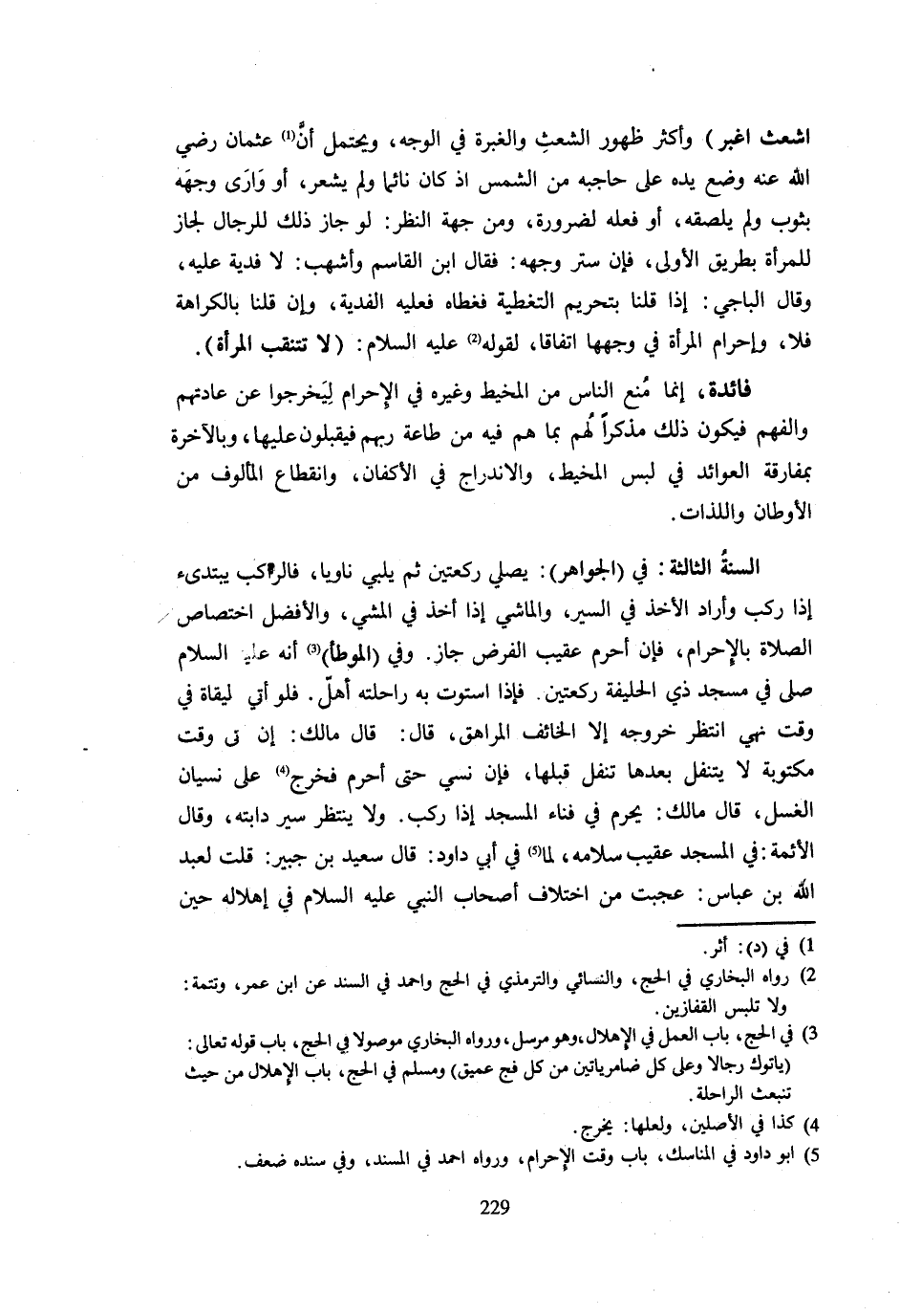 أَشْعَثُ أَغْبَرُ وَأَكْثَرُ ظُهُورِ الشَّعَثِ وَالْغَبَرَةِ فِي الْوَجْهِ وَيُحْتَمَلُ أَنَّ عُثْمَانَ رَضِيَ اللَّهُ عَنْهُ وَضَعَ يَدَهُ عَلَى حَاجِبِهِ مِنَ الشَّمْسِ إِذْ كَانَ نَائِمًا وَلَمْ يَشْعُرْ أَوْ وَارَى وَجْهَهُ بِثَوْبٍ وَلَمْ يُلْصِقْهُ أَوْ فَعَلَهُ لِضَرُورَةٍ وَمِنْ وجهة النّظر لَو جَازَ ذَلِك للرجل لَجَازَ لِلْمَرْأَةِ بِطَرِيقِ الْأَوْلَى فَإِنْ سَتَرَ وَجْهَهُ فَقَالَ ابْنُ الْقَاسِمِ وَأَشْهَبُ لَا فِدْيَةَ عَلَيْهِ وَقَالَ الْبَاجِيُّ إِذَا قُلْنَا بِتَحْرِيمِ التَّغْطِيَةِ فَغَطَّاهُ فَعَلَيْهِ الْفِدْيَةُ وَإِنْ قُلْنَا بِالْكَرَاهَةِ فَلَا وَإِحْرَامُ الْمَرْأَة فِي وَجههَا اتِّفَاقًا لقَوْله - صَلَّى اللَّهُ عَلَيْهِ وَسَلَّم َ - لَا تَنْتَقِبُ الْمَرْأَةُ فَائِدَةٌ إِنَّمَا مُنِعُ النَّاسُ مِنَ الْمَخِيطِ وَغَيْرِهِ فِي الْإِحْرَامِ لِيَخْرُجُوا عَنْ عَادَتِهِمْ وَإِلْفِهِمْ فَيَكُونُ ذَلِكَ مُذَكِّرًا لَهُمْ بِمَا هُمْ فِيهِ مِنْ طَاعَةِ رَبِّهِمْ فَيُقْبِلُونَ عَلَيْهَا وبالآخرة بمفارقة العوائد فِي لبس الْمخيط والإندارج فِي الأكفان وَانْقِطَاع المألوف عَن الْأَوْطَانِ وَاللَّذَّاتِ السُّنَّةُ الثَّالِثَةُ فِي الْجَوَاهِرِ يُصَلِّي رَكْعَتَيْنِ ثُمَّ يُلَبِّي نَاوِيًا فَالرَّاكِبُ يَبْتَدِئُ إِذَا رَكِبَ وَأَرَادَ الْأَخْذَ فِي السَّيْرِ وَالْمَاشِي إِذَا أَخَذَ فِي الْمَشْيِ وَالْأَفْضَلُ اخْتِصَاصُ الصَّلَاةِ بِالْإِحْرَامِ فَإِنْ أَحْرَمَ عَقِيبَ الْفَرْضِ جَازَ وَفِي الْمُوَطَّأِ أَنه - صَلَّى اللَّهُ عَلَيْهِ وَسَلَّم َ - صَلَّى فِي مَسْجِدِ ذِي الْحُلَيْفَةِ رَكْعَتَيْنِ فَإِذَا أستوت بِهِ رَاحِلَته أهل فَلَو أَتَى لميقاة فِي وَقت نهي انْتظر خُرُوجه إِلَى الْخَائِفُ الْمُرَاهِقُ قَالَ قَالَ مَالِكٌ إِنْ أَتَى وَقت مكتوبه لَا يتَنَفَّل قبلهَا تنفل بعْدهَا فَإِنْ نَسِيَ حَتَّى أَحْرَمَ فَخَرَجَ عَلَى نِسْيَانِ الْغُسْلِ قَالَ مَالِكٌ يُحْرِمُ فِي فِنَاءِ الْمَسْجِدِ إِذَا رَكِبَ وَلَا يَنْتَظِرُ سَيْرَ دَابَّتِهِ وَقَالَ الْأَئِمَّةُ فِي الْمَسْجِدِ عَقِيبَ سَلَامِهِ لِمَا فِي أَبِي دَاوُدَ قَالَ سَعِيدُ بْنُ جُبَيْرٍ قُلْتُ لِعَبْدِ اللَّهِ بْنِ عَبَّاسٍ عَجِبْتُ مِنِ اخْتِلَافِ أَصْحَاب النَّبِي - صَلَّى اللَّهُ عَلَيْهِ وَسَلَّم َ - فِي إِهْلَالِهِ حِينَ