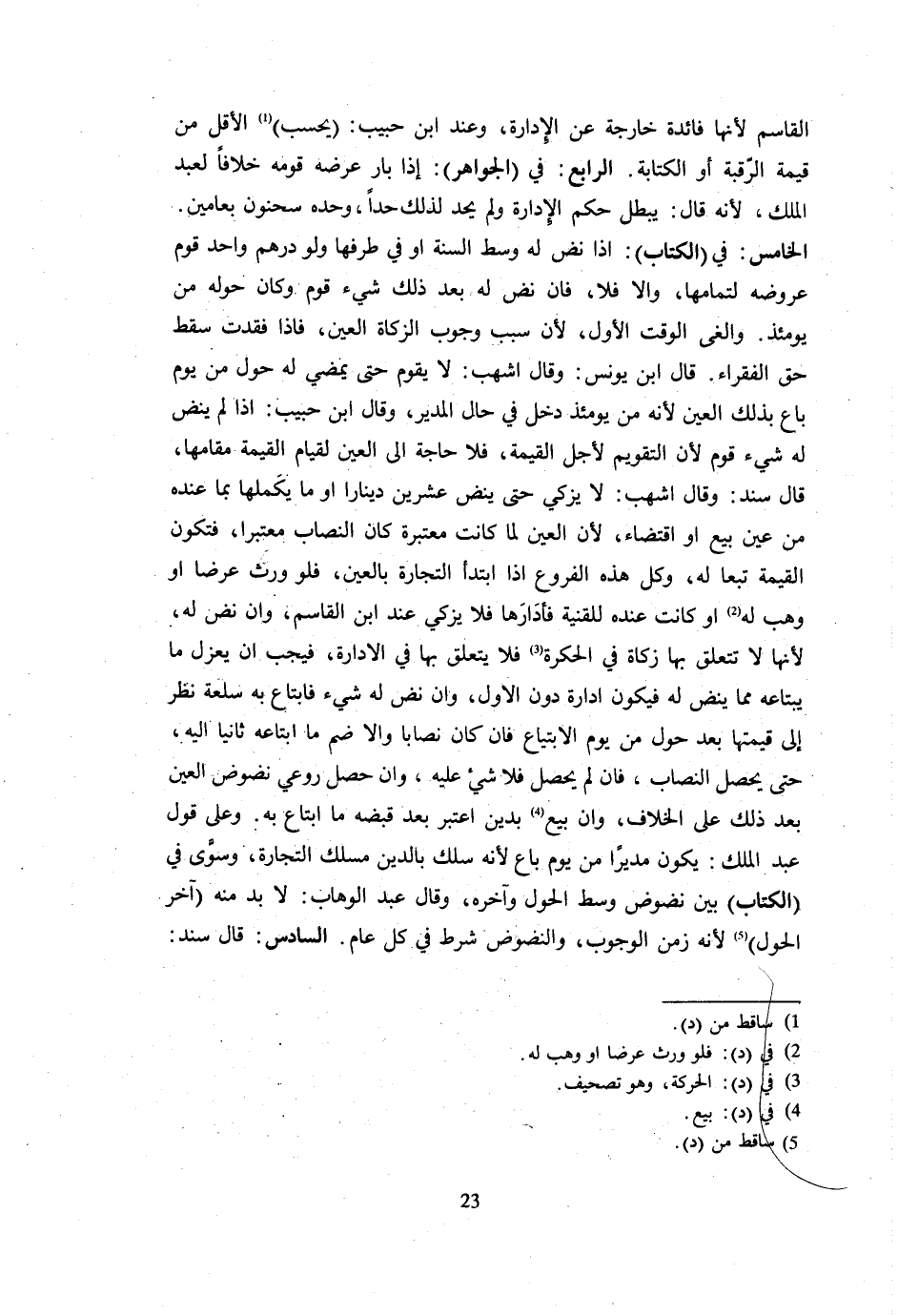 الْقَاسِمِ لِأَنَّهَا فَائِدَةٌ خَارِجَةٌ عَنِ الْإِدَارَةِ وَعِنْدَ ابْنِ حَبِيبٍ يَحْسِبُ الْأَقَلَّ مِنْ قِيمَةِ الرَّقَبَةِ أَوِ الْكِتَابَةِ الرَّابِعُ فِي الْجَوَاهِرِ إِذَا بَارَ عَرْضُهُ قَوَّمَهُ خِلَافًا لِعَبْدِ الْمَلِكِ لِأَنَّهُ قَالَ يَبْطُلُ حُكْمُ الْإِدَارَةِ وَلَمْ يَحِدَّ لِذَلِكَ حَدًّا وَحَدَّهُ سَحْنُونٌ بِعَامَيْنِ الْخَامِسُ فِي الْكِتَابِ إِذَا نَضَّ لَهُ وَسَطَ السَّنَةِ أَوْ فِي طَرَفِهَا وَلَو دِرْهَمٌ وَاحِدٌ قَوَّمَ عُرُوضَهُ لِتَمَامِهَا وَإِلَّا فَلَا فَإِنْ نَضَّ لَهُ بَعْدَ ذَلِكَ شَيْءٌ قَوَّمَ وَكَانَ حَوْلُهُ مِنْ يَوْمِئِذٍ وَأَلْغَى الْوَقْتَ الْأَوَّلَ لِأَنَّ سَبَبَ وُجُوبِ الزَّكَاةِ الْعَيْنُ فَإِذَا فُقِدَتْ سَقَطَ حَقُّ الْفُقَرَاءِ قَالَ ابْنُ يُونُسَ وَقَالَ أَشْهَبُ لَا يُقَوَّمُ حَتَّى يَمْضِيَ لَهُ حَوْلٌ مِنْ يَوْمِ بَاعَ بِذَلِكَ الْعَيْنِ لِأَنَّهُ مِنْ يَوْمِئِذٍ دَخَلَ فِي حَالِ الْمُدِيرِ وَقَالَ ابْنُ حَبِيبٍ إِذَا لَمْ يَنِضُّ لَهُ شَيْءٌ قَوَّمَ لِأَنَّ التَّقْوِيمَ لِأَجْلِ الْقِيمَةِ فَلَا حَاجَةَ إِلَى الْعَيْنِ لِقِيَامِ الْقِيمَةِ مَقَامَهَا قَالَ سَنَدٌ وَقَالَ اشهب لَا يُزكي حَتَّى حَتَّى يَنِضَّ عِشْرِينَ دِينَارًا أَوْ مَا يُكْمِلُهَا بِمَا عِنْدَهُ مِنْ عَيْنِ بَيْعٍ أَوِ اقْتِضَاءٍ لِأَنَّ الْعَيْنَ لَمَّا كَانَتْ مُعْتَبَرَةً كَانَ النِّصَابُ مُعْتَبَرًا فَتَكُونُ الْقِيمَةُ تَبَعًا لَهُ وَكُلُّ هَذِهِ الْفُرُوعِ إِذَا ابْتَدَأَ التِّجَارَةَ بِالْعَيْنِ فَلَوْ وَرِثَ عَرَضَا أَوْ وُهِبَ لَهُ أَوْ كَانَتْ عِنْدَهُ لِلْقِنْيَةِ فَأَدَارَهَا فَلَا يُزَكِّي عِنْدَ ابْنِ الْقَاسِمِ وان نض لَهُ لِأَنَّهَا لَا تَتَعَلَّقُ بِهَا زَكَاةٌ فِي الْحُكْرَةِ فَلَا يَتَعَلَّقُ بِهَا فِي الْإِدَارَةِ فَيَجِبُ أَنْ يَعْزِلَ مَا يَبْتَاعُهُ مِمَّا يَنِضُّ لَهُ فَيَكُونُ إِدَارَةً دُونَ الْأَوَّلِ وَإِنَّ نَضَّ لَهُ شَيْءٌ فَابْتَاعَ بِهِ سِلْعَةً نَظَرَ إِلَى قِيمَتِهَا بَعْدَ حَوْلٍ مِنْ يَوْمِ الِابْتِيَاعِ فَإِنْ كَانَ نِصَابًا وَإِلَّا ضَمَّ مَا ابْتَاعَهُ ثَانِيًا إِلَيْهِ حَتَّى يَحْصُلَ النِّصَابُ فَإِنْ لَمْ يَحْصُلْ فَلَا شَيْءَ عَلَيْهِ وَإِنْ حَصَلَ رُوعِيَ نُضُوضُ الْعَيْنِ بَعْدَ ذَلِكَ عَلَى الْخِلَافِ وَإِنْ بِيعَ بِدَيْنٍ اعْتُبِرَ بَعْدَ قَبْضِهِ مَا ابْتَاعَ بِهِ وَعَلَى قَوْلِ عَبْدِ الْمَلِكِ يَكُونُ مُدِيرًا مِنْ يَوْمِ بَاعَ لِأَنَّهُ سَلَكَ بِالدَّيْنِ مَسْلَكَ التِّجَارَةِ وَسَوَّى فِي الْكِتَابِ بَيْنَ نَضُوضِ وَسَطَ الْحَوْلِ وَآخِرِهِ وَقَالَ عبد الْوَهَّاب لَا بُد مِنْهُ آخِرَ الْحَوْلِ لِأَنَّهُ زَمَنُ الْوُجُوبِ وَالنَّضُوضُ شَرْطٌ فِي كُلِّ عَامٍ السَّادِسُ قَالَ سَنَدٌ