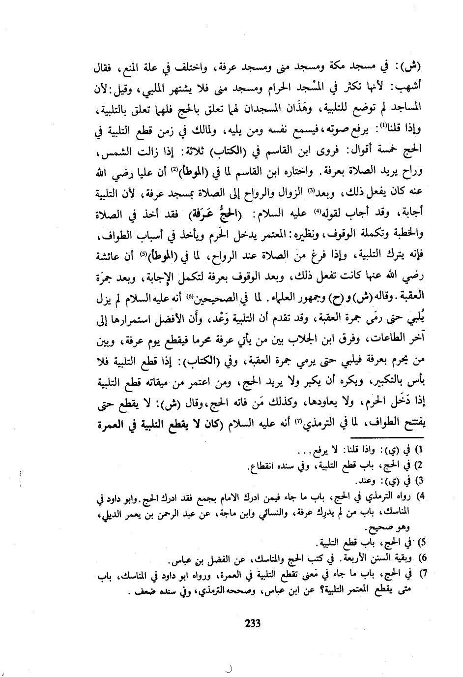 ش فِي مَسْجِدِ مَكَّةَ وَمَسْجِدِ مِنًى وَمَسْجِدِ عَرَفَةَ وَاخْتُلِفَ فِي عِلَّةِ الْمَنْعِ فَقَالَ أَشْهَبُ لِأَنَّهَا تَكْثُرُ فِي الْمَسْجِدِ الْحَرَامِ وَمَسْجِدِ مِنًى فَلَا يُشْتَهَرُ الْمُلَبِّي وَقِيلَ لِأَنَّ الْمَسَاجِدَ لَمْ تُوضَع لتلبية وَهَذَانِ الْمَسْجِدَانِ لَهُمَا تَعَلُّقٌ بِالْحَجِّ فَلَهُمَا تَعَلُّقٌ بِالتَّلْبِيَةِ وَإِذا قُلْنَا يرفع صَوته وَيسمع نَفْسَهُ وَمَنْ يَلِيهِ وَلِمَالِكٍ فِي زَمَنِ قَطْعِ التَّلْبِيَةِ فِي الْحَجِّ خَمْسَةُ أَقْوَالٍ فَرَوَى ابْنُ الْقَاسِمِ فِي الْكِتَابِ ثَلَاثَةً إِذَا زَالَتِ الشَّمْسُ وَرَاحَ يُرِيدُ الصَّلَاةَ بِعَرَفَةَ وَاخْتَارَهُ ابْنُ الْقَاسِمِ لِمَا فِي الْمُوَطَّأِ أَنَّ عَلِيًّا رَضِيَ اللَّهُ عَنْهُ كَانَ يَفْعَلُ ذَلِكَ وَبَعْدَ الزَّوَالِ وَالرَّوَاحِ إِلَى الصَّلَاةِ بِمَسْجِدِ عَرَفَةَ لِأَنَّ التَّلْبِيَةَ إِجَابَةٌ وَقد أجَاب