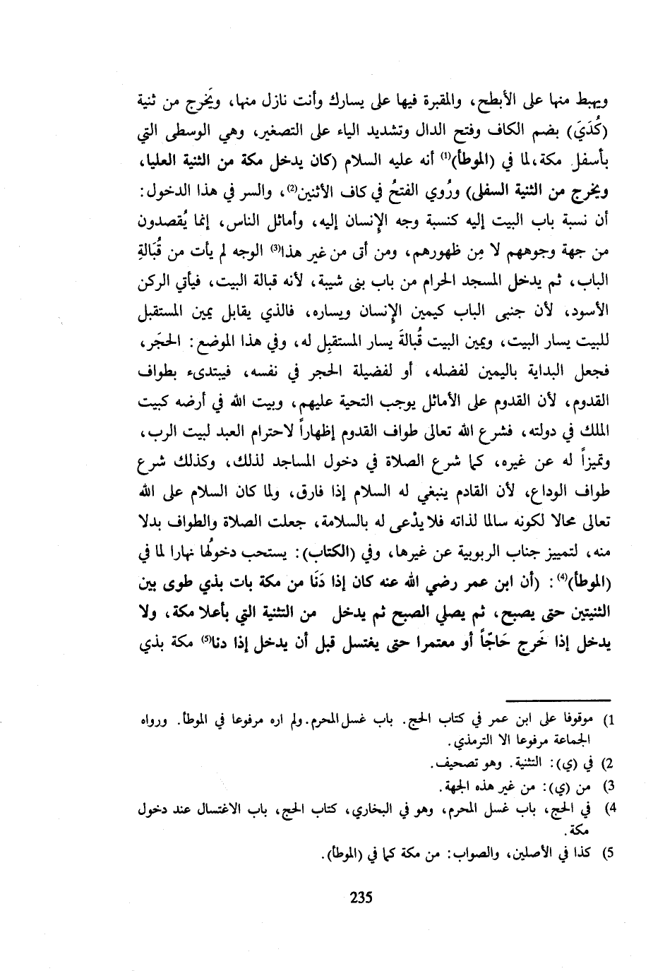 وَيَهْبِطُ مِنْهَا عَلَى الْأَبْطَحِ وَالْمَقْبَرَةُ فِيهَا عَلَى يَسَارِكَ وَأَنْتَ نَازِلٌ مِنْهَا وَيَخْرُجُ مِنْ ثَنِيَّةِ كُدَيٍّ بِضَمِّ الْكَافِ وَفَتْحِ الدَّالِ وَتَشْدِيدِ الْيَاءِ عَلَى التَّصْغِيرِ وَهِيَ الْوُسْطَى الَّتِي بِأَسْفَلِ مَكَّةَ لِمَا فِي الْمُوَطَّأِ أَنَّهُ - صَلَّى اللَّهُ عَلَيْهِ وَسَلَّم َ - كَانَ يَدْخُلُ مَكَّةَ مِنَ الثَّنِيَّةِ الْعُلْيَا وَيَخْرُجُ مِنَ الثَّنِيَّةِ السُّفْلَى وَرُوِيَ الْفَتْحُ فِي كَافِ الِاثْنَيْنِ والسر فِي هَذَا الدُّخُول أَن نِسْبَة بَاب الْبَيْت إِلَيْهِ كنبسة وَجْهِ الْإِنْسَانِ إِلَيْهِ وَأَمَاثِلُ النَّاسِ إِنَّمَا يُقْصَدُونَ من جِهَة وُجُوههم لَا من ظُهُورِهِمْ وَمَنْ أَتَى مِنْ غَيْرِ هَذَا الْوَجْهِ لَمْ يَأْتِ مِنْ قُبَالَةِ الْبَابِ ثُمَّ يَدْخُلُ الْمَسْجِدَ الْحَرَامَ مِنْ بَابِ بَنِي شَيْبَةَ لِأَنَّهُ قُبَالَةُ الْبَيْتِ فَيَأْتِي الرُّكْنَ الْأَسْوَدَ لِأَنَّ جَنْبَيِ الْبَابِ كَيَمِينِ الْإِنْسَانِ وَيَسَارِهِ فَالَّذِي يُقَابِلُ يَمِينَ الْمُسْتَقْبل للبيت يسَار الْبَيْت وَيَمِين الْبَيْت قبالة يسَار الْمُسْتَقْبل لَهُ وَفِي هَذَا الْموضع الْحجر فَجعل الْبِدَايَة باليَمِينُ لفضله أَوْ لِفَضِيلَةِ الْحَجَرِ فِي نَفْسِهِ فَيَبْتَدِئُ بِطَوَافِ الْقُدُومِ لِأَنَّ الْقُدُومَ عَلَى الْأَمَاثِلِ يُوجِبُ التَّحِيَّةَ عَلَيْهِمْ وَبَيْتُ اللَّهِ فِي أَرْضِهِ كَبَيْتِ الْمَلِكِ فِي دَوْلَتِهِ فَشَرَعَ اللَّهُ تَعَالَى طَوَافَ الْقُدُومِ إِظْهَارًا لِاحْتِرَامِ الْعَبْدِ لِبَيْتِ الرَّبِّ وتميزا لَهُ عَنْ غَيْرِهِ كَمَا شَرَعَ الصَّلَاةَ فِي دُخُولِ الْمَسَاجِدِ لِذَلِكَ وَكَذَلِكَ شَرَعَ طَوَافَ الْوَدَاعِ لِأَنَّ الْقَادِمَ يَنْبَغِي لَهُ السَّلَامُ إِذَا فَارَقَ وَلَمَّا كَانَ السَّلَامُ عَلَى اللَّهِ تَعَالَى مُحَالًا لِكَوْنِهِ سَالِمًا لِذَاتِهِ فَلَا يُدْعَى لَهُ بِالسَّلَامَةِ جُعِلَتِ الصَّلَاةُ وَالطَّوَافُ بَدَلًا مِنْهُ لِتَمْيِيزِ جَنَابِ الرُّبُوبِيَّةِ عَنْ غَيْرِهَا وَفِي الْكِتَابِ يُسْتَحَبُّ دُخُولُهَا نَهَارًا لِمَا فِي الْمُوَطَّأِ أَنَّ ابْنَ عُمَرَ رَضِيَ اللَّهُ عَنْهُ كَانَ إِذَا دَنَا مِنْ مَكَّةَ بَاتَ بِذِي طُوًى بَيْنَ الثَّنِيَّتَيْنِ حَتَّى يُصْبِحَ ثُمَّ يُصَلِّيَ الصُّبْحَ ثُمَّ يَدْخُلَ مِنَ التَّثْنِيَة الَّتِي بأعلا مَكَّةَ وَلَا يَدْخُلُ إِذَا خَرَجَ حَاجًّا أَوْ مُعْتَمِرًا حَتَّى يَغْتَسِلَ قَبْلَ أَنْ يَدْخُلَ إِذَا دنا مَكَّة بِذِي