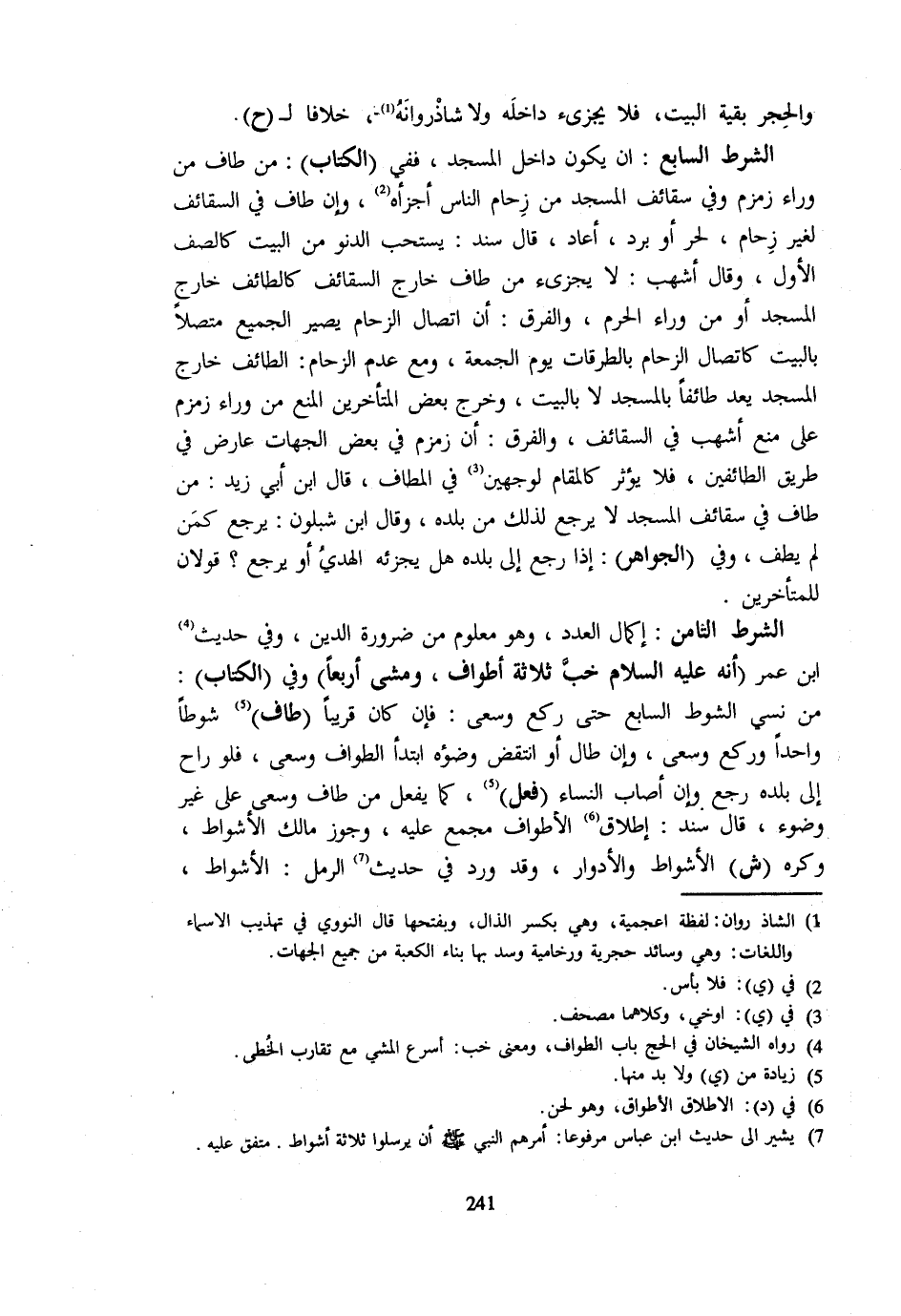 وَالْحِجْرُ بَقِيَّةُ الْبَيْتِ فَلَا يُجْزِئُ دَاخِلُهُ وَلَا شَاذْرُوَانُهُ خِلَافًا لِ ح الشَّرْطُ السَّابِعُ أَنْ يَكُونَ دَاخِلَ الْمَسْجِدِ فَفِي الْكِتَابِ مَنْ طَافَ مِنْ وَرَاءِ زَمْزَمَ وَفِي سَقَائِفِ الْمَسْجِدِ مِنْ زِحَامِ النَّاسِ أَجْزَأَهُ وَإِنْ طَافَ فِي السَّقَائِفِ لِغَيْرِ زِحَامٍ لِحَرٍّ أَوْ بَرْدٍ أَعَادَ قَالَ سَنَدٌ يُسْتَحَبُّ الدُّنُوُّ مِنَ الْبَيْتِ كَالصَّفِّ الْأَوَّلِ وَقَالَ أَشْهَبُ لَا يُجْزِئُ مَنْ طَافَ خَارِجَ السَّقَائِفِ كَالطَّائِفِ خَارِجَ الْمَسْجِدِ أَوْ مِنْ وَرَاءِ الْحَرَمِ وَالْفَرْقُ أَنَّ اتِّصَالَ الزِّحَامِ يَصِيرُ الْجَمِيعُ مُتَّصِلًا بِالْبَيْتِ كَاتِّصَالِ الزِّحَامِ بِالطُّرُقَاتِ يَوْمَ الْجُمُعَةِ وَمَعَ عَدَمِ الزِّحَامِ الطَّائِفُ خَارِجَ الْمَسْجِدِ يُعَدُّ طَائِفًا بِالْمَسْجِدِ لَا بِالْبَيْتِ وَخَرَّجَ بَعْضُ الْمُتَأَخِّرِينَ الْمَنْعَ مِنْ وَرَاءِ زَمْزَمَ عَلَى مَنْعِ أَشْهَبَ فِي السَّقَائِفِ وَالْفَرْقُ أَنَّ زَمْزَمَ فِي بَعْضِ الْجِهَاتِ عَارِضٌ فِي طَرِيقِ الطَّائِفِينَ فَلَا يُؤَثِّرُ كَالْمَقَامِ لِوَجْهَيْنِ فِي الْمَطَافِ قَالَ ابْنُ أَبِي زَيْدٍ مَنْ طَافَ فِي سَقَائِفِ الْمَسْجِدِ لَا يَرْجِعُ لِذَلِكَ مِنْ بَلَدِهِ وَقَالَ ابْنُ شَبْلُونٍ يَرْجِعُ كَمَنْ لَمْ يَطُفْ وَفِي الْجَوَاهِرِ إِذَا رَجَعَ إِلَى بَلَدِهِ هَلْ يُجْزِئُهُ الْهَدْيُ أَوْ يَرْجِعُ قَوْلَانِ لِلْمُتَأَخِّرِينَ الشَّرْطُ الثَّامِنُ إِكْمَالُ الْعَدَدِ وَهُوَ مَعْلُومٌ مِنْ ضَرُورَةِ الدِّينِ وَفِي حَدِيثِ ابْن عمر أَنه - صَلَّى اللَّهُ عَلَيْهِ وَسَلَّم َ - خب ثَلَاثَة أطواف وَمَشى أَرْبعا وَفِي الْكتاب من نسي الشوط السَّابِع رَكَعَ وَسَعَى فَإِنْ كَانَ قَرِيبًا طَافَ شَوْطًا وَاحِدًا وَرَكَعَ وَسَعَى وَإِنْ طَالَ أَوِ انْتَقَضَ وضؤه ابْتَدَأَ الطَّوَافَ وَسَعَى فَلَوْ رَاحَ إِلَى بَلَدِهِ رَجَعَ وَإِنْ أَصَابَ النِّسَاءَ فَعَلَ كَمَا يَفْعَلُ مَنْ طَافَ وَسَعَى عَلَى غَيْرِ وُضُوءٍ قَالَ سَنَدٌ إِطْلَاقُ الْأَطْوَافِ مُجْمَعٌ عَلَيْهِ وَجَوَّزَ مَالِكٌ الْأَشْوَاطَ وَكَرِهَ ش الْأَشْوَاطَ وَالْأَدْوَارَ وَقَدْ وَرَدَ فِي حَدِيثِ الرَّمَلِ الْأَشْوَاطُ