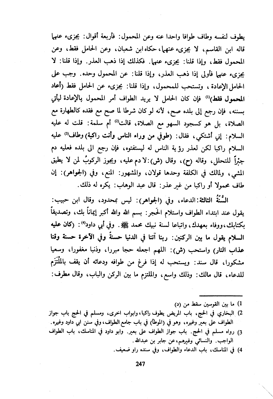طُوفِي مِنْ وَرَاءِ النَّاسِ وَأَنت راكبة وَطَاف - صَلَّى اللَّهُ عَلَيْهِ وَسَلَّم َ - رَاكِبًا لَكِنْ لِعُذْرِ رُؤْيَةِ النَّاسِ لَهُ لِيَسْتَفْتُوهُ فَإِنْ رَجَعَ إِلَى بَلَدِهِ فَعَلَيْهِ دَمٌ جَبْرًا لِلتَّحَلُّلِ وَقَالَهُ ح وَقَالَ ش لَا دَمَ عَلَيْهِ وَيَجُوزُ الرُّكُوبُ لِمَنْ لَا يُطِيقُ الْمَشْيَ وَلِمَالِكٍ فِي الْكُلْفَةِ وَحْدَهَا قَوْلَانِ وَالْمَشْهُورُ الْمَنْعُ وَفِي الْجَوَاهِرِ إِنْ طَافَ مَحْمُولًا أَوْ رَاكِبًا مِنْ غَيْرِ عُذْرٍ قَالَ عَبْدُ الْوَهَّابِ يُكْرَهُ لَهُ ذَلِكَ السُّنَّةُ الثَّالِثَةُ الدُّعَاءُ وَفِي الْجَوَاهِرِ لَيْسَ بِمَحْدُودٍ وَقَالَ ابْنُ حَبِيبٍ يَقُولُ عِنْدَ ابْتِدَاءِ الطَّوَافِ وَاسْتِلَامِ الْحَجَرِ بِسْمِ اللَّهِ وَاللَّهُ أَكْبَرُ إِيمَانًا بِكَ وَتَصْدِيقًا بِكِتَابِكَ وَوَفَاءً بِعَهْدِكَ وَاتِّبَاعًا لِسُنَّةِ نَبِيِّكَ مُحَمَّدٍ - صَلَّى اللَّهُ عَلَيْهِ وَسَلَّم َ - وَفِي أَبِي دَاوُدَ كَانَ - صَلَّى اللَّهُ عَلَيْهِ وَسَلَّم َ - يَقُولُ مَا بَيْنَ الرُّكْنَيْنِ رَبَّنَا آتِنَا فِي الدُّنْيَا حَسَنَةً وَفِي الْآخِرَةِ حَسَنَةً وَقِنَا عَذَابَ النَّارِ وَاسْتَحَبَّ ش اللَّهُمَّ اجْعَلْهُ حَجًّا مَبْرُورًا وَذَنْبًا مَغْفُورًا وَسَعْيًا مَشْكُورًا قَالَ سَنَدٌ وَيُسْتَحَبُّ لَهُ إِذَا فَرَغَ مِنْ طَوَافِهِ وَدُعَائِهِ أَنْ يَقِفَ بِالْمُلْتَزَمِ لِلدُّعَاءِ قَالَ مَالِكٌ وَذَلِكَ وَاسِعٌ وَالْمُلْتَزَمُ مَا بَيْنَ الرُّكْنِ وَالْبَابِ وَقَالَ مُطَرِّفٌ