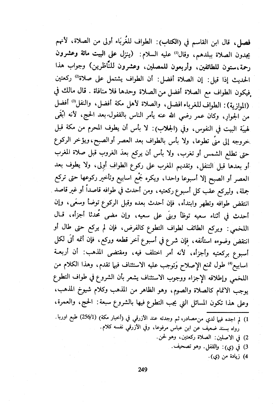 فَصْلٌ قَالَ ابْنُ الْقَاسِمِ فِي الْكِتَابِ الطَّوَافُ لِلْغُرَبَاءِ أَوْلَى مِنَ الصَّلَاةِ لِأَنَّهُمْ يَجِدُونَ الصَّلَاةَ ببلدهم وَقَالَ - صَلَّى اللَّهُ عَلَيْهِ وَسَلَّم َ -