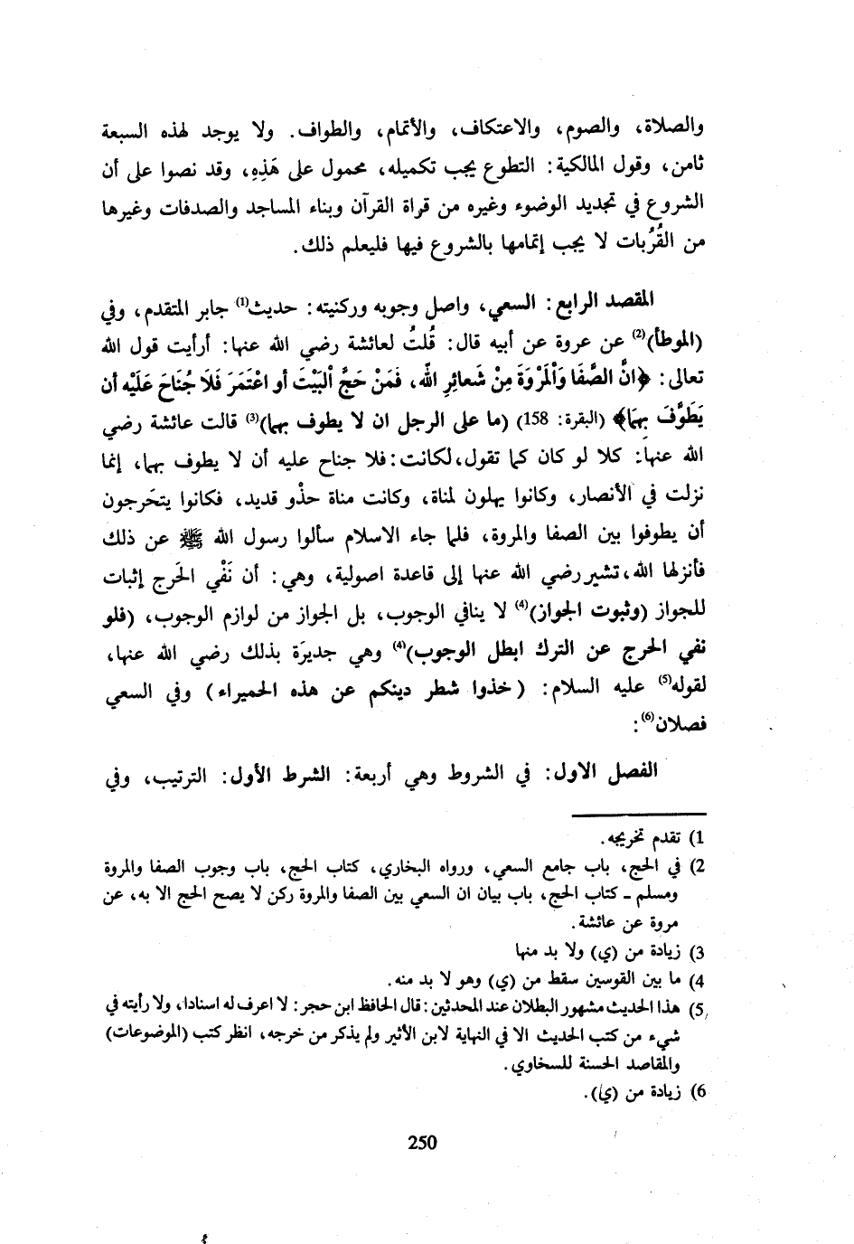 وَالصَّلَاةُ وَالصَّوْمُ وَالِاعْتِكَافُ وَالْإِتْمَامُ وَالطَّوَافُ وَلَا يُوجَدُ لهَذِهِ السَّبْعَة ثَمَان وَقَوْلُ الْمَالِكِيَّةِ التَّطَوُّعُ يَجِبُ تَكْمِيلُهُ مَحْمُولٌ عَلَى هَذِهِ وَقَدْ نَصُّوا عَلَى أَنَّ الشُّرُوعَ فِي تَجْدِيد الْوضُوء وَغَيره من قرأة الْقُرْآن وَبِنَاء الْمَسَاجِد والصدفات وَغَيْرِهَا مِنَ الْقُرُبَاتِ لَا يَجِبُ إِتْمَامُهَا بِالشُّرُوعِ فِيهَا فَليعلم ذَلِك الْمَقْصد الرَّابِع السَّعْي وَاصل وُجُوبه وركنيته حَدِيث جَابر الْمُتَقَدّم فِي الْمُوَطَّأِ عَنْ عُرْوَةَ عَنْ أَبِيهِ قَالَ قُلْتُ لِعَائِشَةَ رَضِيَ اللَّهُ عَنْهَا أَرَأَيْتِ قَوْلَ اللَّهِ تَعَالَى {إِنَّ الصَّفَا وَالْمَرْوَةَ مِنْ شَعَائِرِ اللَّهِ فَمَنْ حَجَّ الْبَيْتَ أَوِ اعْتَمَرَ فَلا جُنَاحَ عَلَيْهِ أَن يطوف بهما} الْبَقَرَة 158 وَمَا عَلَى الرَّجُلِ أَنْ لَا يَطَّوَّفَ بِهِمَا قَالَتْ عَائِشَةُ رَضِيَ اللَّهُ عَنْهَا كَلَّا لَوْ كَانَ كَمَا تَقُولُ لَكَانَتْ فَلَا جَنَاحَ عَلَيْهِ أَنْ لَا يَطَّوَّفَ بِهِمَا إِنَّمَا نَزَلَتْ فِي الْأَنْصَارِ وَكَانُوا يُهِلُّونَ لِمَنَاةَ وَكَانَتْ مَنَاةُ حَذْوَ قُدَيْدٍ وَكَانُوا يَتَحَرَّجُونَ أَنْ يَطَّوَّفُوا بَيْنَ الصَّفَا وَالْمَرْوَةِ فَلَمَّا جَاءَ الْإِسْلَامُ سَأَلُوا رَسُولَ اللَّهِ - صَلَّى اللَّهُ عَلَيْهِ وَسَلَّم َ - عَنْ ذَلِكَ فَأَنْزَلَهَا اللَّهُ تُشِيرُ رَضِيَ اللَّهُ عَنْهَا إِلَى قَاعِدَةٍ أُصُولِيَّةٍ وَهِيَ أَنَّ نَفْيَ الْحَرَجِ إِثْبَاتٌ لِلْجَوَازِ وَثُبُوتُ الْجَوَازِ لَا يُنَافِي الْوُجُوبَ بَلِ الْجَوَازُ مَعَ لَوَازِمِ الْوُجُوبِ فَلَوْ نُفِيَ الْحَرَجُ عَنِ التَّرْكِ أُبْطِلَ الْوُجُوبُ وَهِيَ جديرة بذلك رَضِي الله عَنْهَا لقَوْله - صَلَّى اللَّهُ عَلَيْهِ وَسَلَّم َ -