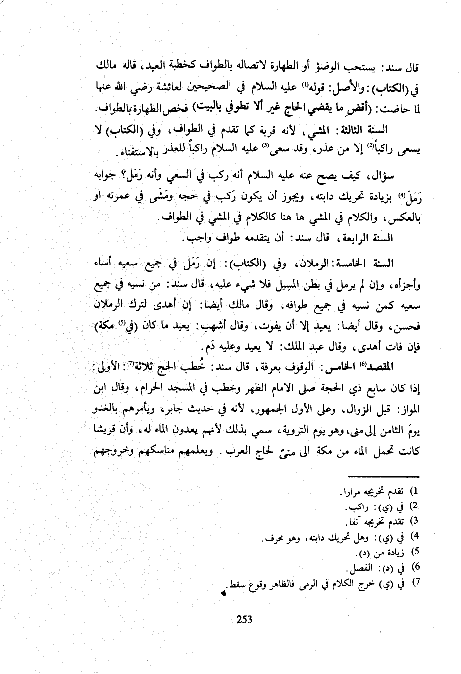 أقض مَا يَقْضِي الْحَاجُّ غَيْرَ أَلَّا تَطُوفِي بِالْبَيْتِ فَخَصَّ الطَّهَارَةَ بِالطَّوَافِ السُّنَّةُ الثَّالِثَةُ الْمَشْيُ لِأَنَّهُ قُرْبَةٌ كَمَا تَقَدَّمَ فِي الطَّوَافِ وَفِي الْكِتَابِ لَا يَسْعَى رَاكِبًا إِلَّا مِنْ عُذْرٍ وَقَدْ سعى - صَلَّى اللَّهُ عَلَيْهِ وَسَلَّم َ - رَاكِبًا لِلْعُذْرِ بِالِاسْتِفْتَاءِ سُؤَالٌ كَيْفَ يَصِحُّ عَنْهُ - صَلَّى اللَّهُ عَلَيْهِ وَسَلَّم َ - أَنَّهُ رَكِبَ فِي السَّعْيِ وَأَنَّهُ رَمَلَ جَوَابُهُ رَمَلَ بِزِيَادَةِ تَحْرِيكِ دَابَّتِهِ وَيَجُوزُ أَنْ يَكُونَ رَاكب فِي حَجِّهِ وَمَشَى فِي عُمْرَتِهِ أَوْ بِالْعَكْسِ وَالْكَلَام فِي الْمَشْي هَا هُنَا كَالْكَلَامِ فِي الْمَشْيِ فِي الطَّوَافِ السُّنَّةُ الرَّابِعَةُ قَالَ سَنَدٌ أَنْ يَتَقَدَّمَهُ طَوَافٌ وَاجِبٌ السُّنَّةُ الْخَامِسَةُ الرَّمَلَانُ وَفِي الْكِتَابِ إِنْ رَمَلَ فِي جَمِيعِ سَعْيِهِ أَسَاءَ وَأَجْزَأَهُ وَإِنْ لَمْ يَرْمُلْ فِي بَطْنِ الْمَسِيلِ فَلَا شَيْءَ عَلَيْهِ قَالَ سَنَد فِي نَسيَه من جَمِيع سَعْيه كمن نَسيَه فِي جمع طَوَافِهِ وَقَالَ مَالِكٌ أَيْضًا إِنْ أَهْدَى لِتَرْكِ الرَّمَلَانِ فَحَسَنٌ وَقَالَ أَيْضًا يُعِيدُ إِلَّا أَنْ يَفُوتَ وَقَالَ أَشْهَبُ يُعِيدُ مَا كَانَ فِي مَكَّةَ فَإِنْ فَاتَ أَهْدَى وَقَالَ عَبْدُ الْمَلِكِ لَا يُعِيدُ وَعَلَيْهِ دَمٌ الْمَقْصِدُ الْخَامِسُ الْوُقُوفُ بِعَرَفَةَ قَالَ سَنَدٌ خُطَبُ الْحَجِّ ثَلَاثَةٌ الْأُولَى إِذَا كَانَ سَابِعُ ذِي الْحِجَّةِ صَلَّى الْإِمَامُ الظُّهْرَ وَخَطَبَ فِي الْمَسْجِدِ الْحَرَامِ وَقَالَ ابْنُ الْمَوَّازِ قَبْلَ الزَّوَالِ وَعَلَى الْأَوَّلِ الْجُمْهُورُ لِأَنَّهُ فِي حَدِيثِ جَابِرٍ وَيَأْمُرُهُمْ بِالْغُدُوِّ يَوْمَ الثَّامِنِ إِلَى مِنًى وَهُوَ يَوْمُ التَّرْوِيَةِ سُمِّيَ بِذَلِكَ لِأَنَّهُمْ يُعِدُّونَ الْمَاءَ لَهُ وَأَنَّ قُرَيْشًا كَانَتْ تَحْمِلُ الْمَاءَ مِنْ مَكَّةَ إِلَى مِنًى لِحَاجِّ الْعَرَبِ وَيُعَلِّمُهُمْ مَنَاسِكَهُمْ وَخُرُوجَهُمْ