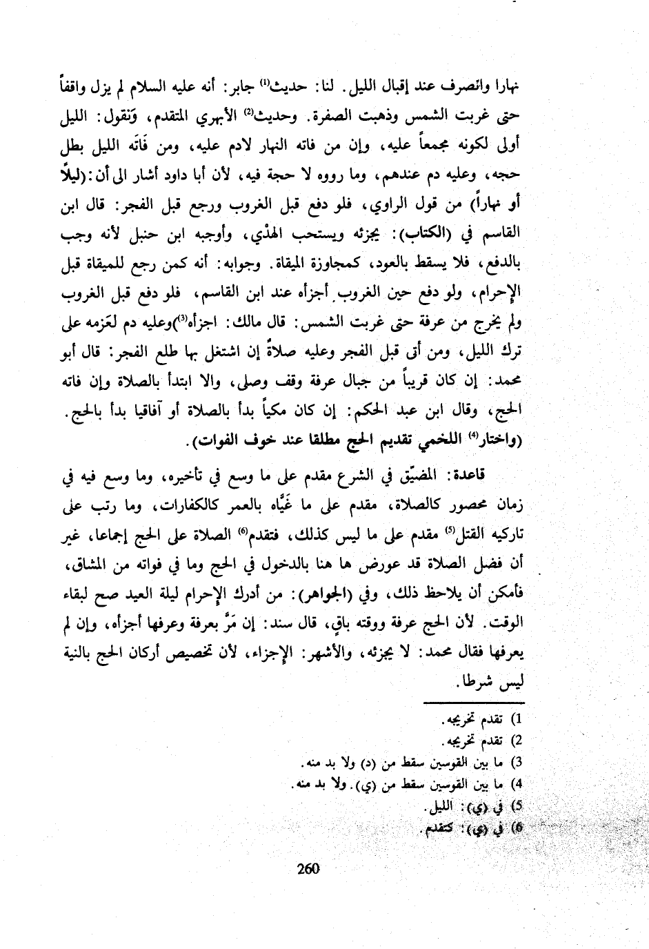 نَهَارًا وَانْصَرَفَ عِنْدَ إِقْبَالِ اللَّيْلِ لَنَا حَدِيثُ جَابر أَنه - صَلَّى اللَّهُ عَلَيْهِ وَسَلَّم َ - لَمْ يَزَلْ وَاقِفًا حَتَّى غَرَبَتِ الشَّمْسُ وَذَهَبَتِ الصُّفْرَةُ وَحَدِيثُ الْأَبْهَرِيِّ الْمُتَقَدِّمُ وَنَقُولُ اللَّيْلُ أَوْلَى لكَونه مجمعا عَلَيْهِ وَإِن من فَاتَهُ اللَّيْل بَطل حجه وَعَلِيهِ دم وَعِنْدهم وَمَا رَوَوْهُ لَا حُجَّةَ فِيهِ لِأَنَّ أَبَا دَاوُدَ أَشَارَ إِلَى أَنَّ لَيْلًا أَوْ نَهَارًا مِنْ قَوْلِ الرَّاوِي فَلَوْ دَفَعَ قَبْلَ الْغُرُوبِ وَرَجَعَ قَبْلَ الْفَجْرِ قَالَ ابْنُ الْقَاسِمِ فِي الْكِتَابِ يُجْزِئُهُ وَيُسْتَحَبُّ الْهَدْيُ وَأَوْجَبَهُ ابْنُ حَنْبَلٍ لِأَنَّهُ وَجَبَ بِالدَّفْعِ فَلَا يَسْقُطُ بِالْعَوْدِ كَمُجَاوَزَةِ المقياة وَجَوَابه أَنه كمن رَجَعَ للميقاة قَبْلَ الْإِحْرَامِ وَلَوْ دَفَعَ حِينَ الْغُرُوبِ أَجْزَأَهُ عِنْدَ ابْنِ الْقَاسِمِ فَلَوْ دَفَعَ قَبْلَ الْغُرُوبِ وَلَمْ يَخْرُجْ مِنْ عَرَفَةَ حَتَّى غَرَبَتِ الشَّمْسُ قَالَ مَالِكٌ أَجْزَأَهُ وَعَلَيْهِ دَمٌ لِعَزْمِهِ عَلَى تَرْكِ اللَّيْلِ وَمَنْ أَتَى قَبْلَ الْفَجْرِ وَعَلَيْهِ صَلَاةٌ إِنِ اشْتَغَلَ بِهَا طَلَعَ الْفَجْرُ قَالَ أَبُو مُحَمَّدٍ إِنْ كَانَ قَرِيبًا مِنْ جِبَالِ عَرَفَةَ وَقَفَ وَصَلَّى وَإِلَّا ابْتَدَأَ بِالصَّلَاةِ وَإِنْ فَاتَهُ الْحَجُّ وَقَالَ ابْنُ عَبْدِ الْحَكَمِ إِنْ كَانَ مَكِّيًّا بَدَأَ بِالصَّلَاةِ أَوْ آفَاقِيًّا بَدَأَ بِالْحَجِّ وَاخْتَارَ اللَّخْمِيُّ تَقْدِيمَ الْحَجِّ مُطْلَقًا عِنْدَ خَوْفِ الْفَوَاتِ قَاعِدَةٌ الْمُضَيَّقُ فِي الشَّرْعِ مُقَدَّمٌ عَلَى مَا وُسِّعَ فِي تَأْخِيرِهِ وَمَا وُسِّعَ فِيهِ فِي زَمَانٍ مَحْصُورٍ كَالصَّلَاةِ مُقَدَّمٌ عَلَى مَا غَيَّاهُ بِالْعُمُرِ كَالْكَفَّارَاتِ وَمَا رُتِّبَ عَلَى تَارِكِيهِ الْقَتْلُ مُقَدَّمٌ عَلَى مَا لَيْسَ كَذَلِكَ فَتُقَدَّمُ الصَّلَاةُ عَلَى الْحَجِّ إِجْمَاعًا غَيْرَ أَنَّ فضل الصَّلَاة قد عورض هَا هُنَا بِالدُّخُولِ فِي الْحَجِّ وَمَا فِي فَوَاتِهِ مِنَ الْمَشَاقِّ فَأَمْكَنَ أَنْ يُلَاحِظَ ذَلِكَ وَفِي الْجَوَاهِرِ مَنْ أَدْرَكَ الْإِحْرَامَ لَيْلَةَ الْعِيدِ صَحَّ لِبَقَاءِ الْوَقْتِ لِأَنَّ الْحَجَّ عَرَفَةُ وَوَقْتُهُ بَاقٍ قَالَ سَنَدٌ إِنْ مَرَّ بِعَرَفَةَ وَعَرَفَهَا أَجْزَأَهُ وَإِنْ لَمْ يَعْرِفْهَا فَقَالَ مُحَمَّدٌ لَا يُجْزِئُهُ وَالْأَشْهَرُ الْإِجْزَاءُ لِأَنَّ تَخْصِيصَ أَرْكَانِ الْحَجِّ بِالنِّيَّةِ لَيْسَ شرطا
