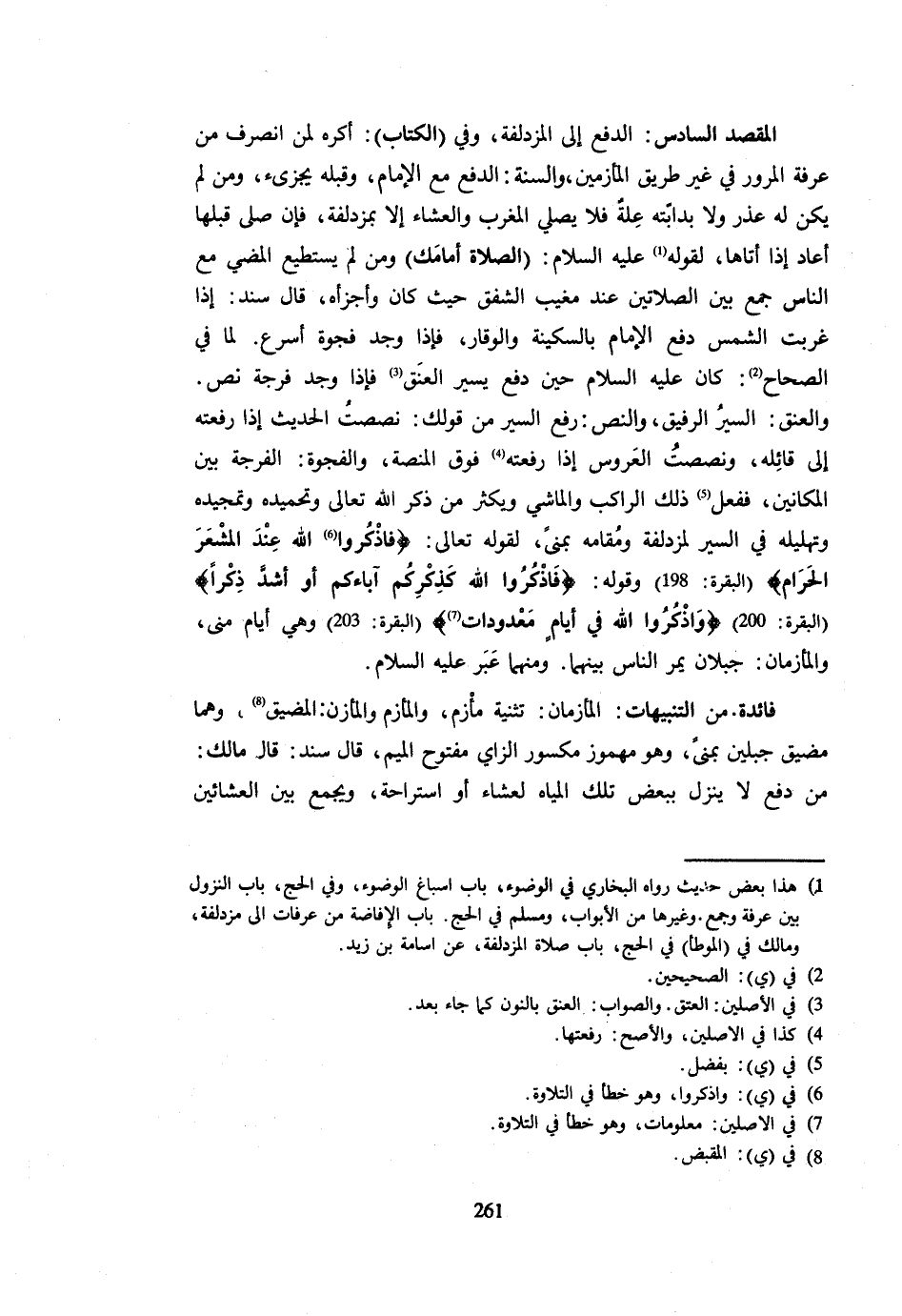 الْمَقْصِدُ السَّادِسُ الدَّفْعُ إِلَى الْمُزْدَلِفَةِ وَفِي الْكِتَابِ أَكْرَهُ لِمَنِ انْصَرَفَ مِنْ عَرَفَةَ الْمُرُورَ فِي غَيْرِ طَرِيقِ الْمَأْزِمَيْنِ وَالسُّنَّةُ الدَّفْعُ مَعَ الْإِمَامِ وَقَبْلَهُ يُجْزِئُ وَمَنْ لَمْ يَكُنْ لَهُ عُذْرٌ وَلَا بِدَابَّتِهِ عِلَّةٌ فَلَا يُصَلِّي الْمَغْرِبَ وَالْعَشَاءَ إِلَّا بِمُزْدَلِفَةَ فَإِنْ صَلَّى قَبْلَهَا أَعَادَ إِذَا أَتَاهَا لقَوْله - صَلَّى اللَّهُ عَلَيْهِ وَسَلَّم َ - الصَّلَاةُ أَمَامَكَ وَمَنْ لَمْ يَسْتَطِعِ الْمُضِيَّ مَعَ النَّاسِ جَمَعَ بَيْنَ الصَّلَاتَيْنِ عِنْدَ مَغِيبِ الشَّفَقِ حَيْثُ كَانَ وَأَجْزَأَهُ قَالَ سَنَدٌ إِذَا غَرَبَتِ الشَّمْسُ دَفَعَ الْإِمَامُ بِالسَّكِينَةِ وَالْوَقَارِ فَإِذَا وَجَدَ فجوة أسْرع لما فِي الصِّحَاح كَانَ - صَلَّى اللَّهُ عَلَيْهِ وَسَلَّم َ - حِينَ دَفَعَ يَسِيرُ الْعَنَقَ فَإِذَا وَجَدَ فُرْجَةً نَصَّ وَالْعَنَقُ السَّيْرُ الرَّفِيقُ وَالنَّصُّ رَفْعُ السَّيْرِ مِنْ قَوْلِكَ نَصَصْتُ الْحَدِيثَ إِذَا رَفَعْتُهُ إِلَى قَائِله ونصصت الْعَرُوس إِذا رفعتها فَوْقَ الْمِنَصَّةِ وَالْفَجْوَةُ الْفُرْجَةُ بَيْنَ الْمَكَانَيْنِ فَفَعَلَ ذَلِكَ الرَّاكِبُ وَالْمَاشِي وَيُكْثِرُ مِنْ ذِكْرِ اللَّهِ تَعَالَى وَتَحْمِيدِهِ وَتَمْجِيدِهِ وَتَهْلِيلِهِ فِي السَّيْرِ لِمُزْدَلِفَةَ ومقامة بمنى لقَوْله تَعَالَى {فماذكروا الله عِنْد الْمشعر الْحَرَام} الْبَقَرَة 198 وَقَوله {فَذكرُوا الله كذكركم أباءكم أَو أَشد ذكرا} الْبَقَرَة 200 {وَاذْكُرُوا اللَّهَ فِي أَيَّامٍ مَعْدُودَاتٍ} الْبَقَرَة 203 وَهِيَ أَيَّامُ مِنًى وَالْمَأْزِمَانِ جَبَلَانِ يَمُرُّ النَّاسُ بَيْنَهُمَا ومنهما عبر - صَلَّى اللَّهُ عَلَيْهِ وَسَلَّم َ - فَائِدَة من التَّنْبِيهَات المأزمان تَنْبِيه مَأْزِمٍ وَالْمَأْزِمُ وَالْمَأْزِنُ الْمَضِيقُ وَهُمَا مَضِيقُ جَبَلَيْنِ بِمِنًى وَهُوَ مَهْمُوزٌ مَكْسُورُ الزَّايِ مَفْتُوحُ الْمِيمِ قَالَ سَنَدٌ قَالَ مَالِكٌ مَنْ دَفَعَ لَا يَنْزِلُ بِبَعْضِ تِلْكَ الْمِيَاهِ لِعَشَاءٍ أَوِ اسْتِرَاحَةٍ وَيَجْمَعُ بَيْنَ الْعِشَائَيْنِ