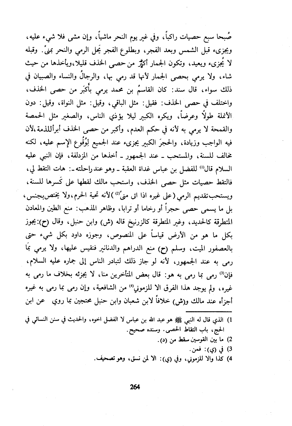 صُبْحًا سَبْعَ حَصَيَاتٍ رَاكِبًا وَفِي غَيْرِ يَوْمِ النَّحْرِ مَاشِيًا وَإِنْ مَشَى فَلَا شَيْءَ عَلَيْهِ ويجزيء قبل الشَّمْس ويعد الْفَجْرِ وَبِطُلُوعِ الْفَجْرِ يَحِلُّ الرَّمْيُ وَالنَّحْرُ بِمِنًى وَقَبله لَا يجزيء وَيُعِيدُ وَتَكُونُ الْجِمَارُ أَكْثَرَ مِنْ حَصَى الْخَذْفِ قَلِيلا وبأخذها مِنْ حَيْثُ شَاءَ وَلَا يَرْمِي بِحَصَى الْجِمَارِ لِأَنَّهَا قَدْ رُمِيَ بِهَا وَالرِّجَالُ وَالنِّسَاءُ وَالصِّبْيَانُ فِي ذَلِكَ سَوَاءٌ قَالَ سَنَدٌ كَانَ الْقَاسِمُ بْنُ مُحَمَّدٍ يَرْمِي بِأَكْبَرَ مِنْ حَصَى الْخَذْفِ وَاخْتلف فِي حَصى الْخذف فَقيل مثل الْبَاقِي وَقِيلَ مِثْلُ النَّوَاةِ وَقِيلَ دُونَ الْأُنْمُلَةِ طُولًا وعرضا وَيكرهُ الْكَبِير لَيْلًا يُؤْذِيَ النَّاسَ وَالصَّغِيرُ مِثْلُ الْحِمَّصَةِ وَالْقَمْحَةِ لَا يُرْمَى بِهِ لِأَنَّهُ فِي حُكْمِ الْعَدَمِ وَأَكْبَرُ مِنْ حَصَى الْخَذْفِ أَبْرَأُ لِلذِّمَّةِ لِأَنَّ فِيهِ الْوَاجِبَ وَزِيَادَةً وَالْحَجَرُ الْكَبِيرُ يُجْزِئُ عِنْدَ الْجَمِيعِ لِوُقُوعِ الِاسْمِ عَلَيْهِ لَكِنَّهُ مُخَالِفٌ لِلسُّنَّةِ وَالْمُسْتَحَبُّ عِنْدَ الْجُمْهُورِ أَخْذُهَا مِنَ الْمُزْدَلِفَةِ فَإِنَّ النَّبِيَّ - صَلَّى اللَّهُ عَلَيْهِ وَسَلَّم َ - قَالَ لِلْفَضْلِ بْنِ عَبَّاسٍ غَدَاةَ الْعَقَبَةِ وَهُوَ عِنْدُ رَاحِلَتِهِ هَاتِ الْتَقِطْ لِي فَالْتَقَطَ حَصَيَاتٍ مِثْلَ حَصَى الْخَذْفِ وَاسْتَحَبَّ مَالِكٌ لَقْطَهَا عَلَى كسرهَا للسّنة وَيسْتَحب تَقْدِيم الرَّمْي على غير إِذَا أَتَى مِنًى لِأَنَّهُ تَحِيَّةُ الْحَرَمِ وَلَا يخْتَص بِنَجس بَلْ مَا يُسَمَّى حَصًى حَجَرًا أَوْ رُخَامًا أَوْ تُرَابًا وَظَاهِرُ الْمَذْهَبِ مَنْعُ الطِّينِ وَالْمَعَادِنِ المتطرقة كالحديد وَغير المتطرقة كالزرنيخ قَالَ ش وَابْنُ حَنْبَلٍ وَقَالَ ح يَجُوزُ بِكُلِّ مَا هُوَ مِنَ الْأَرْضِ قِيَاسًا عَلَى الْمَنْصُوصِ عَلَيْهِ وَجَوَّزَهُ دَاوُدُ بِكُلِّ شَيْءٍ حَتَّى بِالْعُصْفُورِ الْمَيِّتِ وَسَلَّمَ ح مَنْعَ الدَّرَاهِمِ وَالدَّنَانِيرِ فَنَقِيسُ عَلَيْهَا وَلَا يُرْمَى بِمَا رُمِيَ بِهِ عِنْدَ الْجُمْهُورِ لِأَنَّهُ لَوْ جَازَ ذَلِكَ لَتَبَادَرَ النَّاسُ إِلَى جماره - صَلَّى اللَّهُ عَلَيْهِ وَسَلَّم َ - فَإِنْ رَمَى بِمَا رَمَى بِهِ هُوَ قَالَ بَعْضُ الْمُتَأَخِّرِينَ مِنَّا لَا يُجْزِئُهُ بِخِلَافِ مَا رَمَى بِهِ غَيْرُهُ وَلَمْ يَجِدْ هَذَا الْفَرْقَ إِلَّا للزموني مِنَ الشَّافِعِيَّةِ وَإِنْ رَمَى بِمَا رَمَى بِهِ غَيره أَجزَأَهُ عِنْد مَالك وش خِلَافًا لِابْنِ شَعْبَانَ وَابْنِ حَنْبَلٍ مُحْتَجِّينَ بِمَا رُوِيَ عَنِ ابْنِ