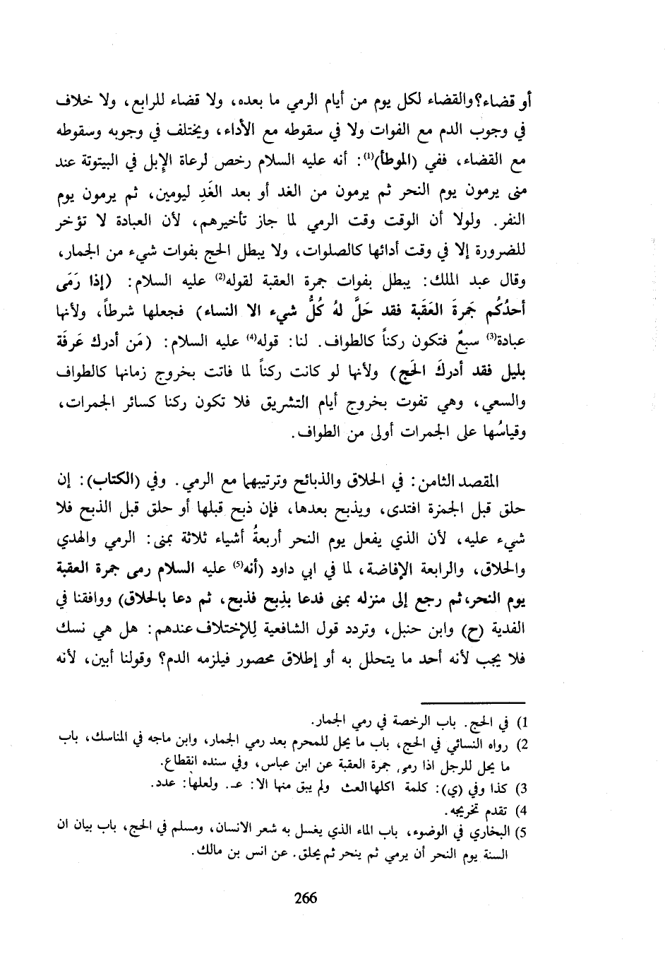أَوْ قَضَاءٌ وَالْقَضَاءُ لِكُلِّ يَوْمٍ مِنْ أَيَّامِ الرَّمْيِ مَا بَعْدَهُ وَلَا قَضَاءَ لِلرَّابِعِ وَلَا خِلَافَ فِي وُجُوبِ الدَّمِ مَعَ الْفَوَاتِ وَلَا فِي سُقُوطِهِ مَعَ الْأَدَاءِ وَيُخْتَلَفُ فِي وُجُوبِهِ وسقوطه مَعَ الْقَضَاء فَفِي الْمُوَطَّأ أَنه - صَلَّى اللَّهُ عَلَيْهِ وَسَلَّم َ - رَخَّصَ لِرُعَاةِ الْإِبِلِ فِي الْبَيْتُوتَةِ عِنْدَ مِنًى يَرْمُونَ يَوْمَ النَّحْرِ ثُمَّ يَرْمُونَ مِنَ الْغَدِ أَو بَعْدَ الْغَدِ لِيَوْمَيْنِ ثُمَّ يَرْمُونَ يَوْمَ النَّفْرِ وَلَوْلَا أَن الْوَقْت الرَّمْيِ لَمَا جَازَ تَأْخِيرُهُمْ لِأَنَّ الْعِبَادَةَ لَا تُؤَخَّرُ لِلضَّرُورَةِ إِلَّا فِي وَقْتِ أَدَائِهَا كَالصَّلَوَاتِ وَلَا يَبْطَلُ الْحَجُّ بِفَوَاتِ شَيْءٍ مِنَ الْجِمَارِ وَقَالَ عَبْدُ الْمَلِكِ يَبْطُلُ بِفَوَاتِ جَمْرَةِ الْعَقَبَةِ لقَوْله - صَلَّى اللَّهُ عَلَيْهِ وَسَلَّم َ - إِذَا رَمَى أَحَدُكُمْ جَمْرَةَ الْعَقَبَةِ فَقَدْ حَلَّ لَهُ كُلُّ شَيْءٍ إِلَّا النِّسَاءَ فَجَعَلَهَا شَرْطًا وَلِأَنَّهَا عِبَادَةُ سَبْعٍ فَتَكُونُ رُكْنًا كَالطَّوَافِ لَنَا